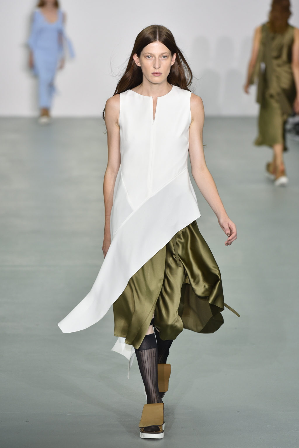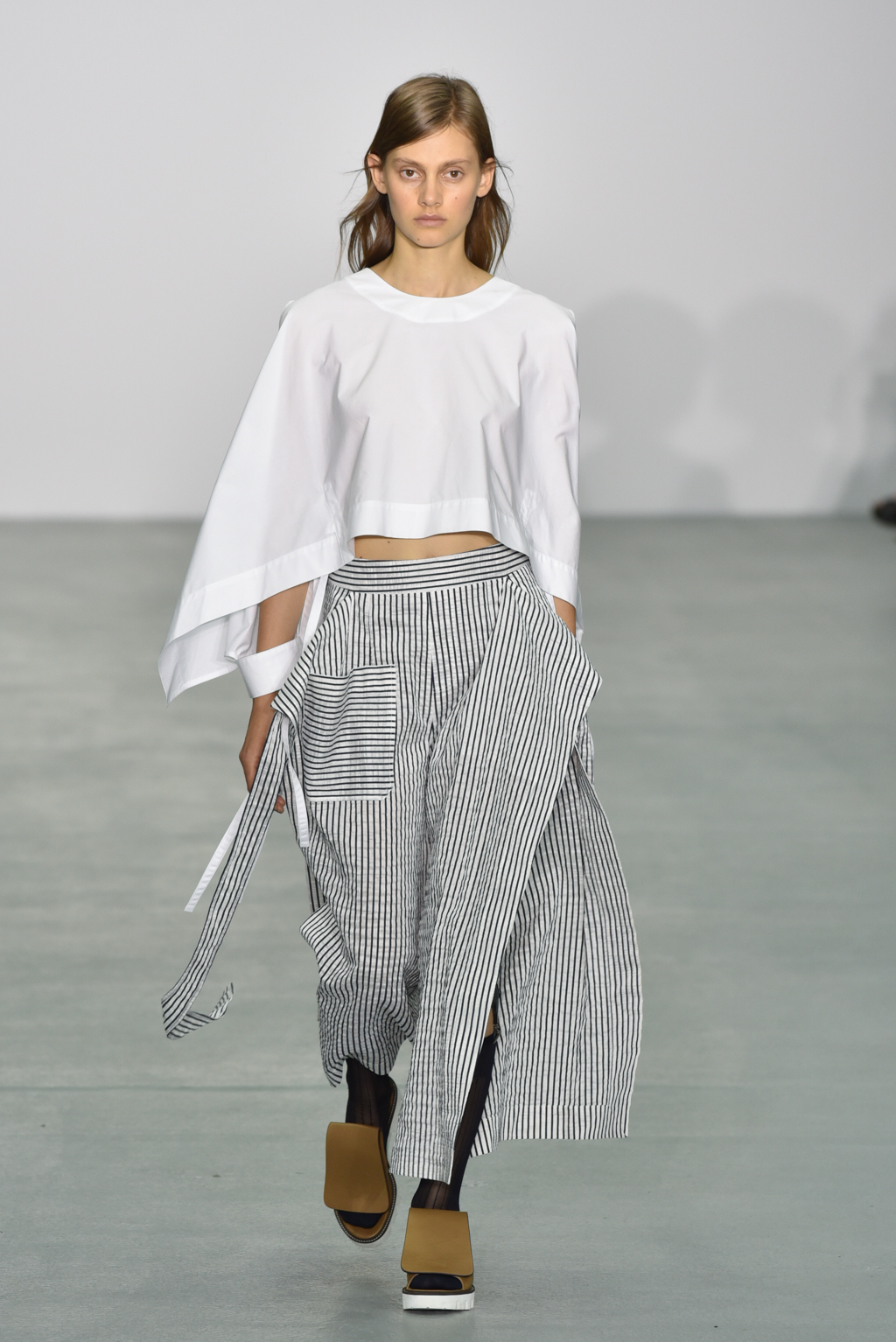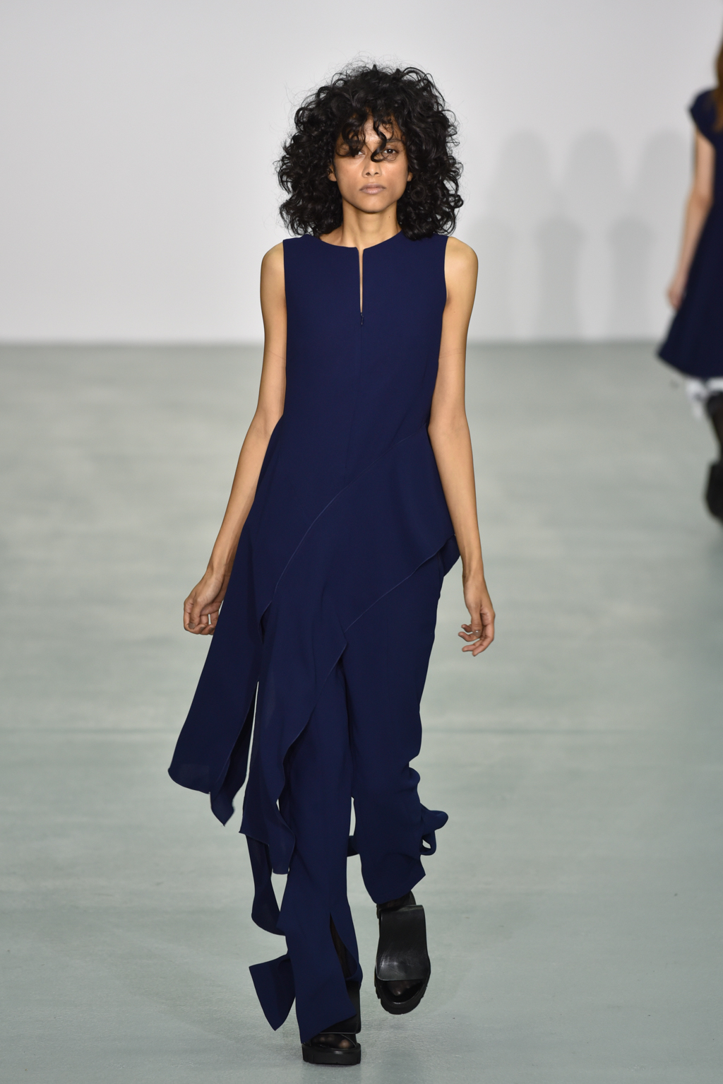 Since his LFW debut in 2012, Eudon Choi has made a name and label for himself by utilising his tailoring training in the womenswear sphere. His collections have historically deployed a small number of fabrics and prints to subvert our understanding of womenswear designs; unsurprisingly, his SS17 collection continues – but also extends – this trend. It seems SS17 for Choi is all about celebrating how fabrics fall on the wearer.
