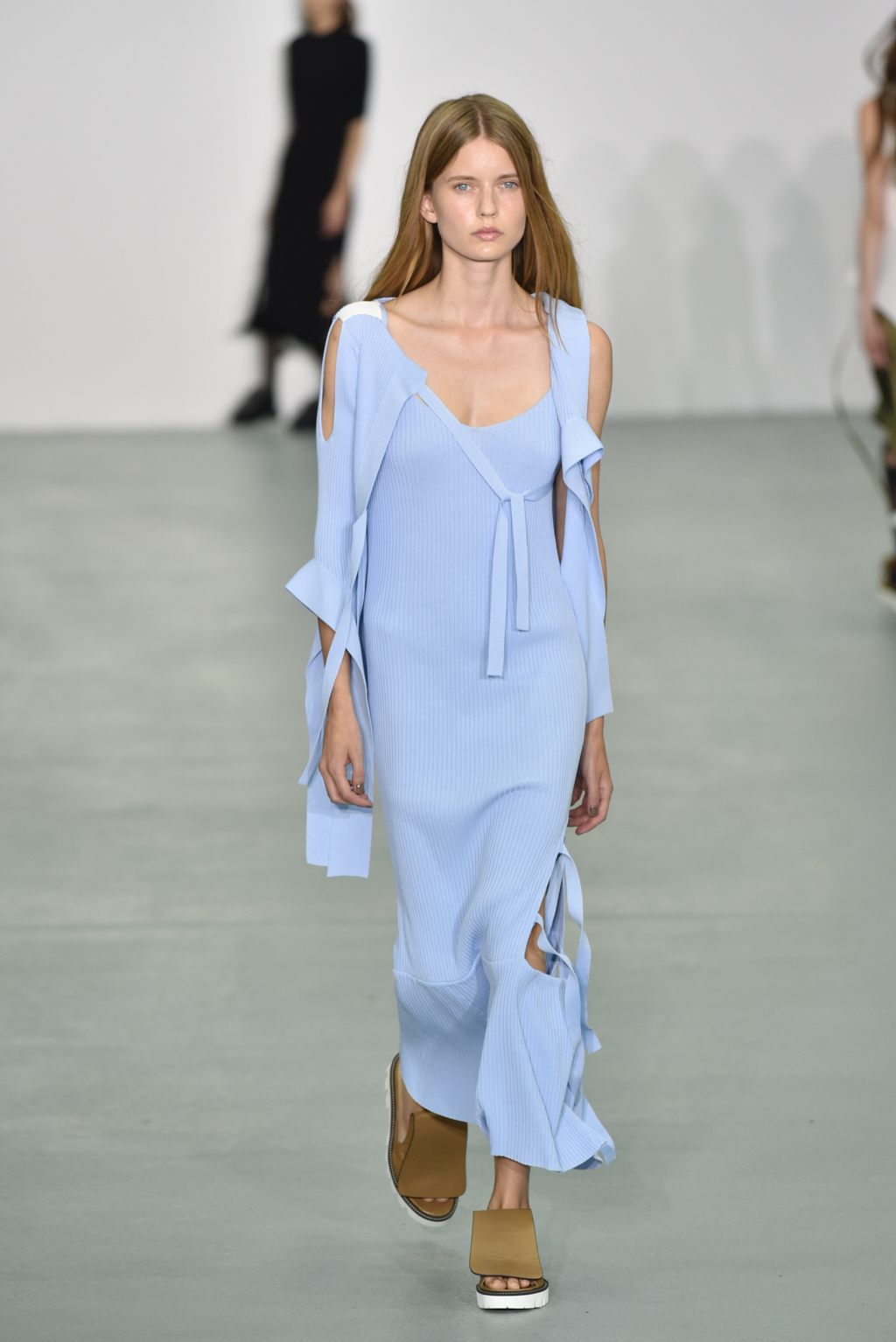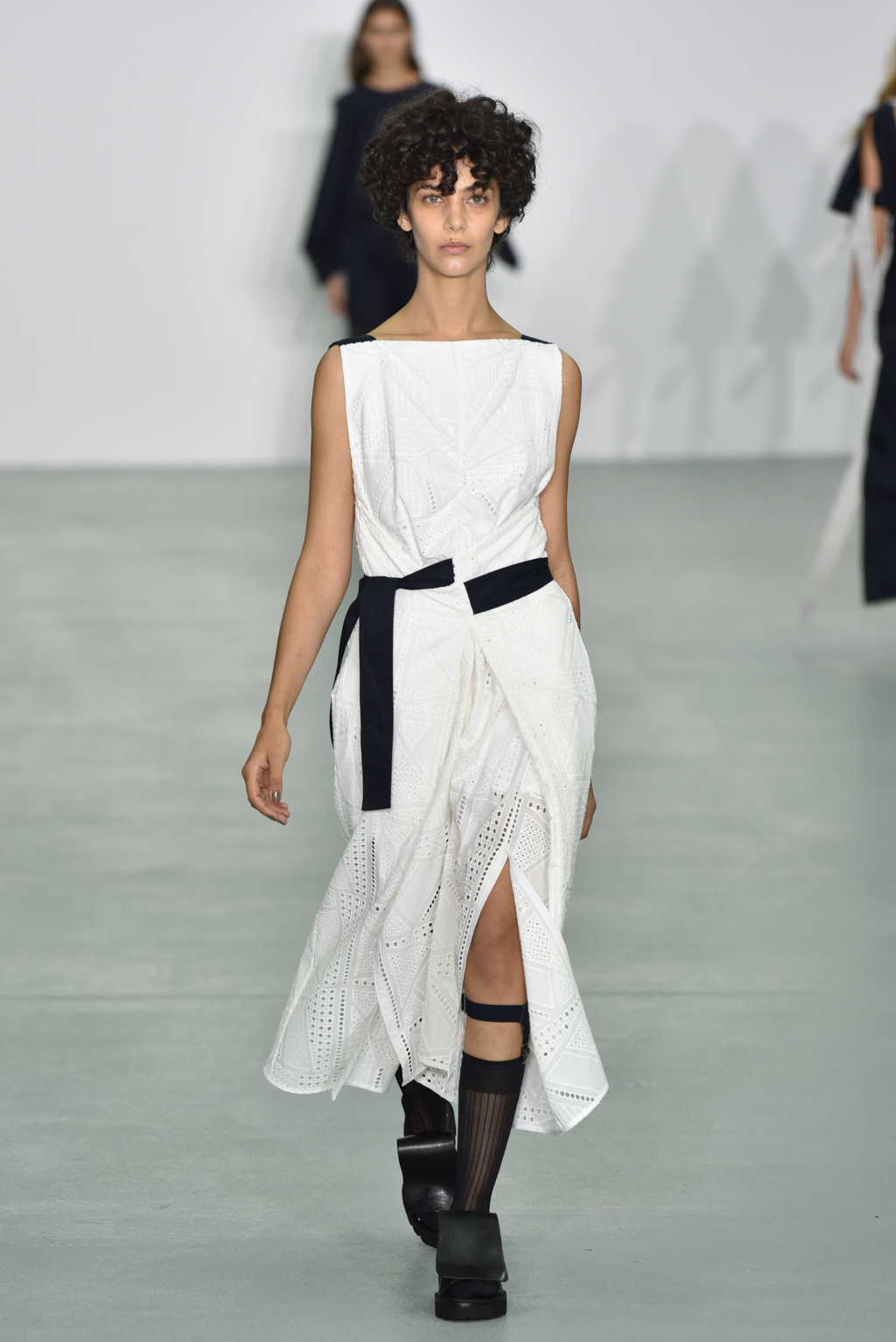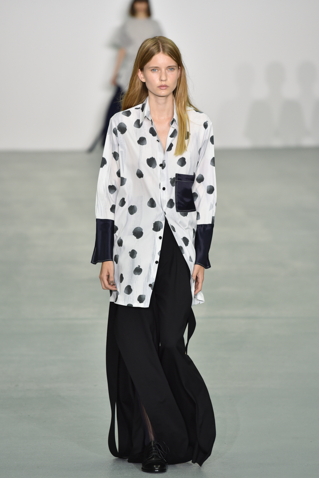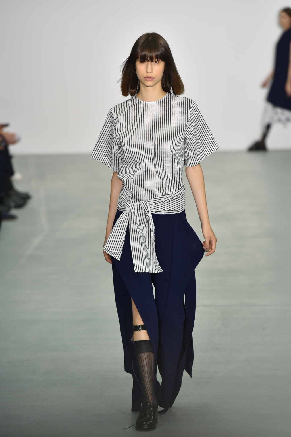Since his LFW debut in 2012, Eudon Choi has made a name and label for himself by utilising his tailoring training in the womenswear sphere. His collections have historically deployed a small number of fabrics and prints to subvert our understanding of womenswear designs; unsurprisingly, his SS17 collection continues – but also extends – this trend. It seems SS17 for Choi is all about celebrating how fabrics fall on the wearer.