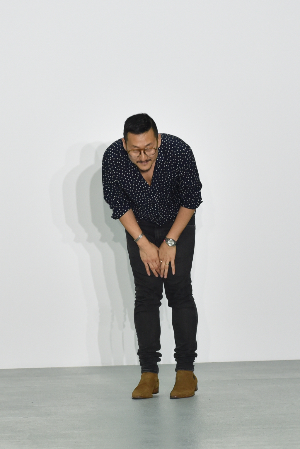 In his most experimental show to date, Choi showcased pieces that feature fabric embellishments where there is usually a lighter touch to a pattern and slits, creating a more fluid silhouette, where there is usually particular attention to tailoring a piece down. Models wore scoop-necked tunic tops with slits through the length of each sleeve, trousers with exquisite detail paid to the shape of a waistband but nonetheless slits cut through the length of each leg.