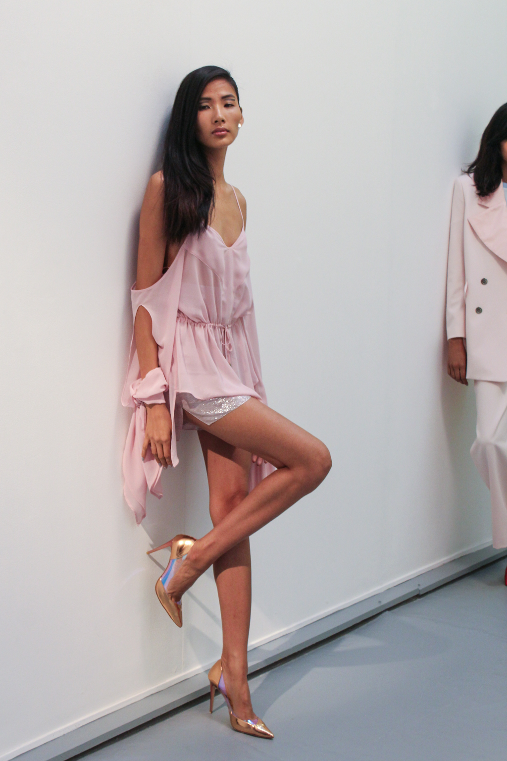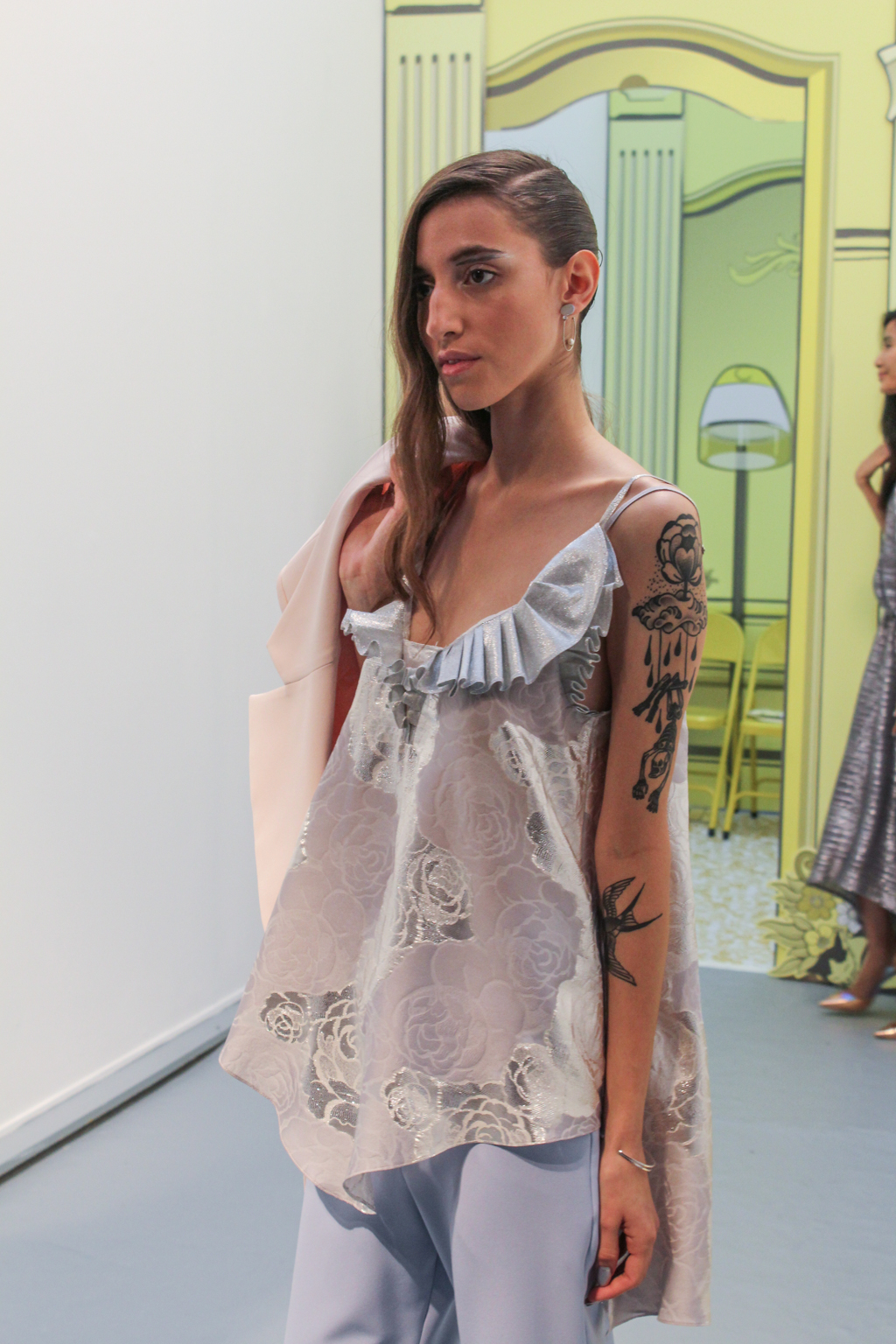 Although inspired by images of daytime beauty salons of the 70s and 80s, Gabriel Vielma’s SS17 collection celebrated disco glam in the form of metallics, pastels, silver lurex and white metallic jersey sequins on pants and dresses.