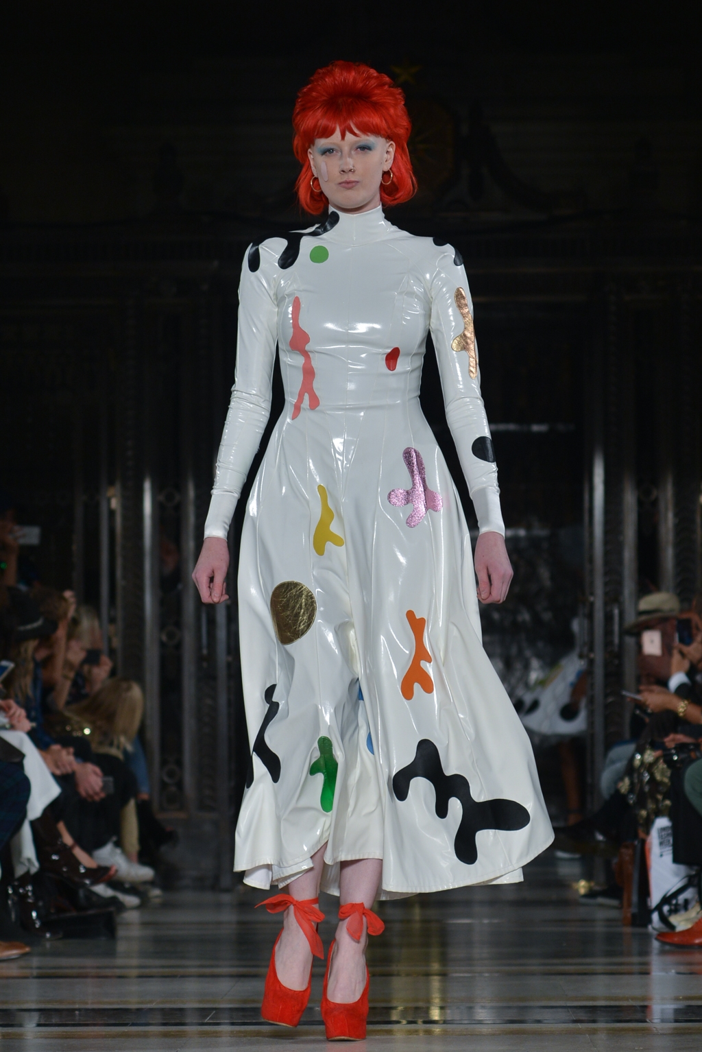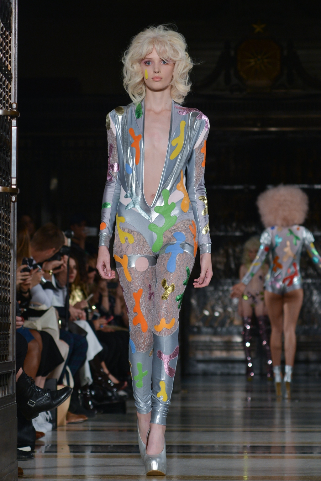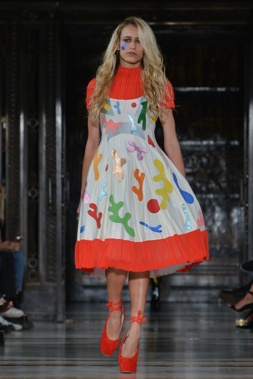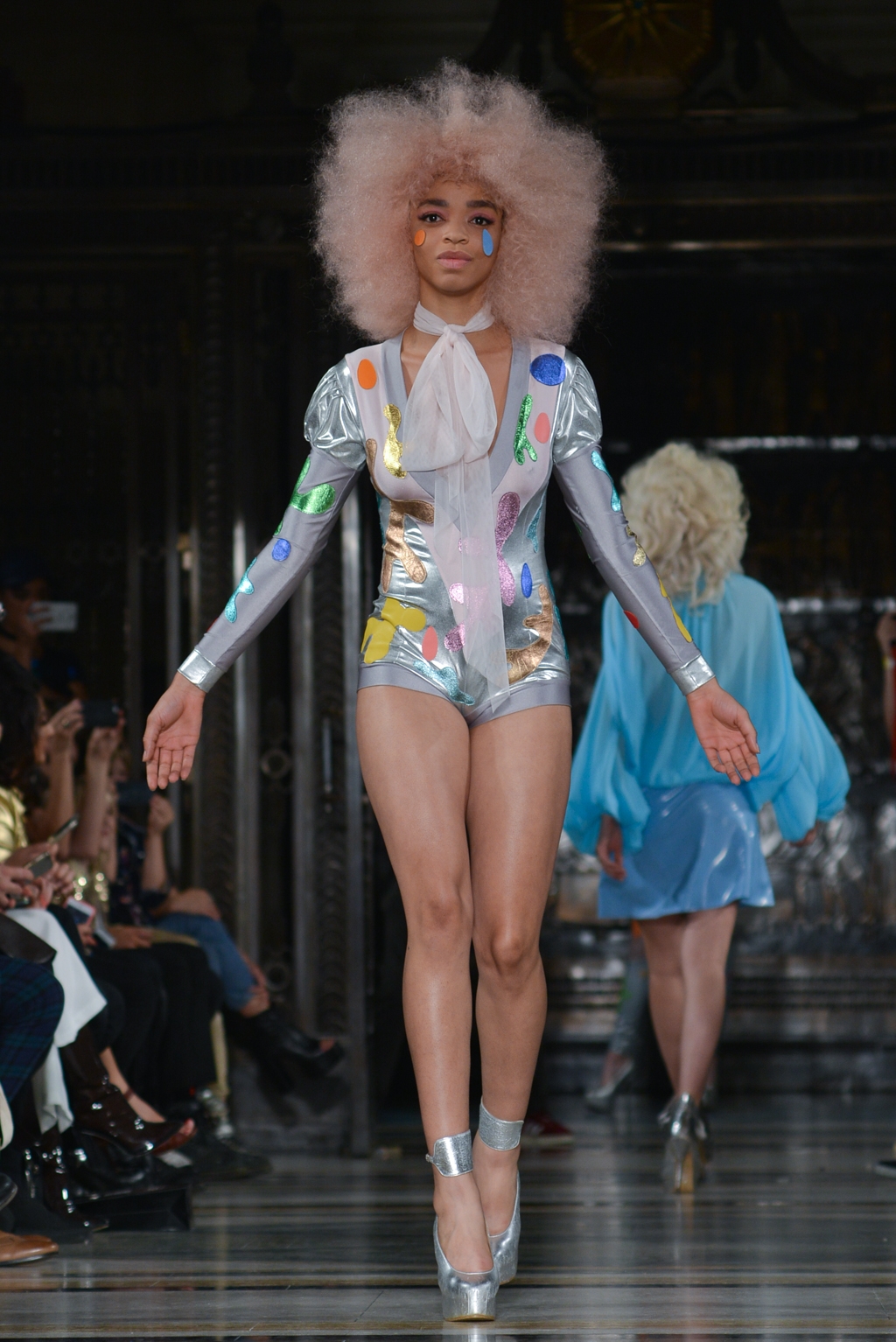 From this moment onwards, until the final minutes, catsuits were joined by full skirted dresses adorned with the same colourful, cartoon paint splatter pattern. One duck egg blue, puff sleeved dress was the conservative exception to a stream of otherwise backless halter neck designs.