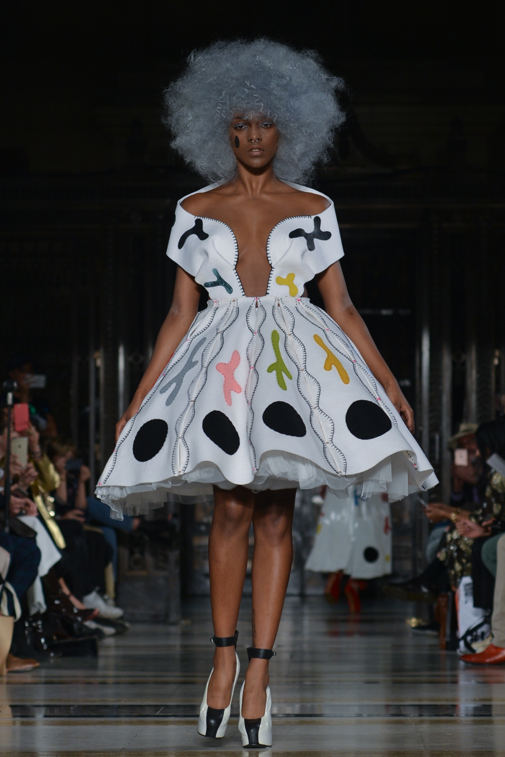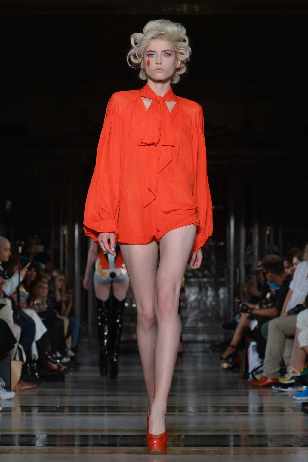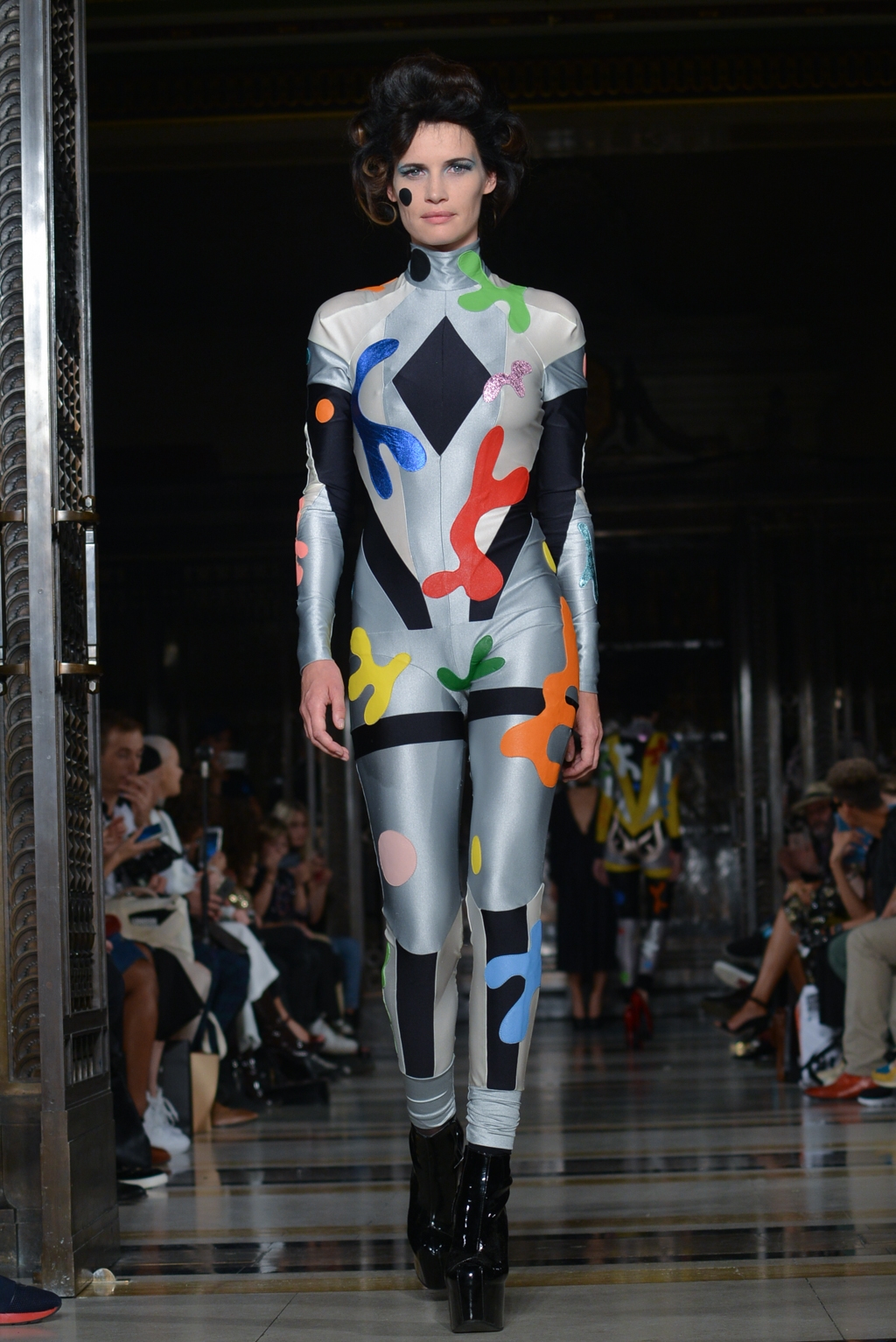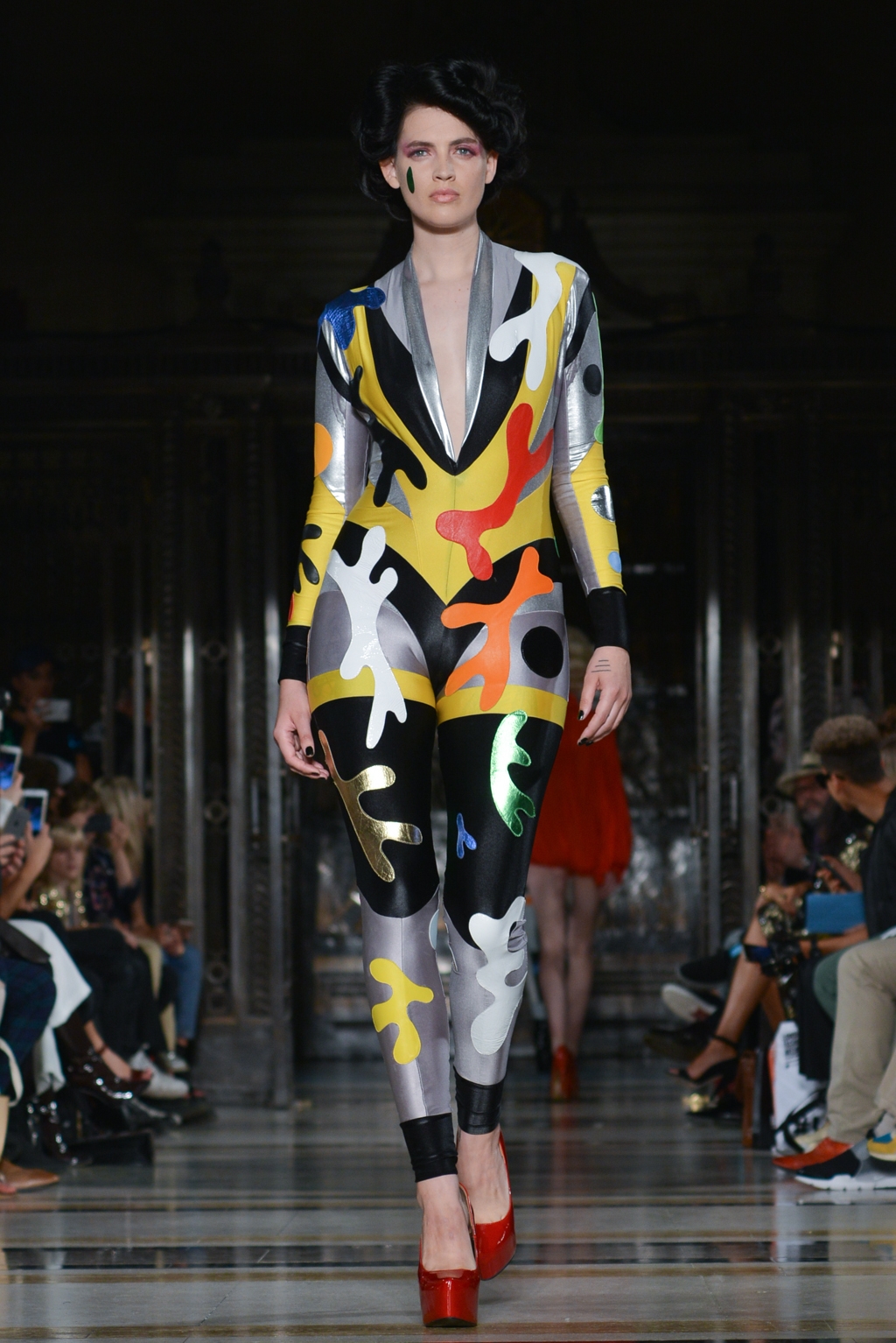 From this moment onwards, until the final minutes, catsuits were joined by full skirted dresses adorned with the same colourful, cartoon paint splatter pattern. One duck egg blue, puff sleeved dress was the conservative exception to a stream of otherwise backless halter neck designs.