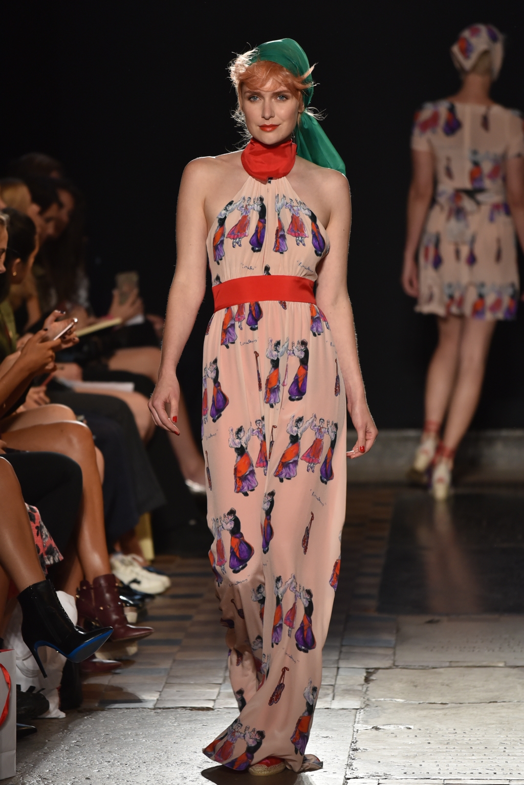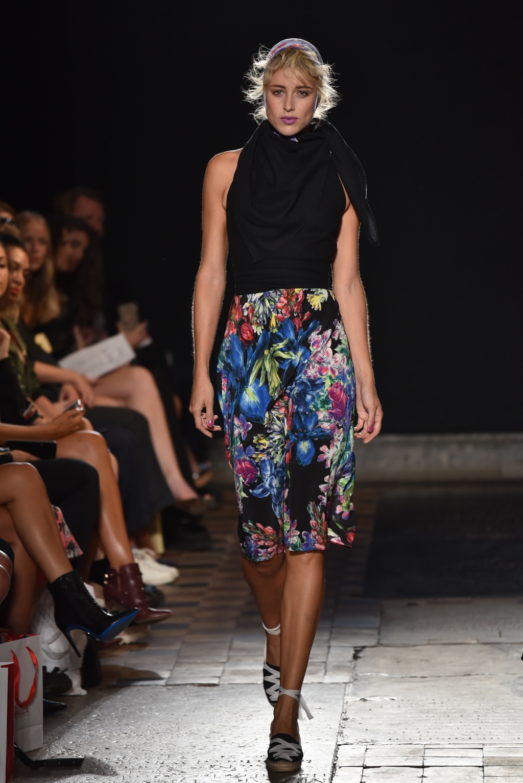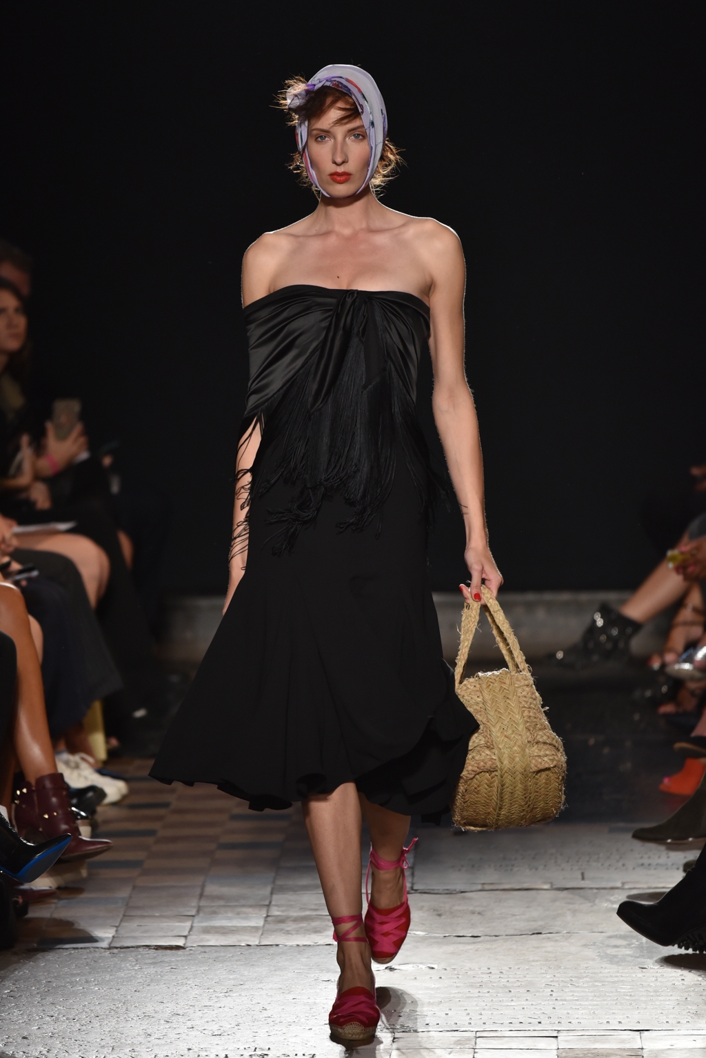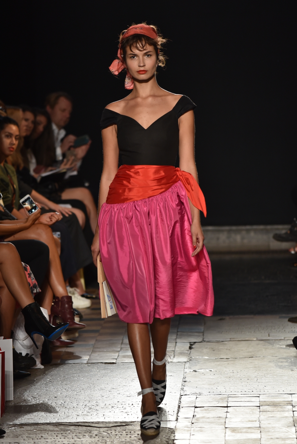 In jet black to contrast the vibrancy of the colour palette, a square of fabric bearing the words “La Fiesta” was tied at the neck as a cape, or perhaps around the waist as another layer. A high octane, joyful set of clothes perfectly suited to a sophisticated celebration on a hot Spanish evening.