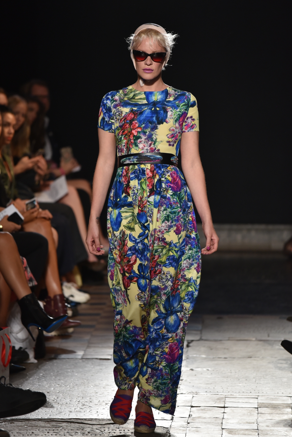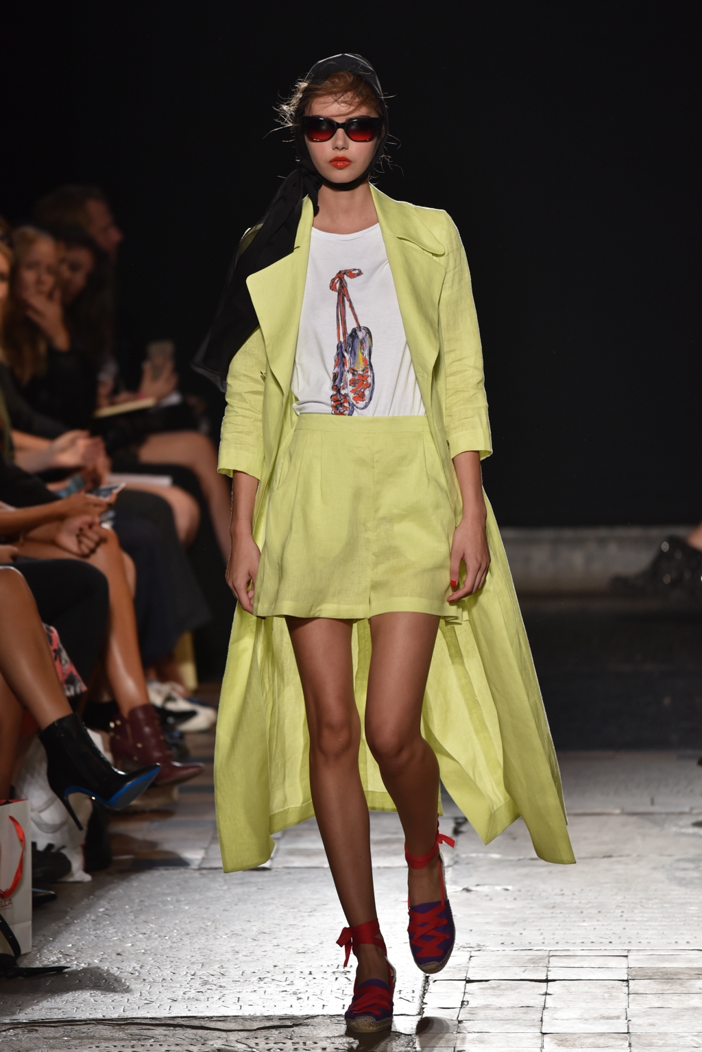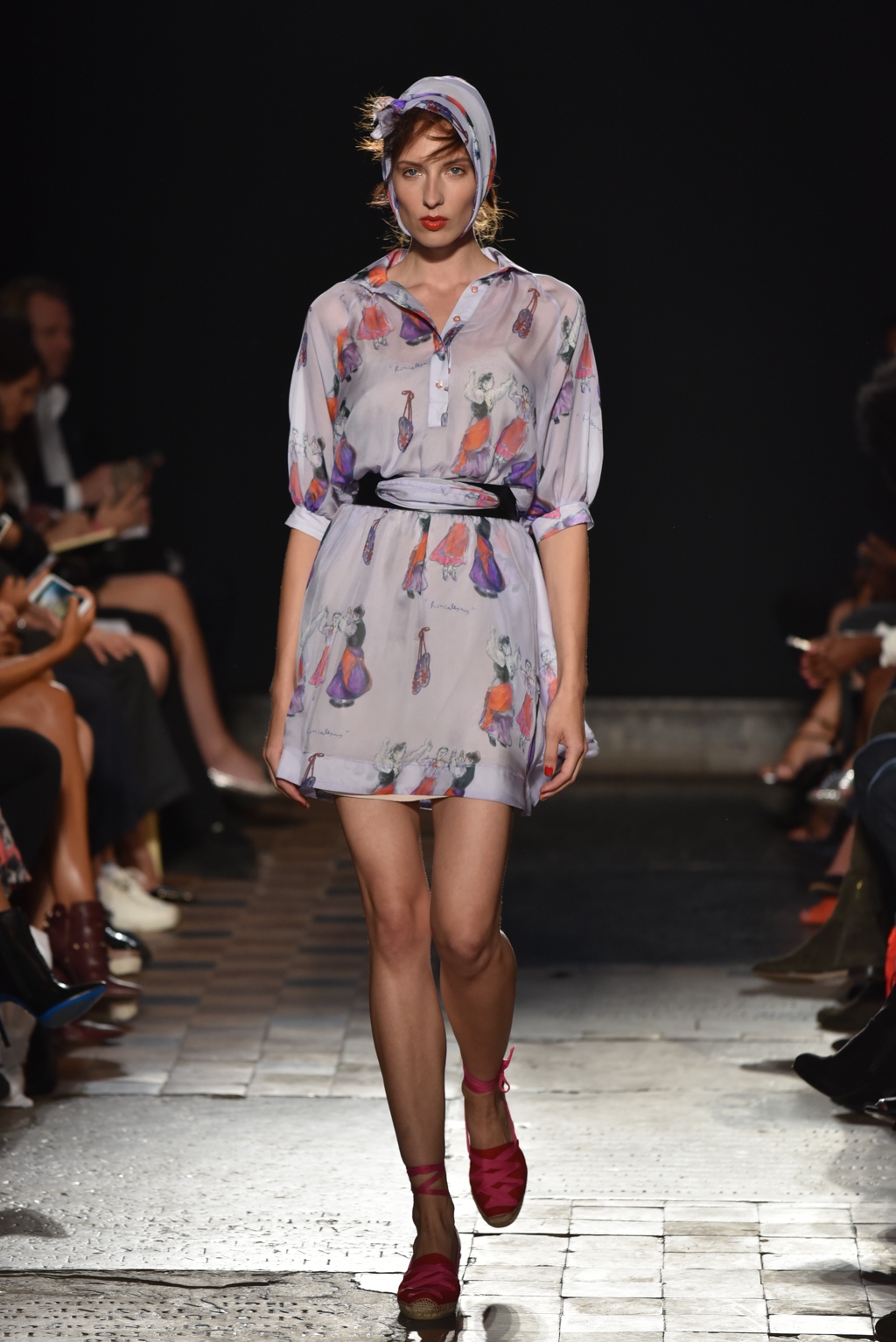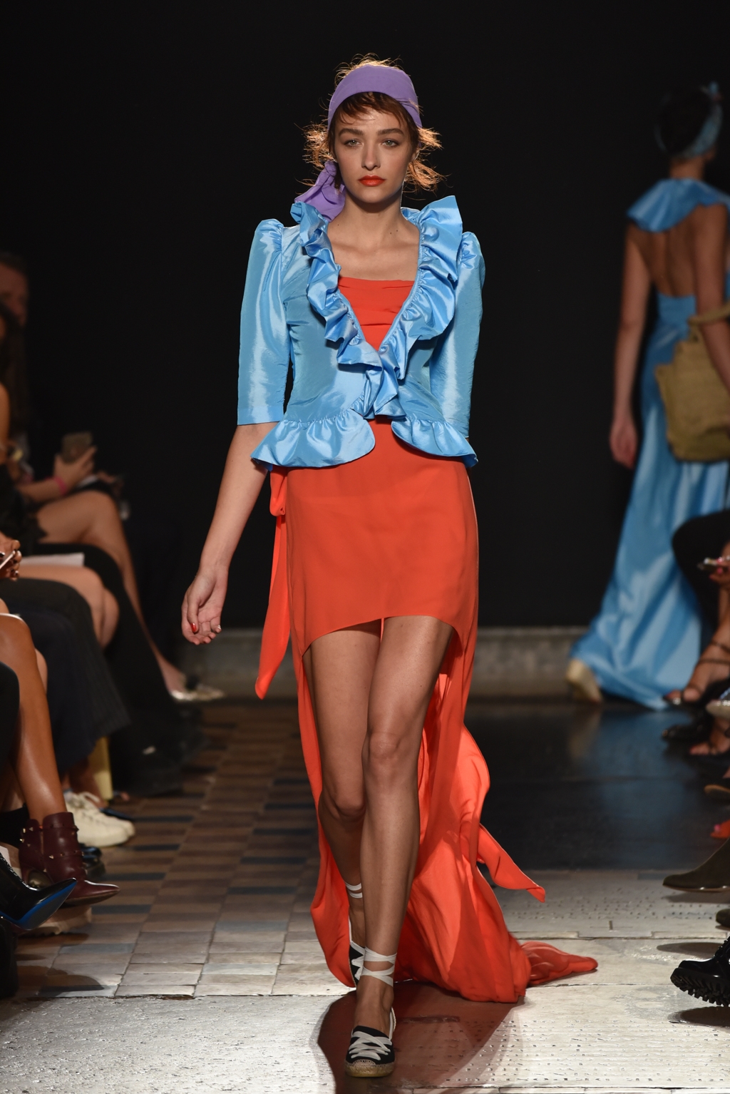 In jet black to contrast the vibrancy of the colour palette, a square of fabric bearing the words “La Fiesta” was tied at the neck as a cape, or perhaps around the waist as another layer. A high octane, joyful set of clothes perfectly suited to a sophisticated celebration on a hot Spanish evening.