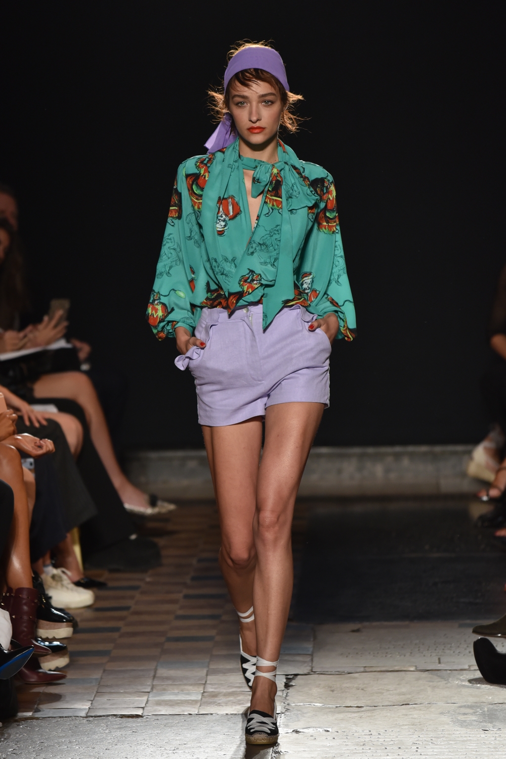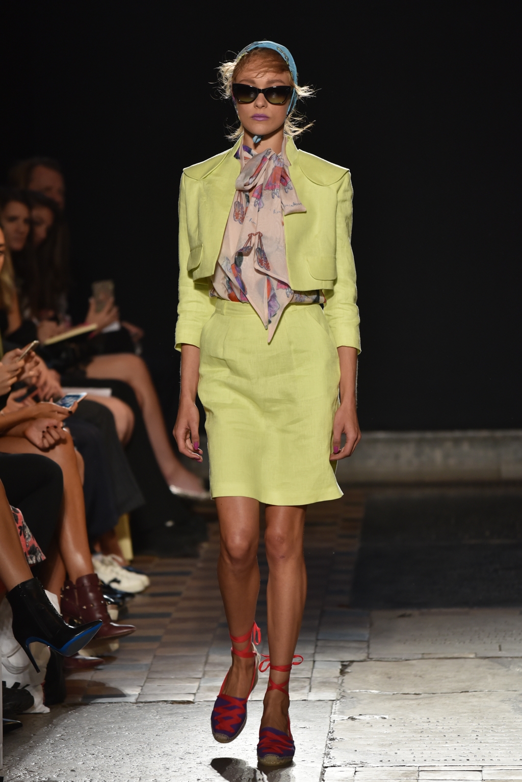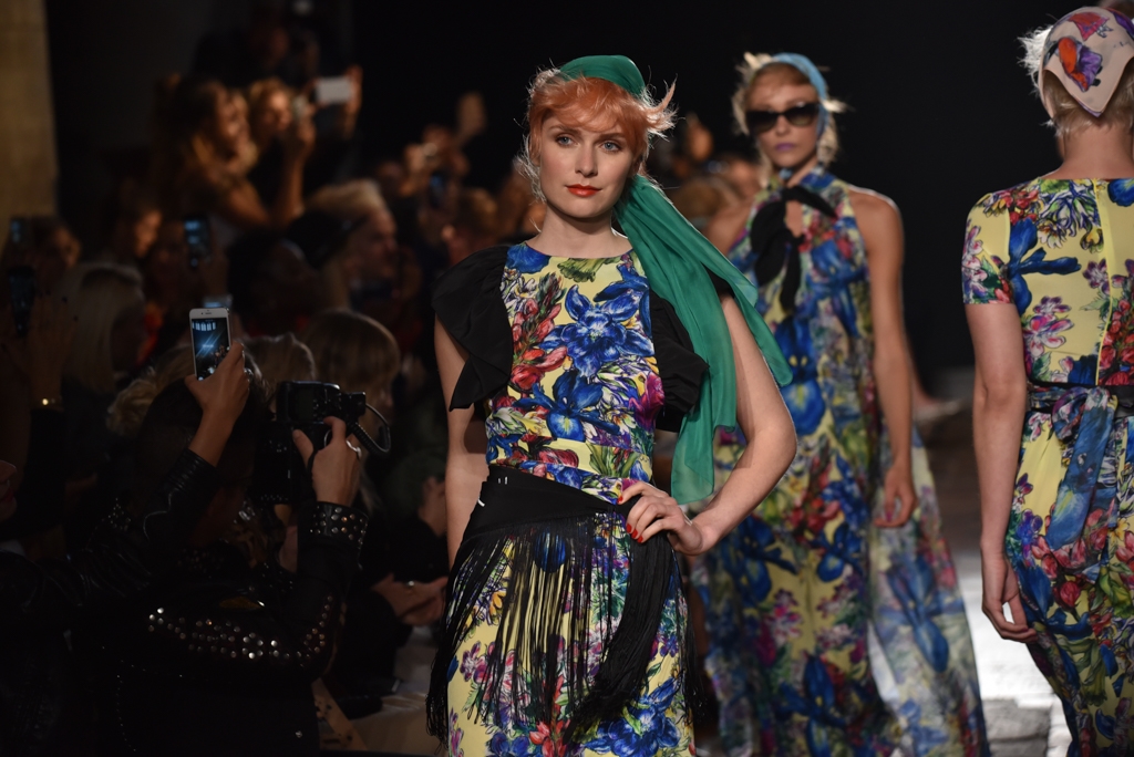 The vibrant jubilance of a Spanish fiesta permeated the entire collection; blouson blouses and tiered skirts glowed in fuchsia, lime and scarlet, whilst pastel-coloured taffeta scarves were wrapped around the hair or the waist for a hint of retro Mediterranean chic.
