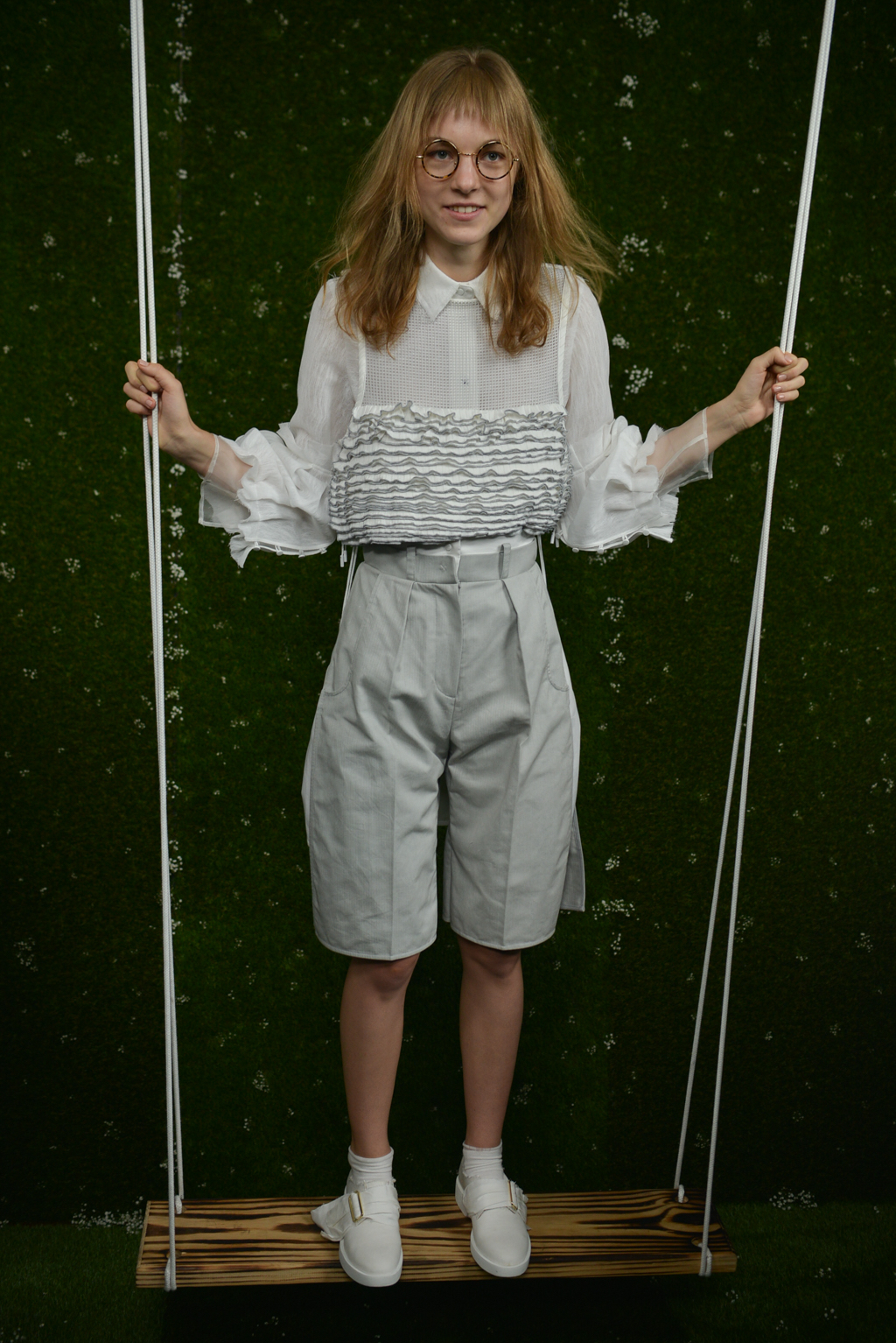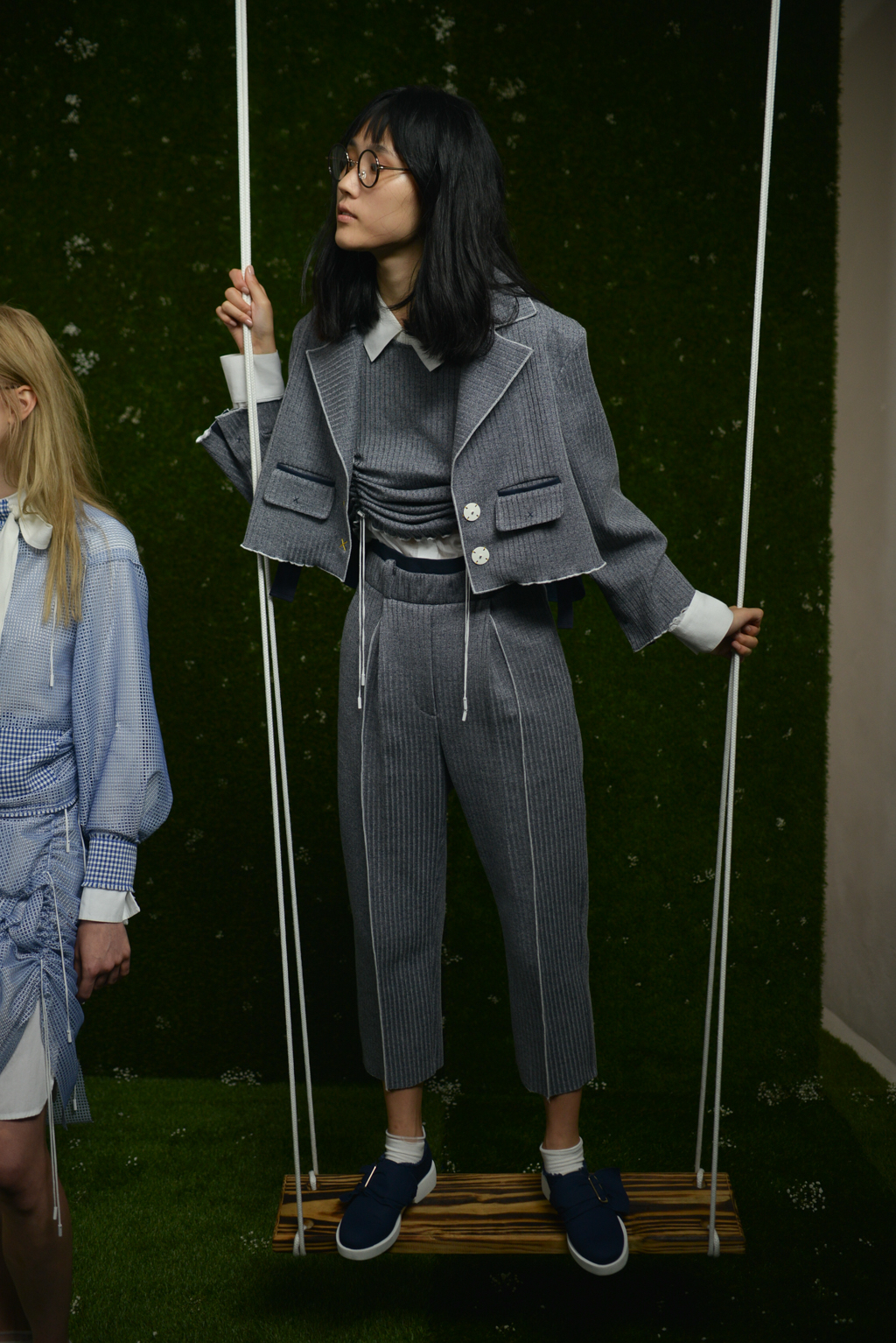 In the 15 minutes before his presentation kicked off in earnest, a joke between models captured perfectly the catchy, carefree feeling of Steven Tai’s SS17 collection. Guests to the presentation wandered through an artificial garden, strewn with painstakingly arranged baby’s breath and adorned with wooden standing swings, to admire the angular cuts and fabric combinations that make up Tai’s latest take on traditionally feminine silhouettes.