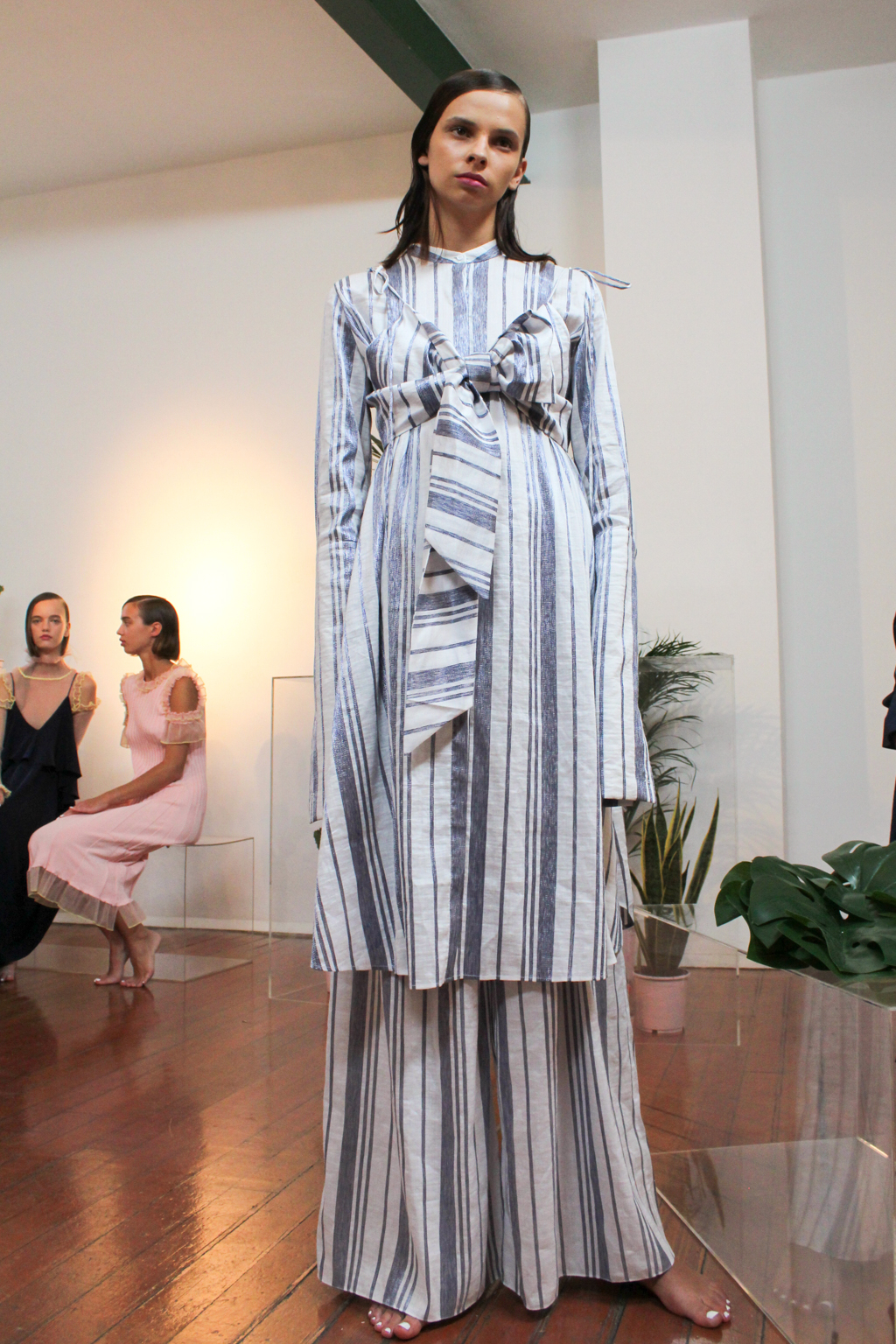 The colour palette this season made way for bold navy’s and stripes although Li’s soft pastel shades were still very much present. Woven and knitted fabrics developed in-house gave a far more personable touch, showing just how passionate the designer was about every part of the design and development process.