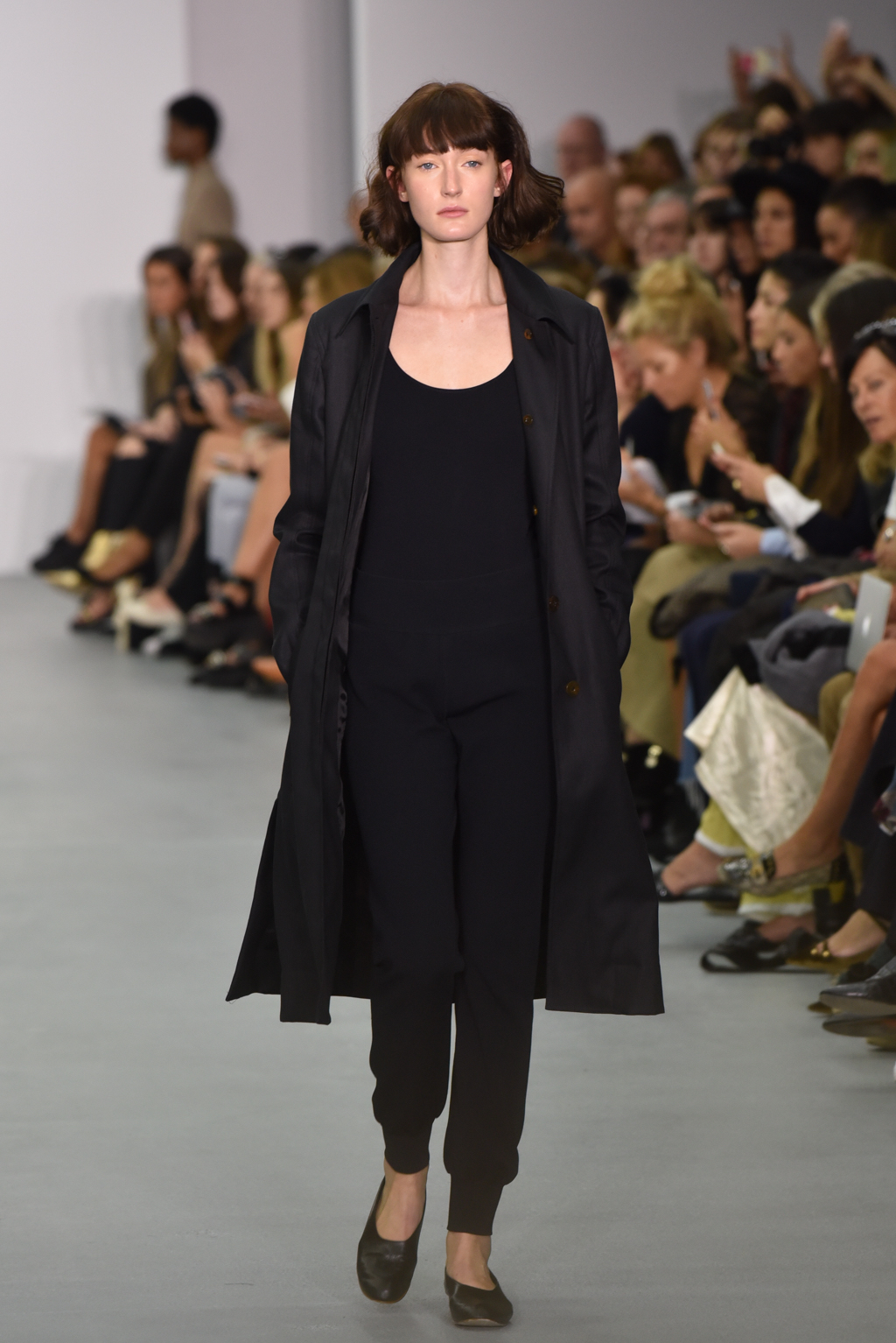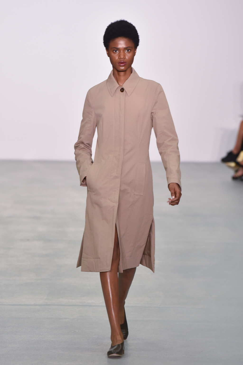 As with previous collections, Casasola’s muted colour scheme circumnavigated undue conservativism with daring necklines and styling traditionally set pieces on their own. A dark smoking jacket was paired only with plain, low-heeled court shoes; button-fronted coats, in navy and caramel, were worn similarly.