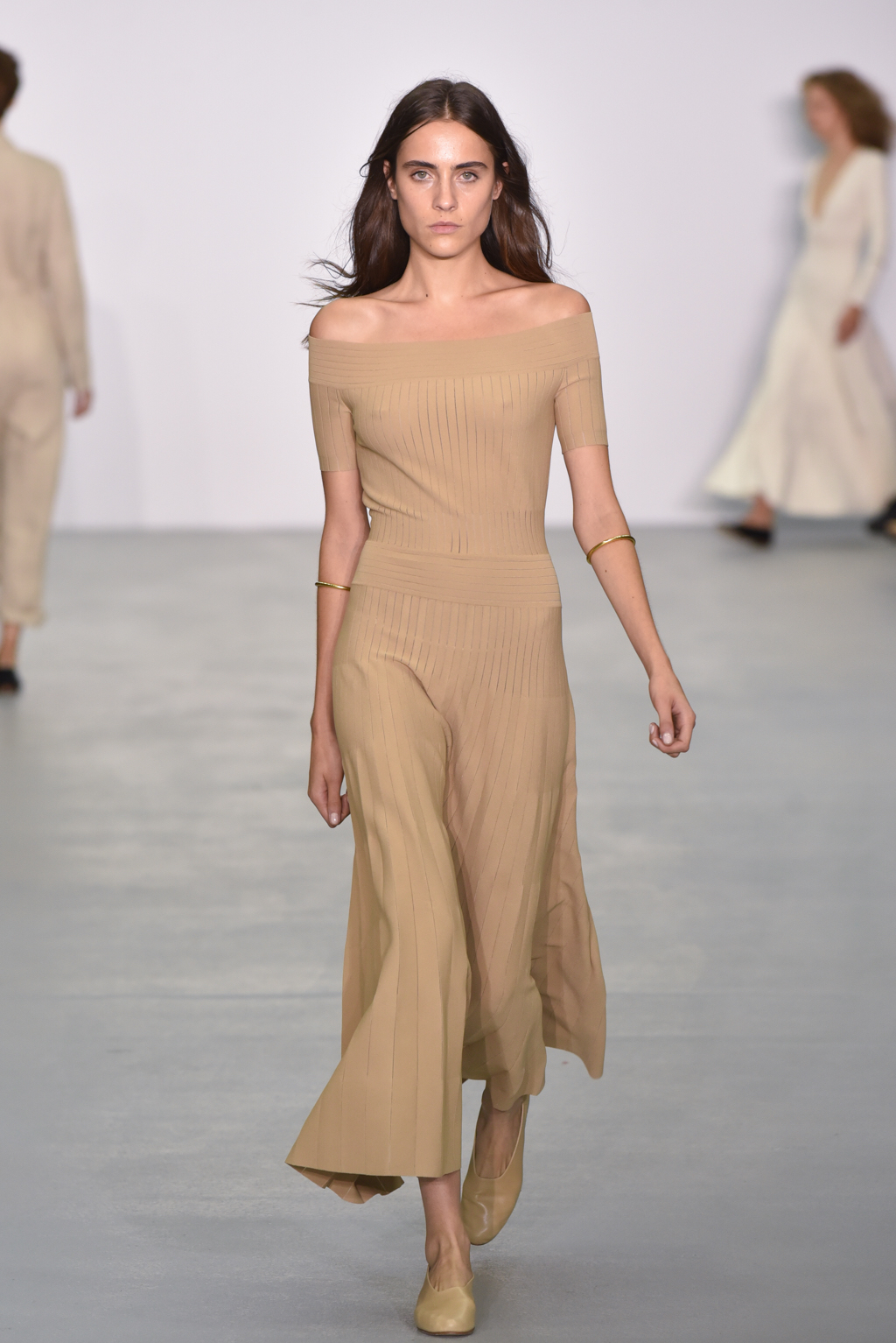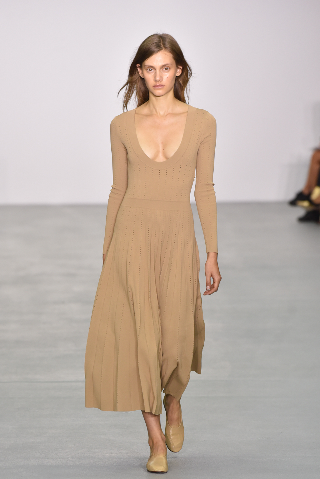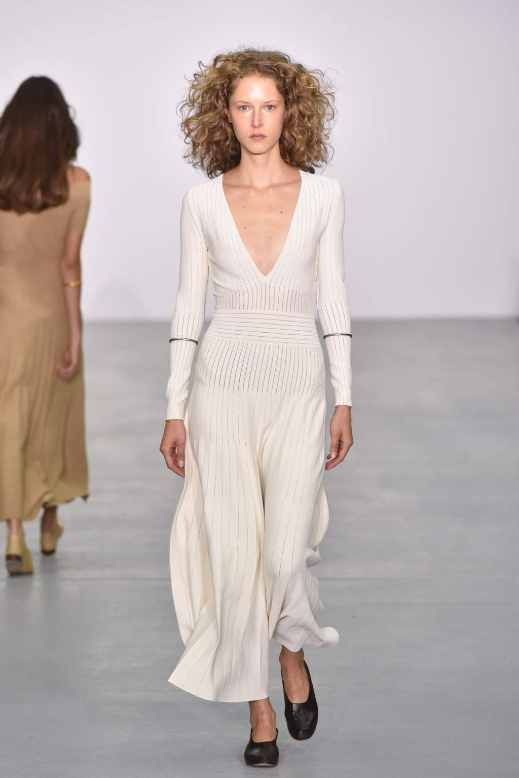 Casasola limited her palette to earthy tones: sand, olive and burnt umber reds, which do not distract from the interplay of textures and cut in the pieces themselves. Full length delicately knitted dresses were on display, as were more structured maxis made of corseted panels.