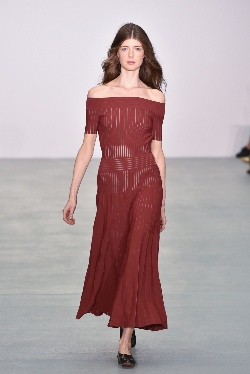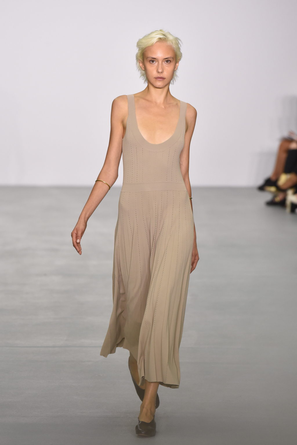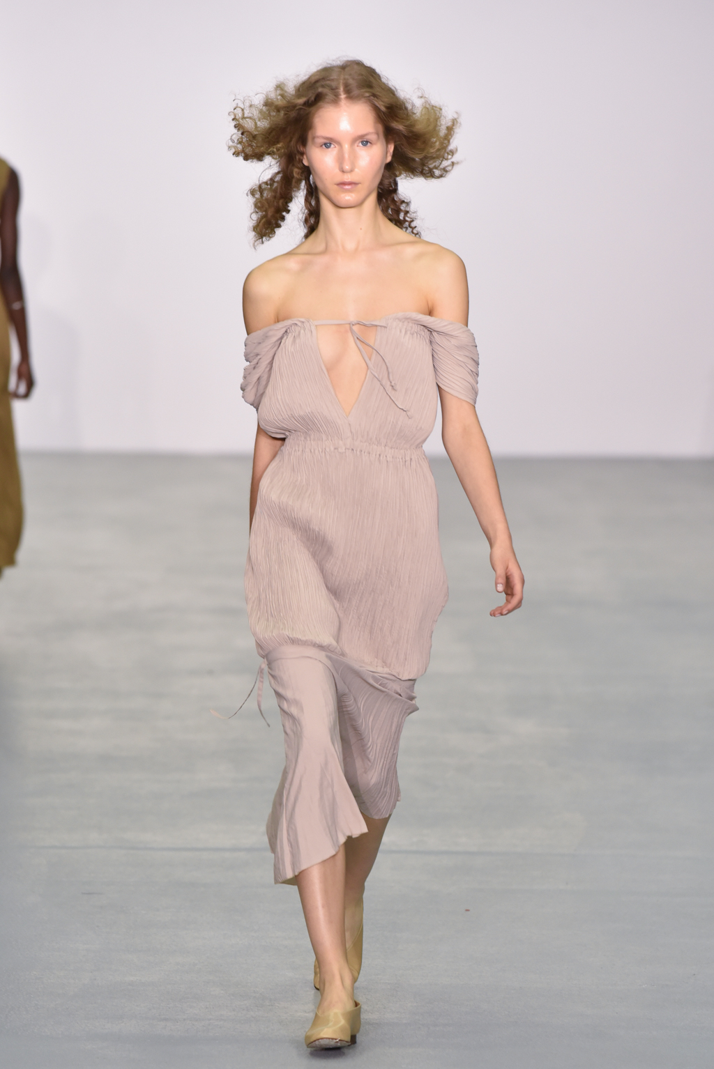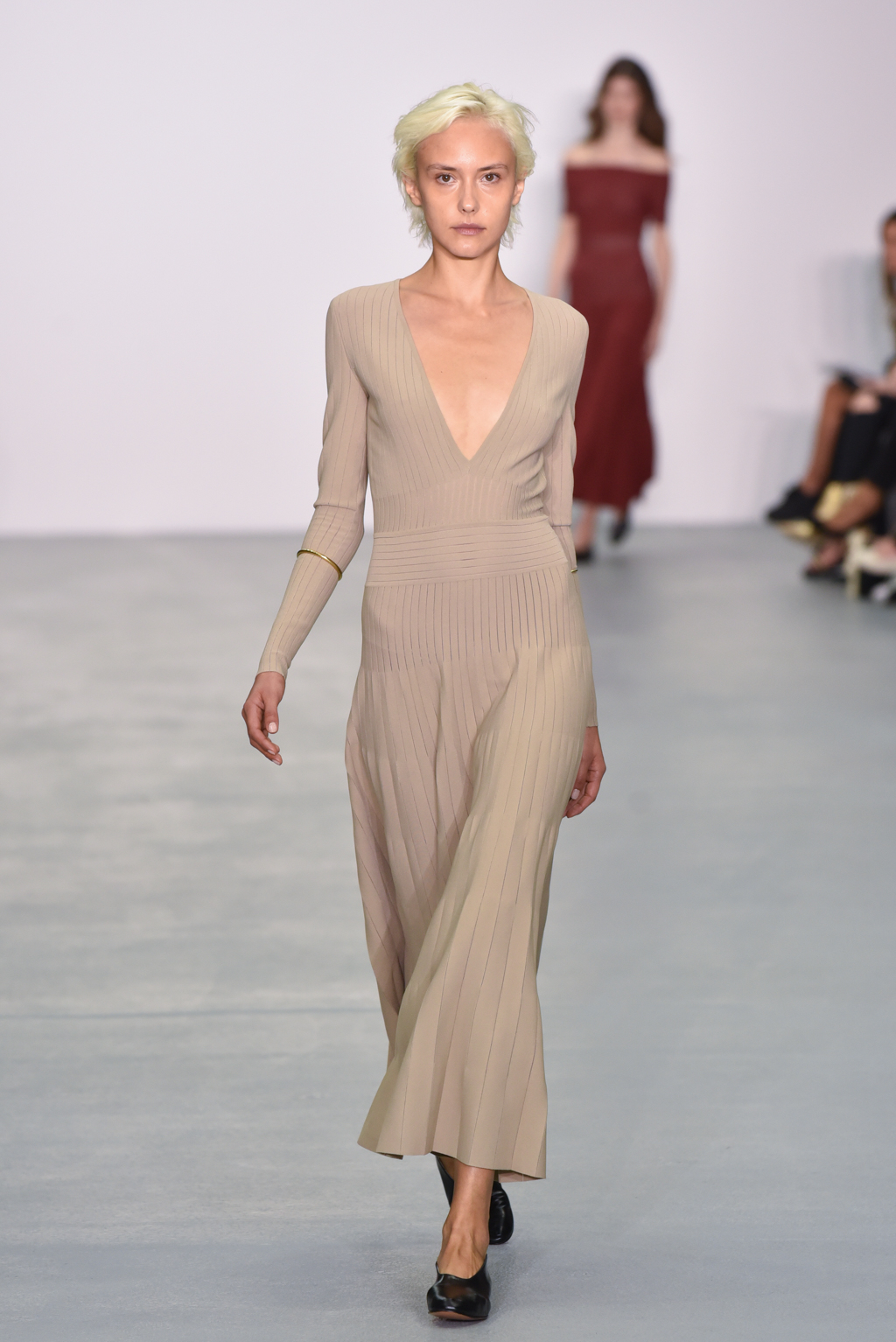 Casasola limited her palette to earthy tones: sand, olive and burnt umber reds, which do not distract from the interplay of textures and cut in the pieces themselves. Full length delicately knitted dresses were on display, as were more structured maxis made of corseted panels.