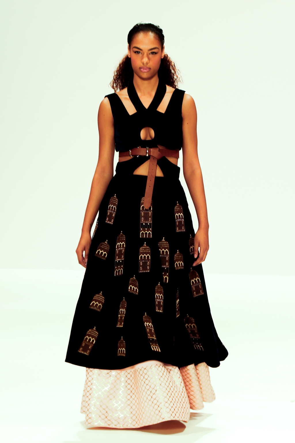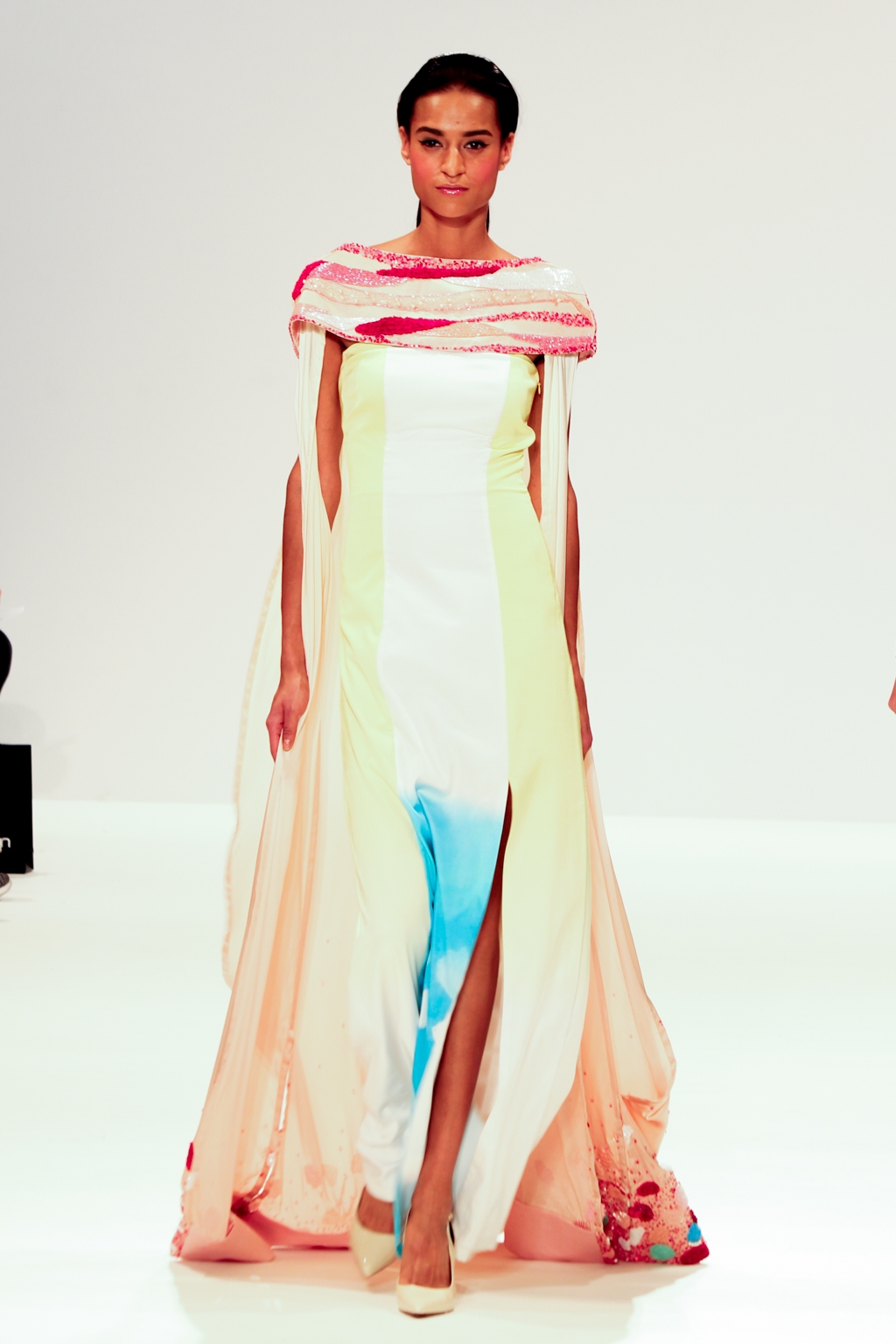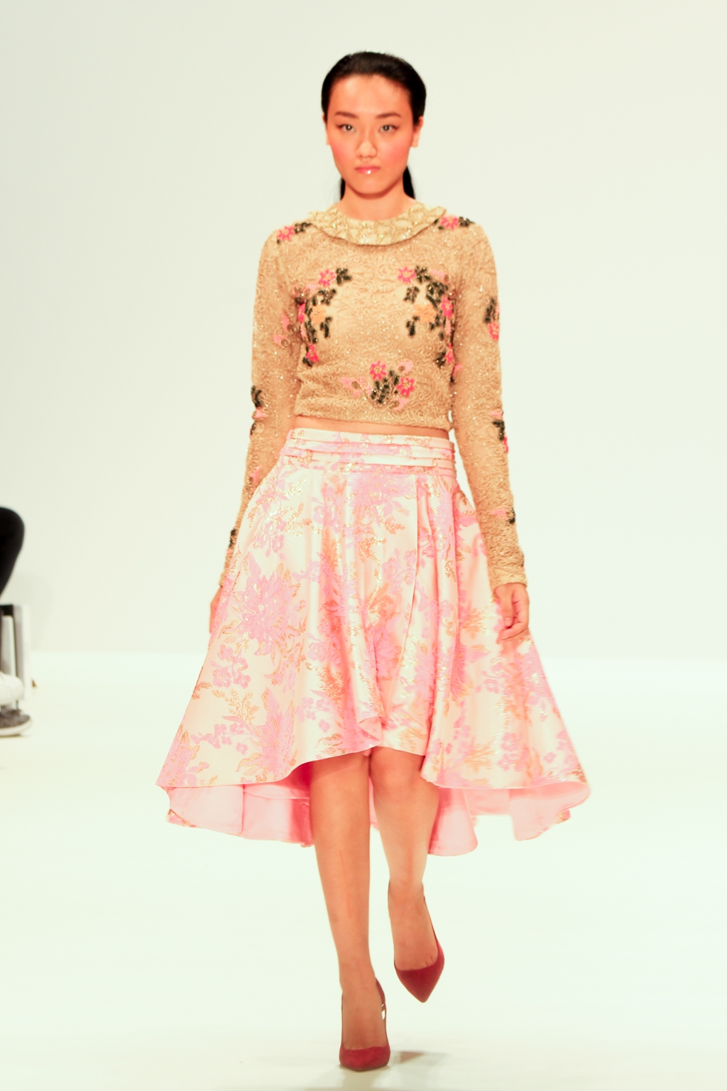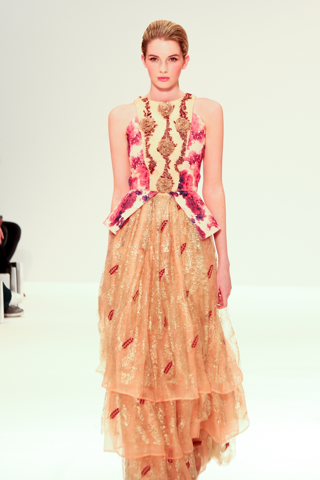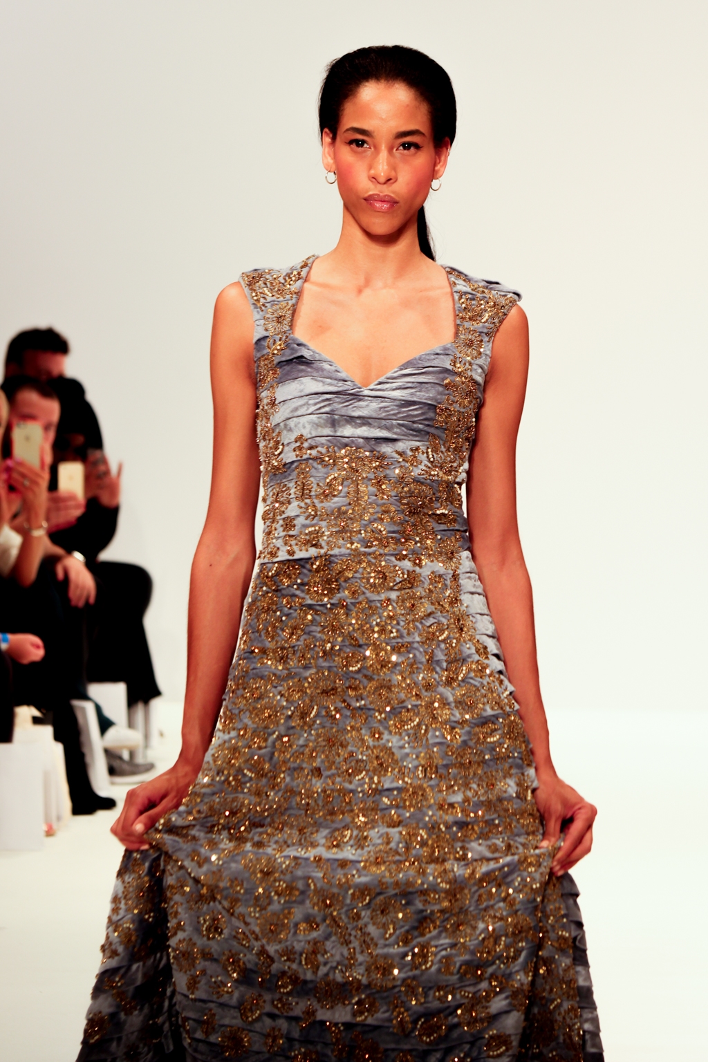 College shows are particularly fun to watch because of the variety of styles on display. Students have not yet been pigeon holed by industry highflyers and the media into representing one “vision” and so are far more comfortable experimenting with their designs and fabrics. Shabnam offered a range; tulip skirted dresses with painstaking floral appliqué were shown next to sari-inspired two pieces with laser cut necklines and pleated skirts, which lent the outfit a modernised movement and shape.Two of the shows highlights were Shabnam’s ball gown pieces; a navy floor length gown with gold glitter fronting and a gravity-defying red and orange off-shoulder piece, complete with a teardrop pleated skirt, elicited a stunned murmur from the audience.