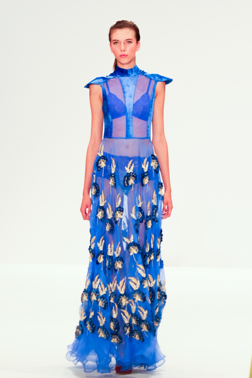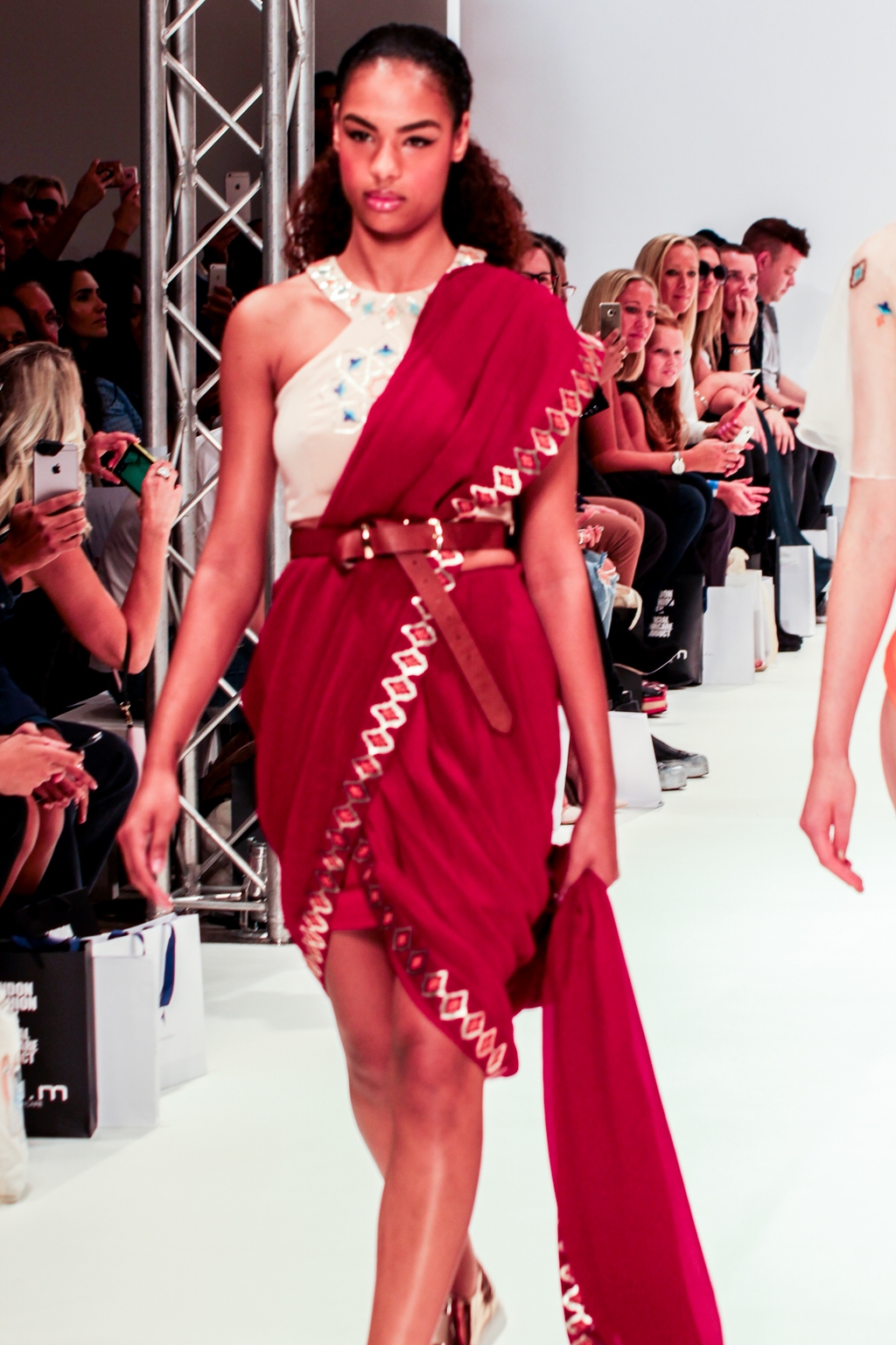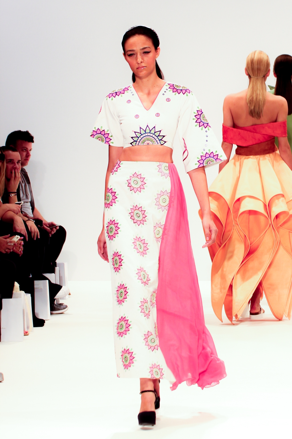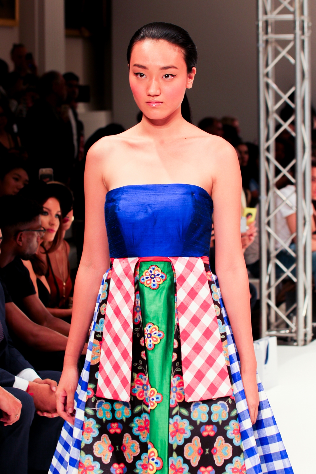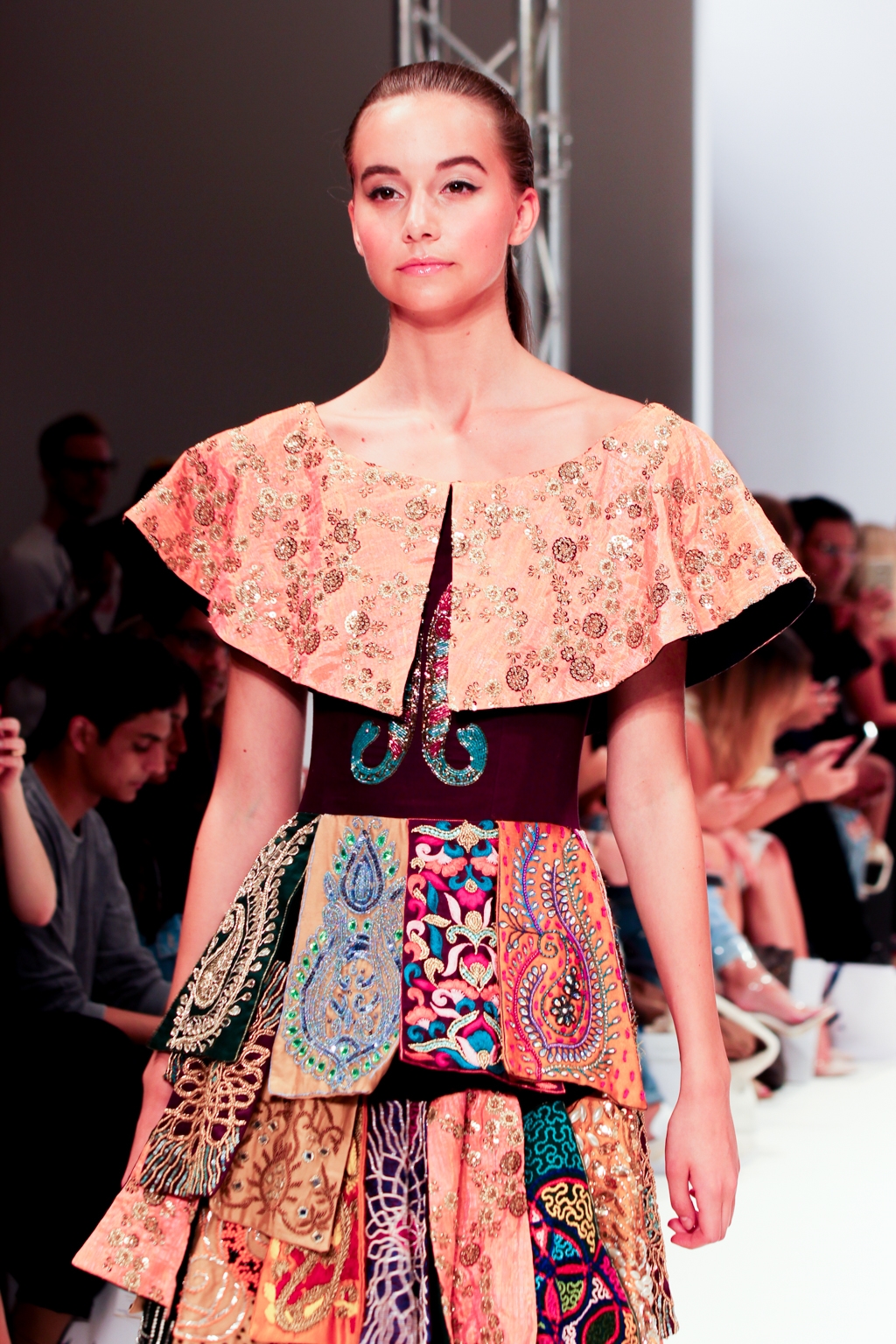 College shows are particularly fun to watch because of the variety of styles on display. Students have not yet been pigeon holed by industry highflyers and the media into representing one “vision” and so are far more comfortable experimenting with their designs and fabrics. Shabnam offered a range; tulip skirted dresses with painstaking floral appliqué were shown next to sari-inspired two pieces with laser cut necklines and pleated skirts, which lent the outfit a modernised movement and shape.Two of the shows highlights were Shabnam’s ball gown pieces; a navy floor length gown with gold glitter fronting and a gravity-defying red and orange off-shoulder piece, complete with a teardrop pleated skirt, elicited a stunned murmur from the audience.