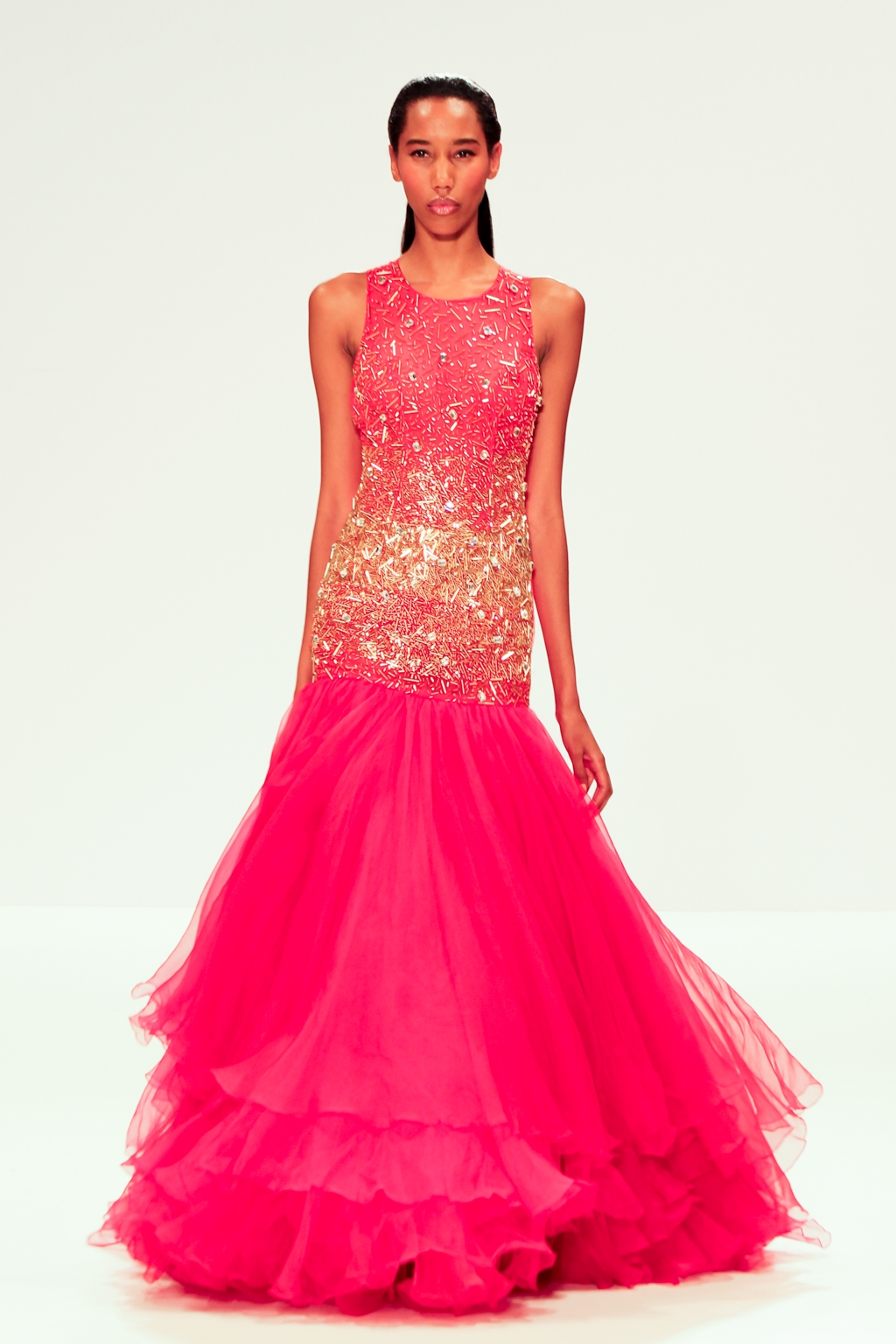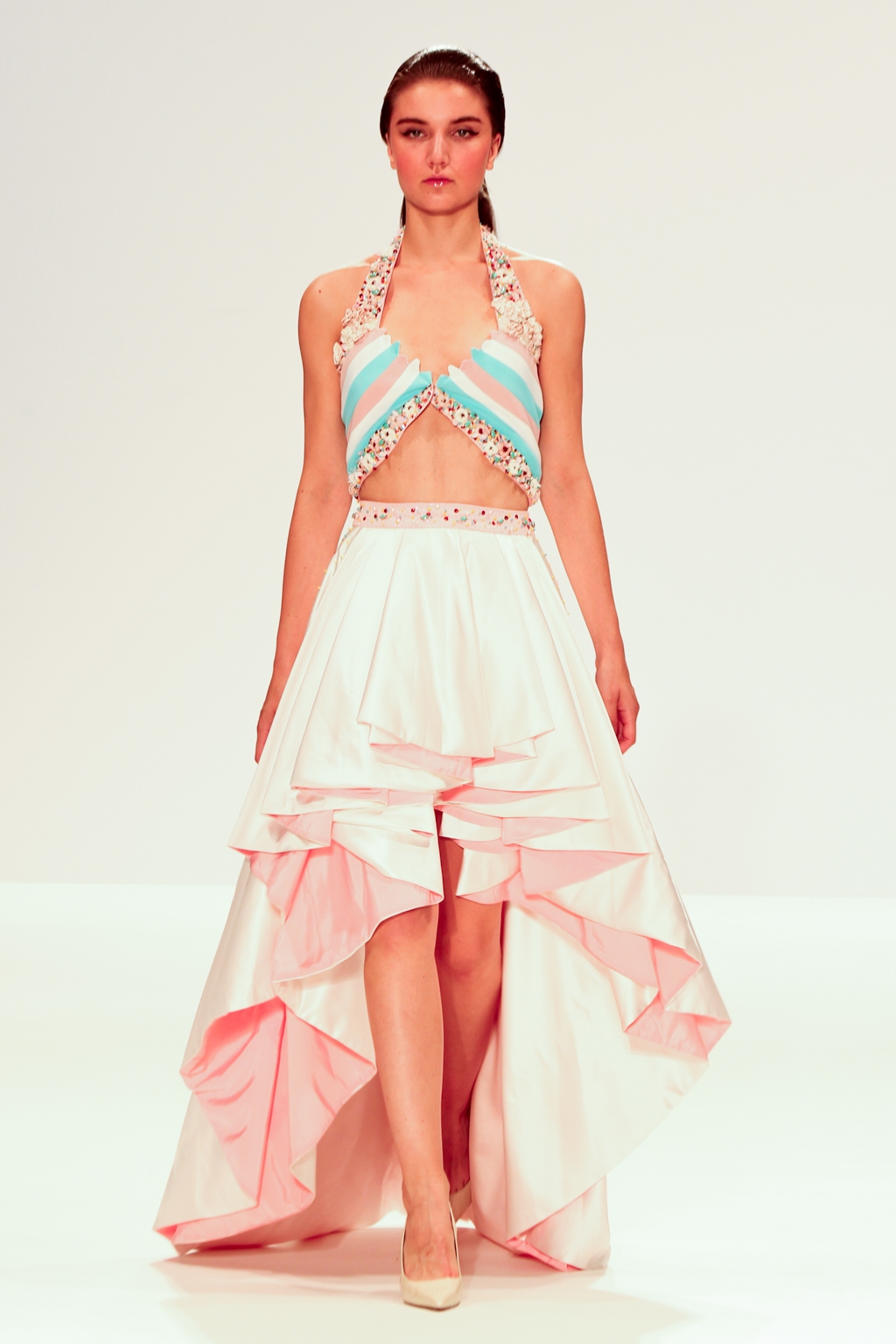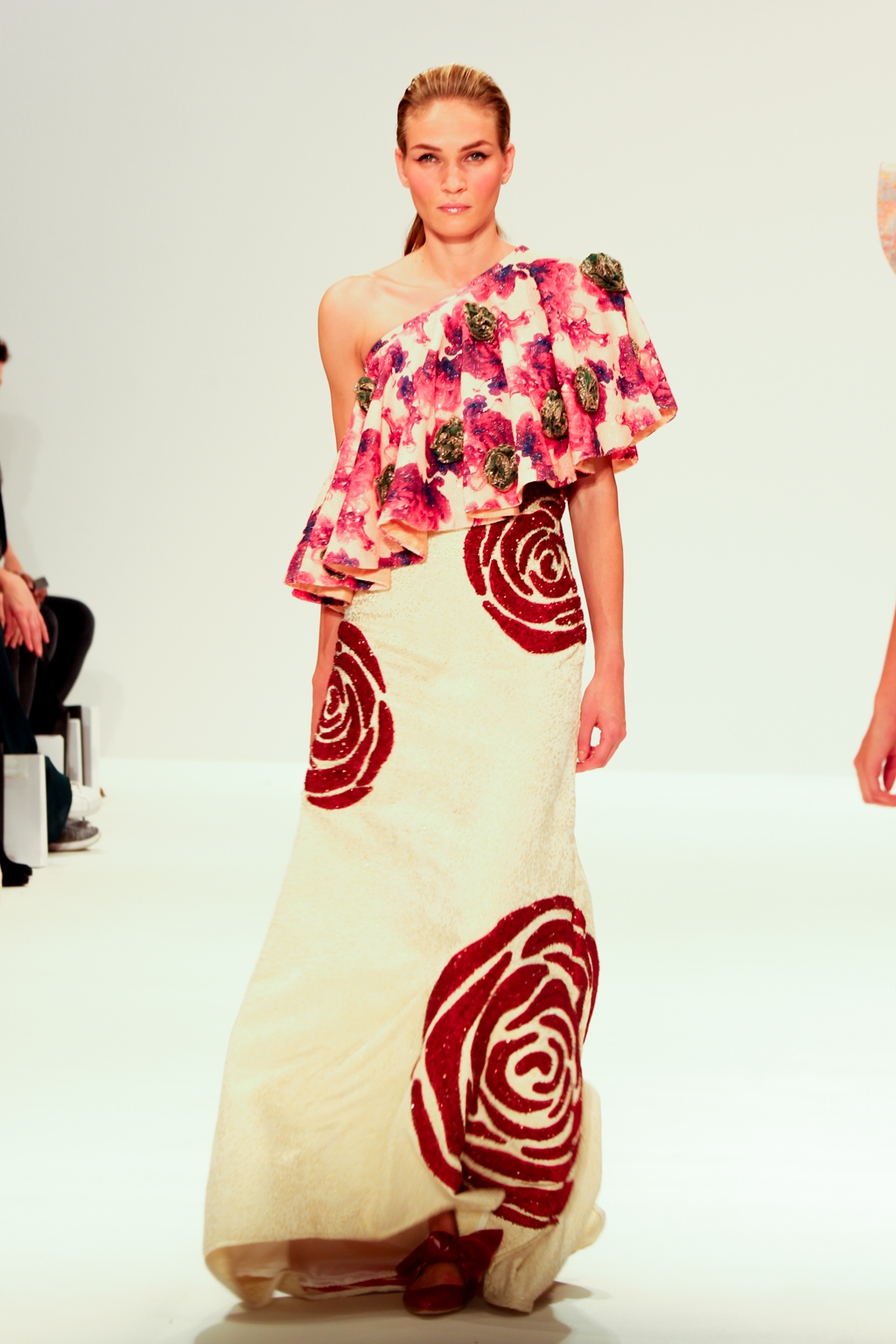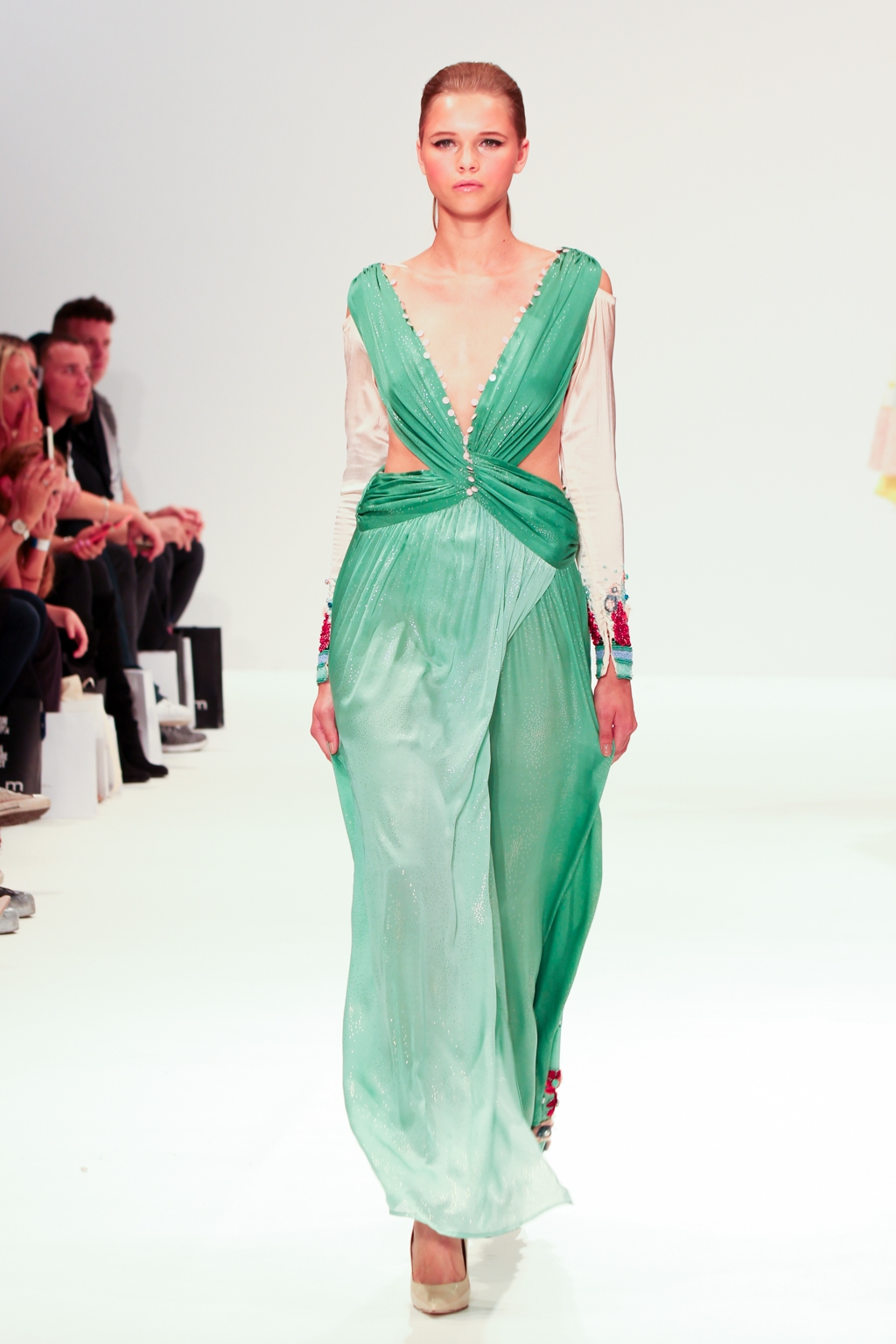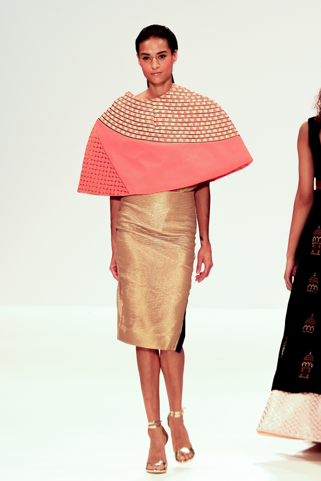 College shows are particularly fun to watch because of the variety of styles on display. Students have not yet been pigeon holed by industry highflyers and the media into representing one “vision” and so are far more comfortable experimenting with their designs and fabrics. Shabnam offered a range; tulip skirted dresses with painstaking floral appliqué were shown next to sari-inspired two pieces with laser cut necklines and pleated skirts, which lent the outfit a modernised movement and shape.Two of the shows highlights were Shabnam’s ball gown pieces; a navy floor length gown with gold glitter fronting and a gravity-defying red and orange off-shoulder piece, complete with a teardrop pleated skirt, elicited a stunned murmur from the audience.