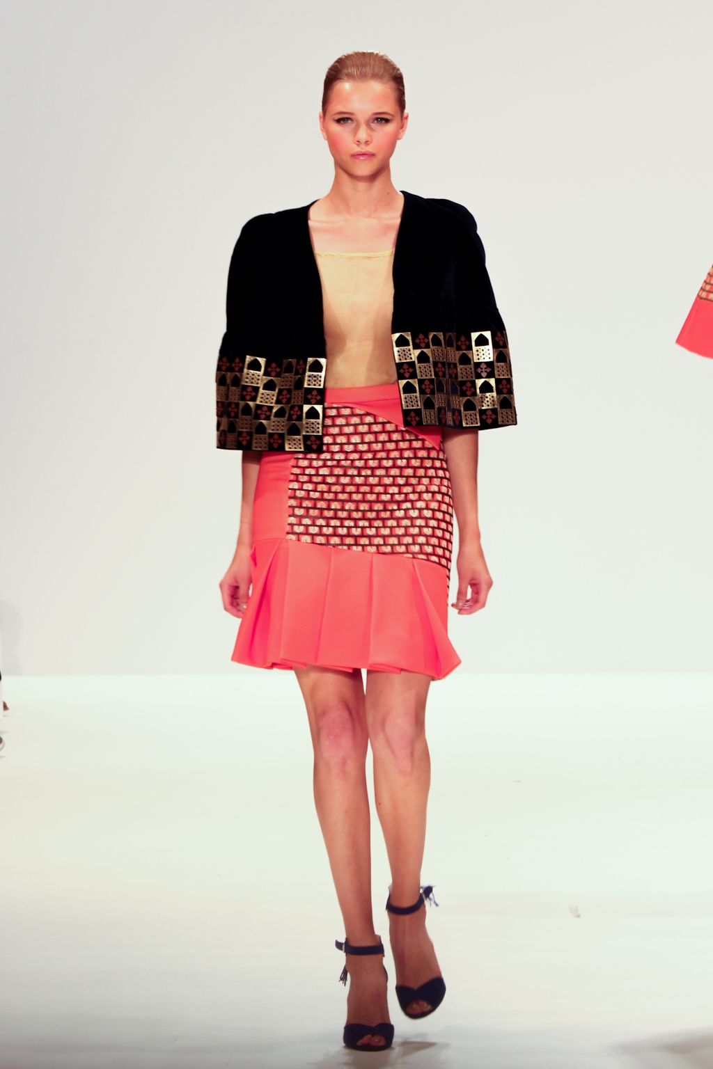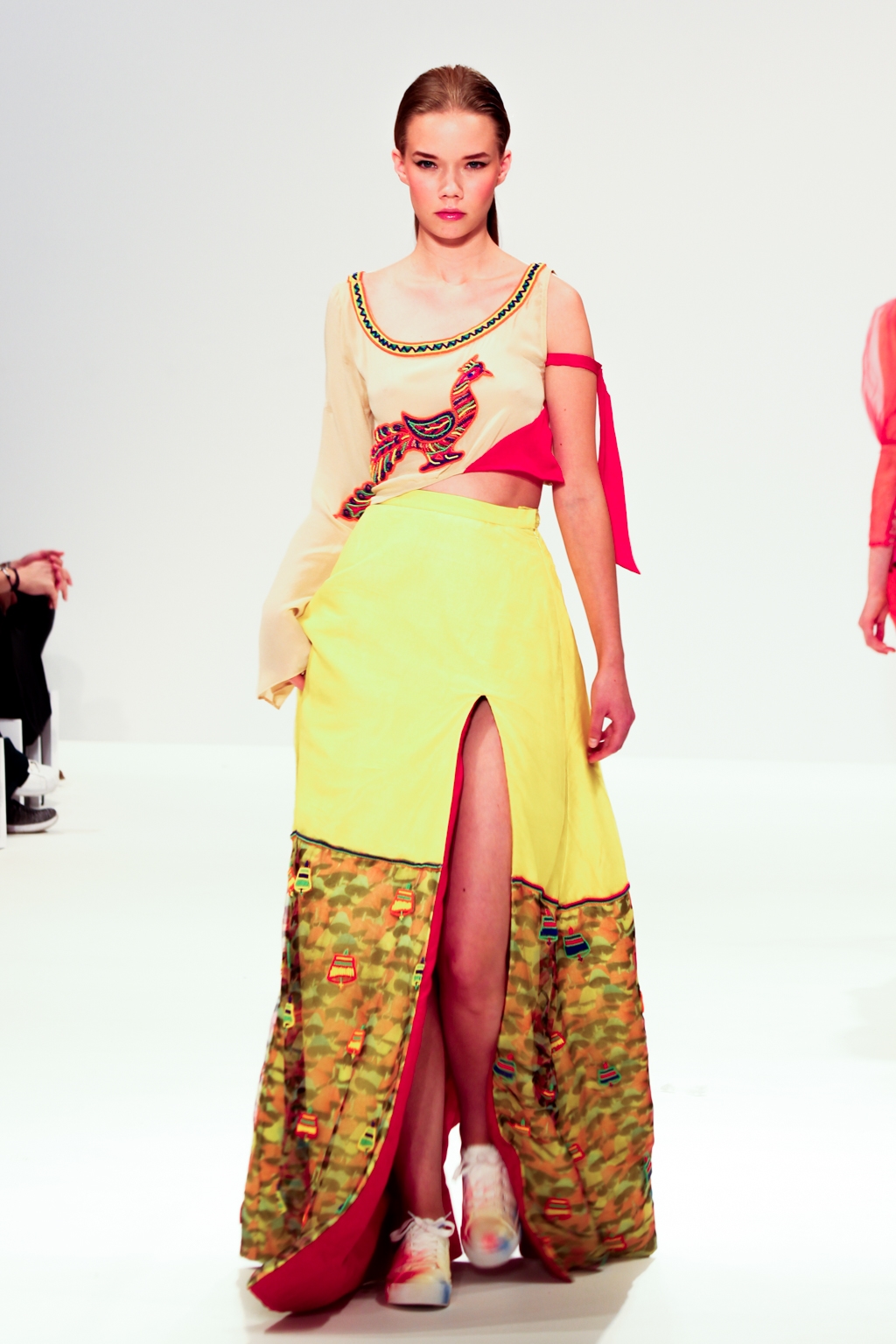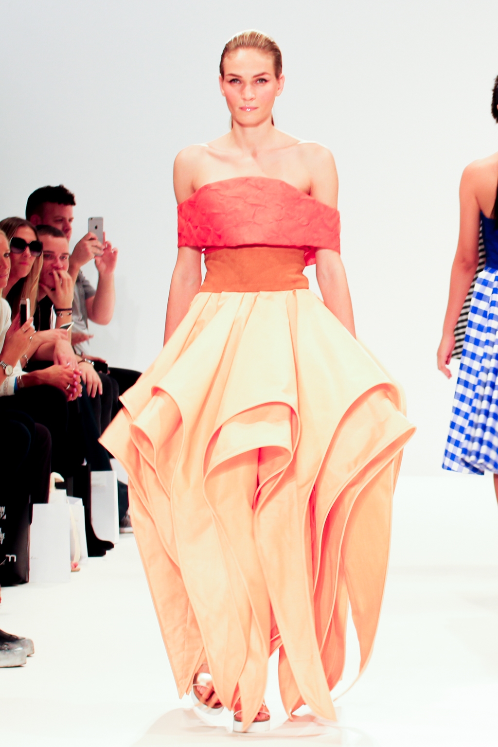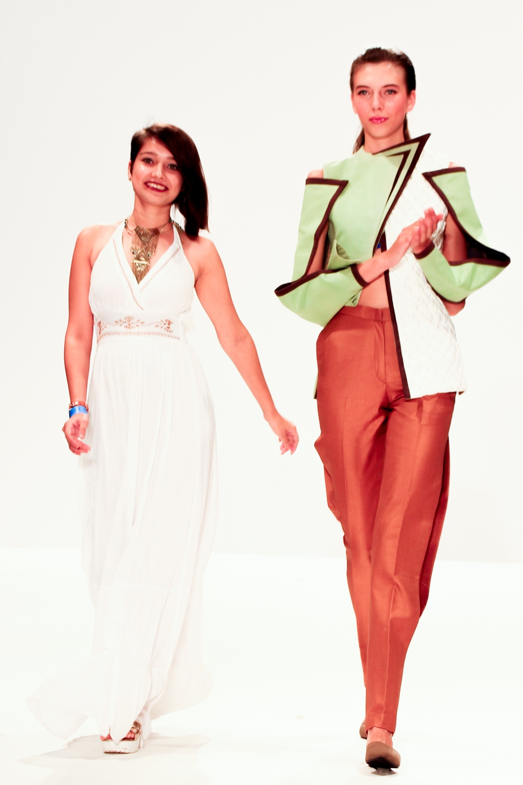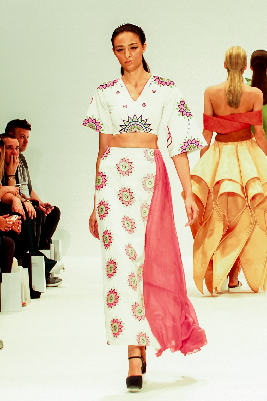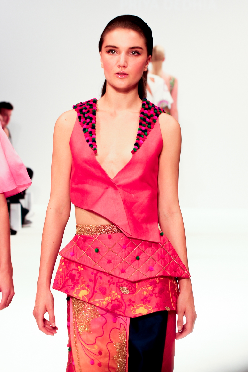 College shows are particularly fun to watch because of the variety of styles on display. Students have not yet been pigeon holed by industry highflyers and the media into representing one “vision” and so are far more comfortable experimenting with their designs and fabrics. Shabnam offered a range; tulip skirted dresses with painstaking floral appliqué were shown next to sari-inspired two pieces with laser cut necklines and pleated skirts, which lent the outfit a modernised movement and shape.Two of the shows highlights were Shabnam’s ball gown pieces; a navy floor length gown with gold glitter fronting and a gravity-defying red and orange off-shoulder piece, complete with a teardrop pleated skirt, elicited a stunned murmur from the audience.