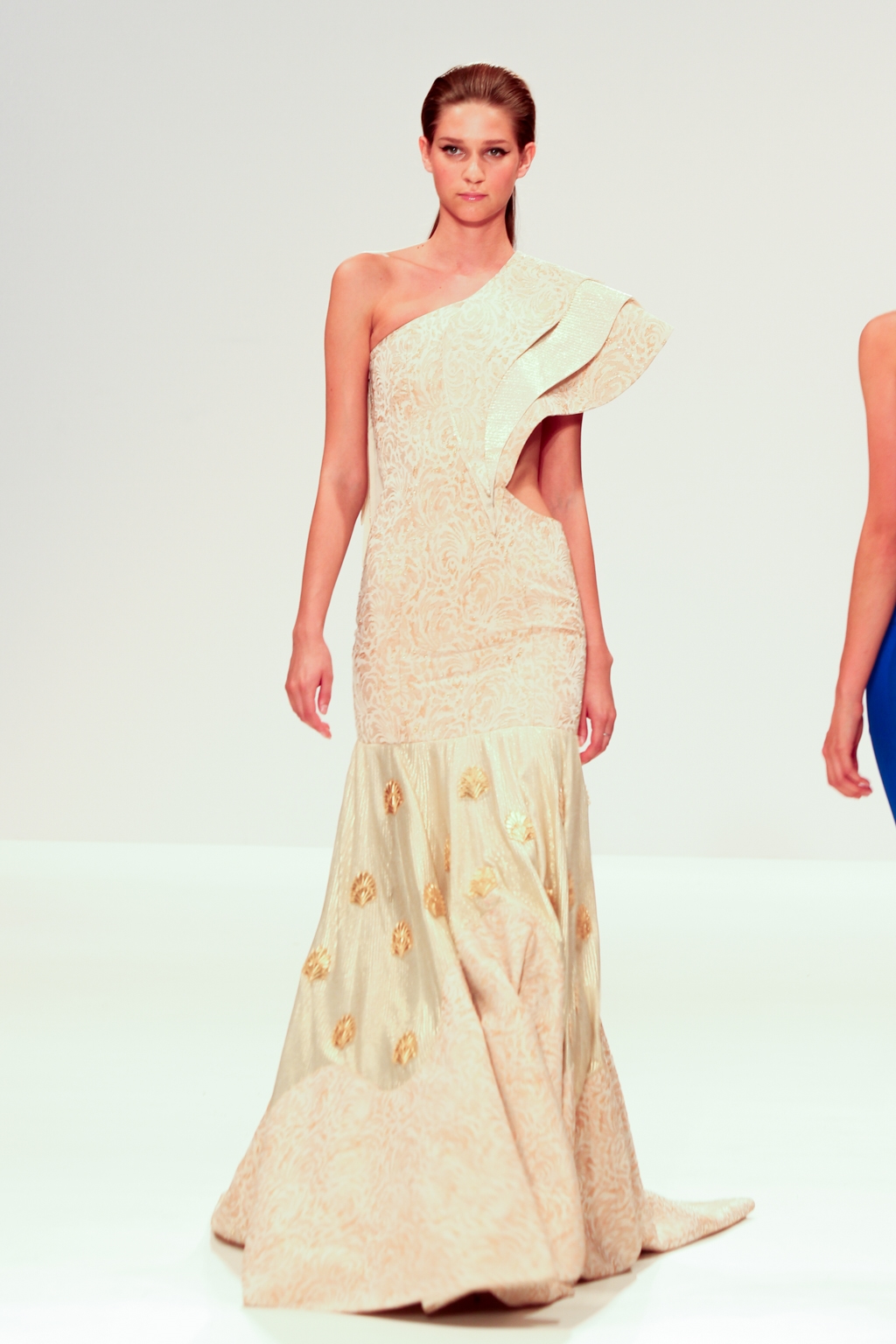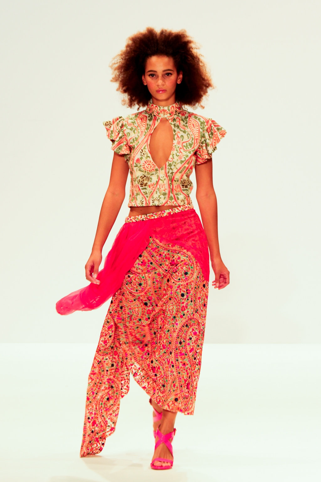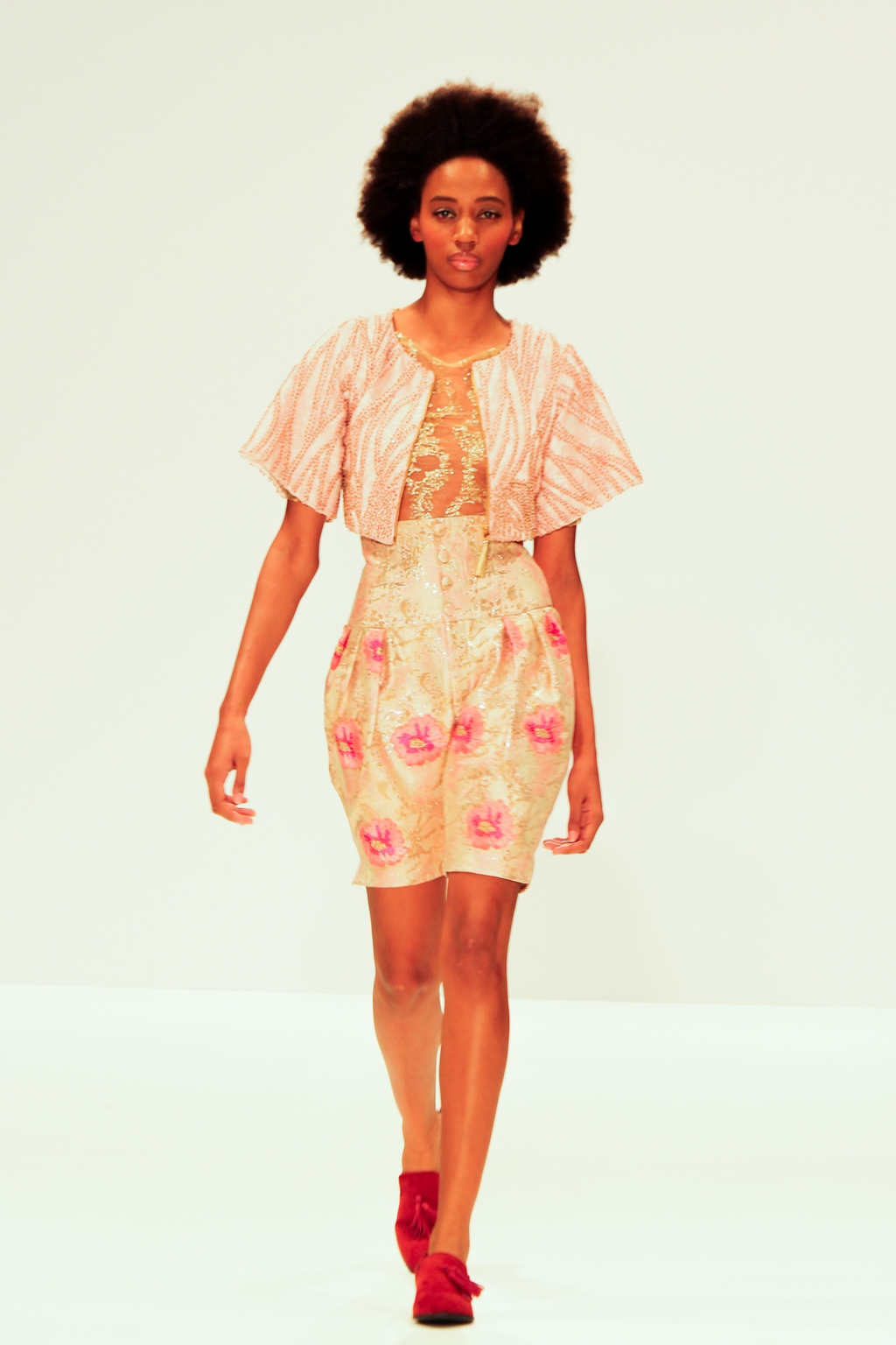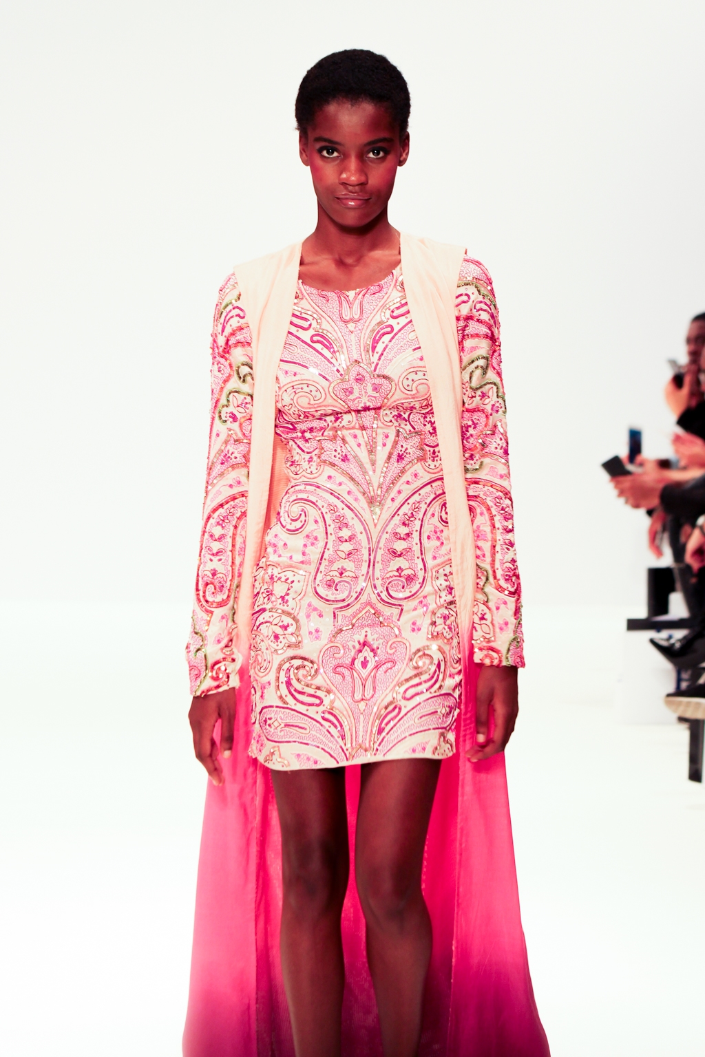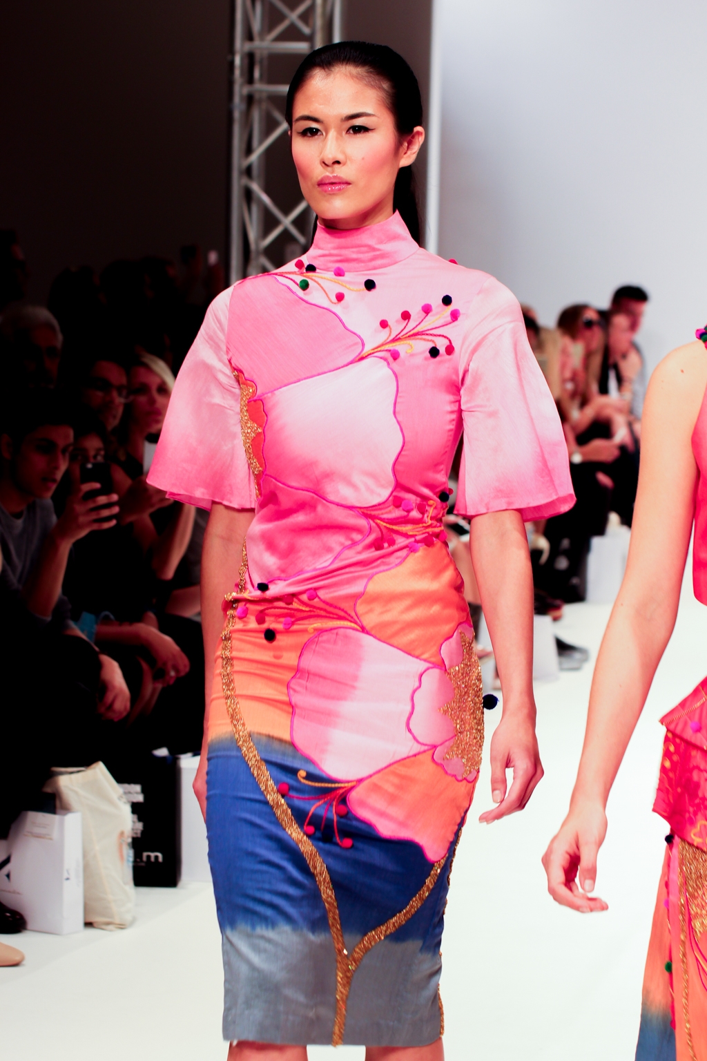 College shows are particularly fun to watch because of the variety of styles on display. Students have not yet been pigeon holed by industry highflyers and the media into representing one “vision” and so are far more comfortable experimenting with their designs and fabrics. Shabnam offered a range; tulip skirted dresses with painstaking floral appliqué were shown next to sari-inspired two pieces with laser cut necklines and pleated skirts, which lent the outfit a modernised movement and shape.Two of the shows highlights were Shabnam’s ball gown pieces; a navy floor length gown with gold glitter fronting and a gravity-defying red and orange off-shoulder piece, complete with a teardrop pleated skirt, elicited a stunned murmur from the audience.