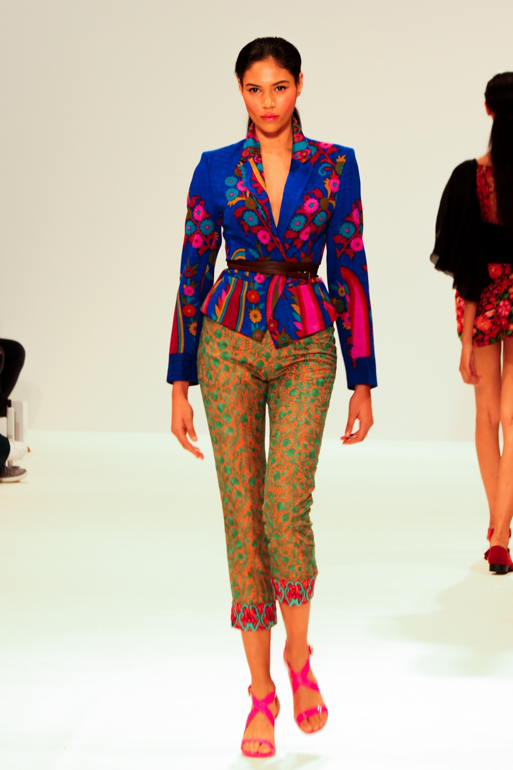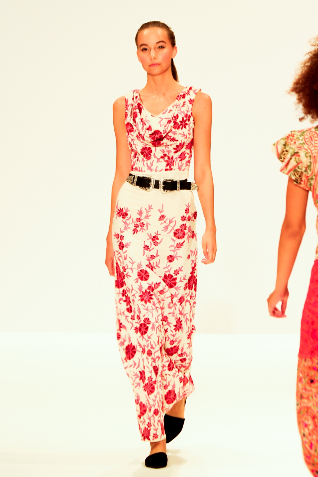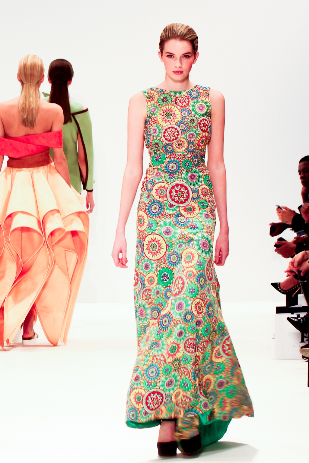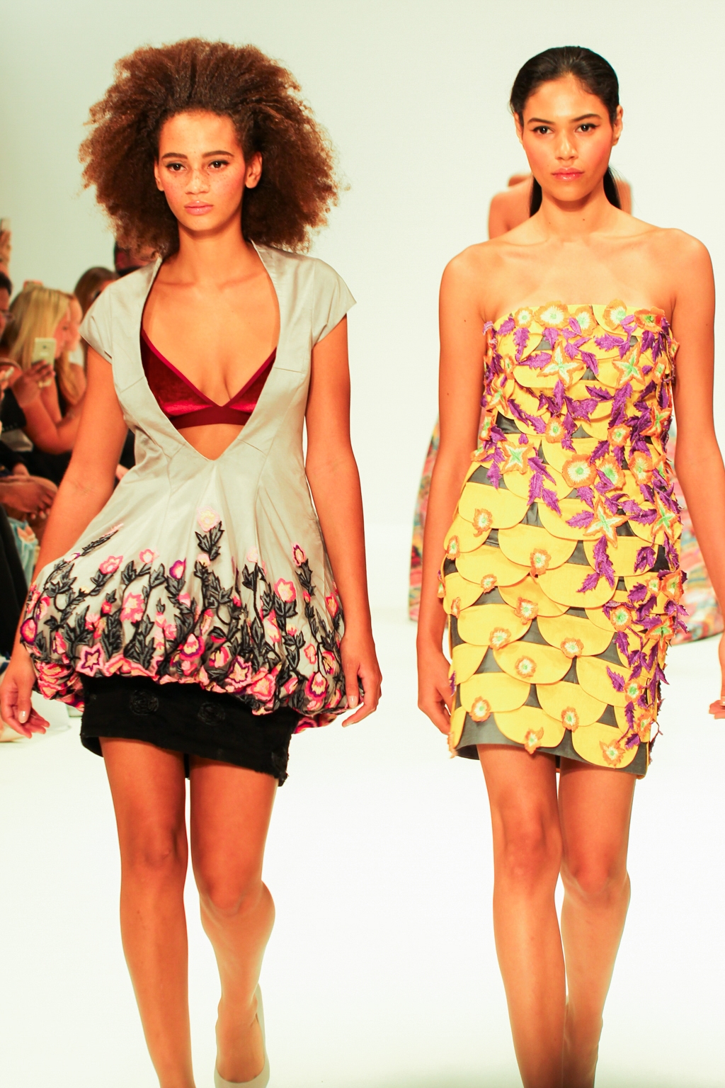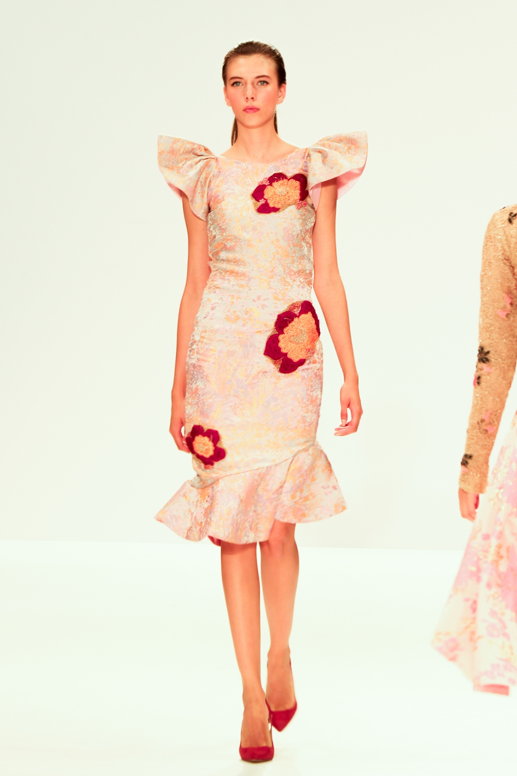 College shows are particularly fun to watch because of the variety of styles on display. Students have not yet been pigeon holed by industry highflyers and the media into representing one “vision” and so are far more comfortable experimenting with their designs and fabrics. Shabnam offered a range; tulip skirted dresses with painstaking floral appliqué were shown next to sari-inspired two pieces with laser cut necklines and pleated skirts, which lent the outfit a modernised movement and shape.Two of the shows highlights were Shabnam’s ball gown pieces; a navy floor length gown with gold glitter fronting and a gravity-defying red and orange off-shoulder piece, complete with a teardrop pleated skirt, elicited a stunned murmur from the audience.