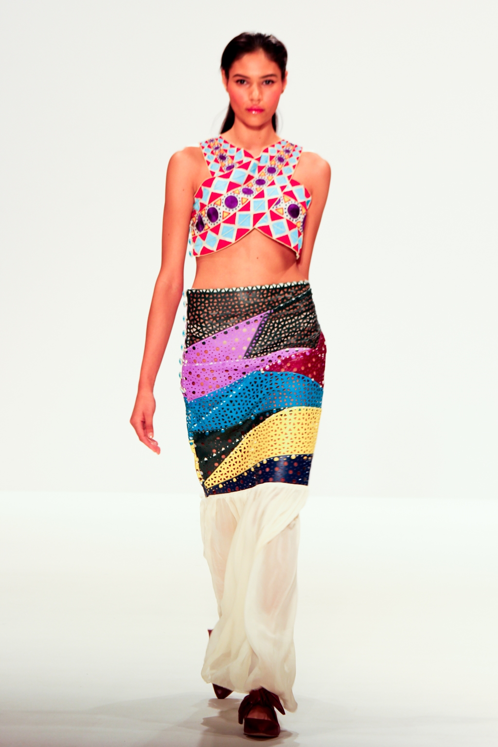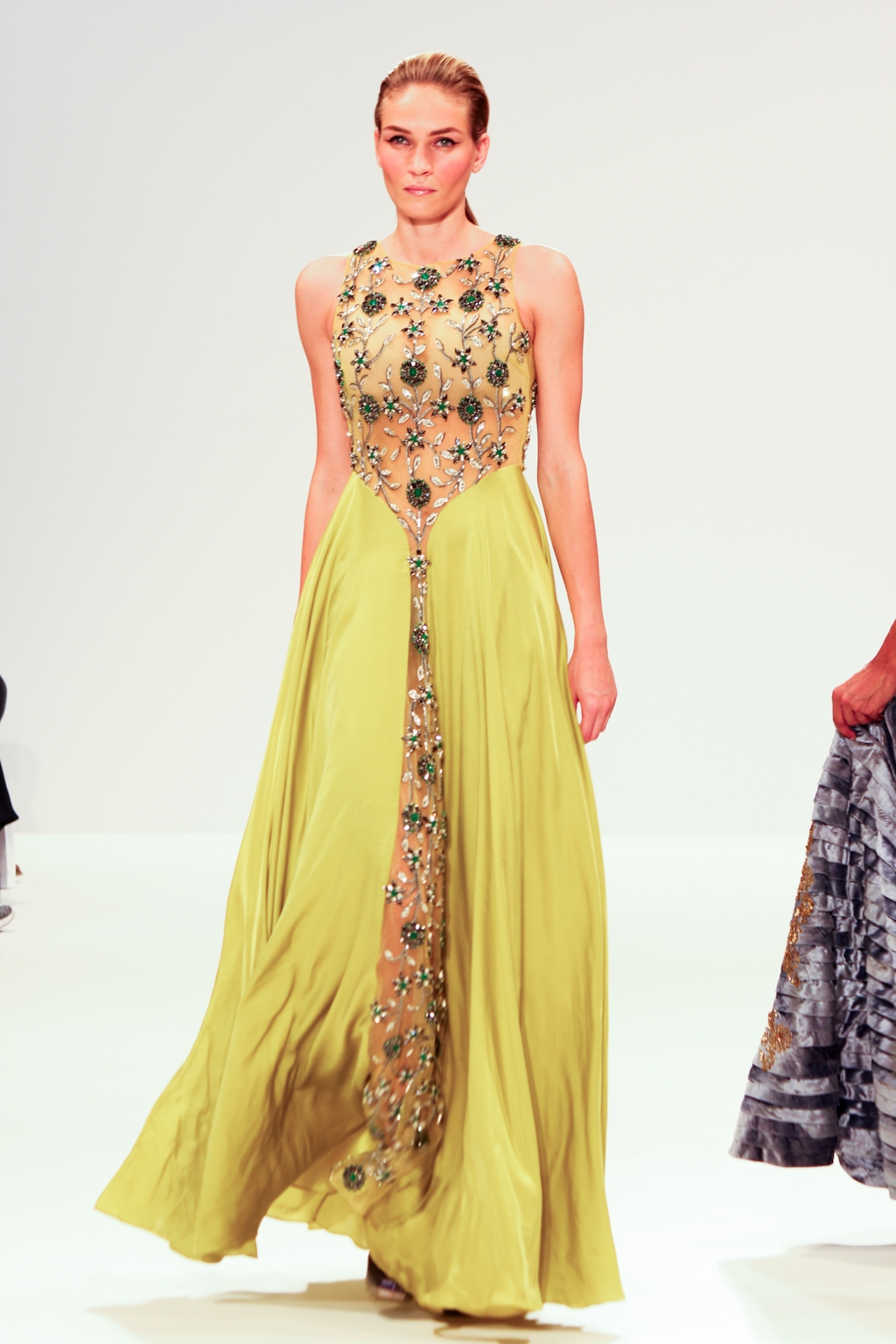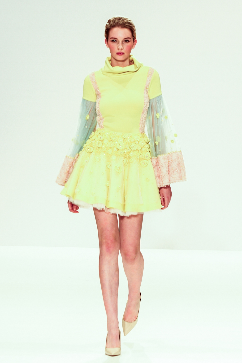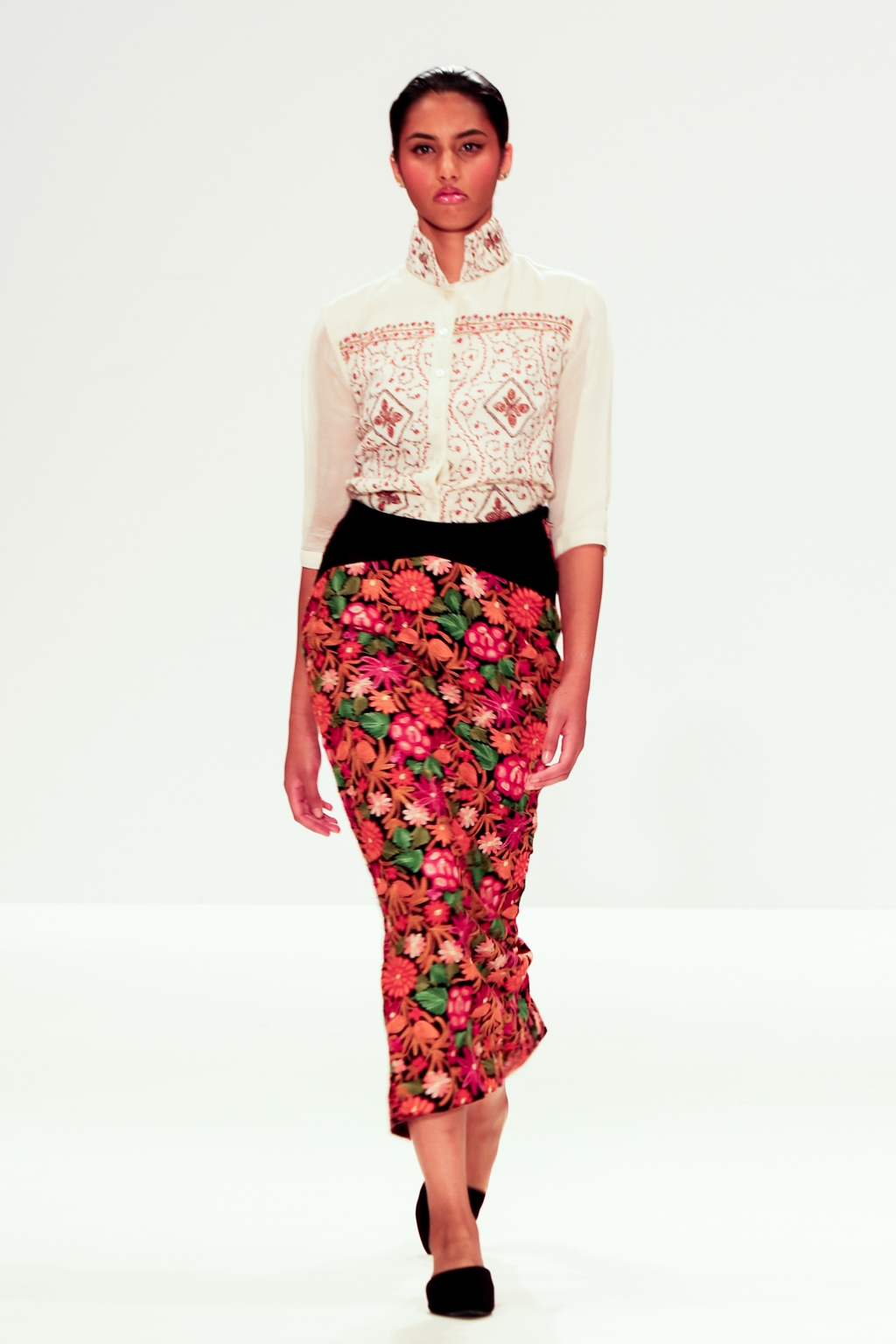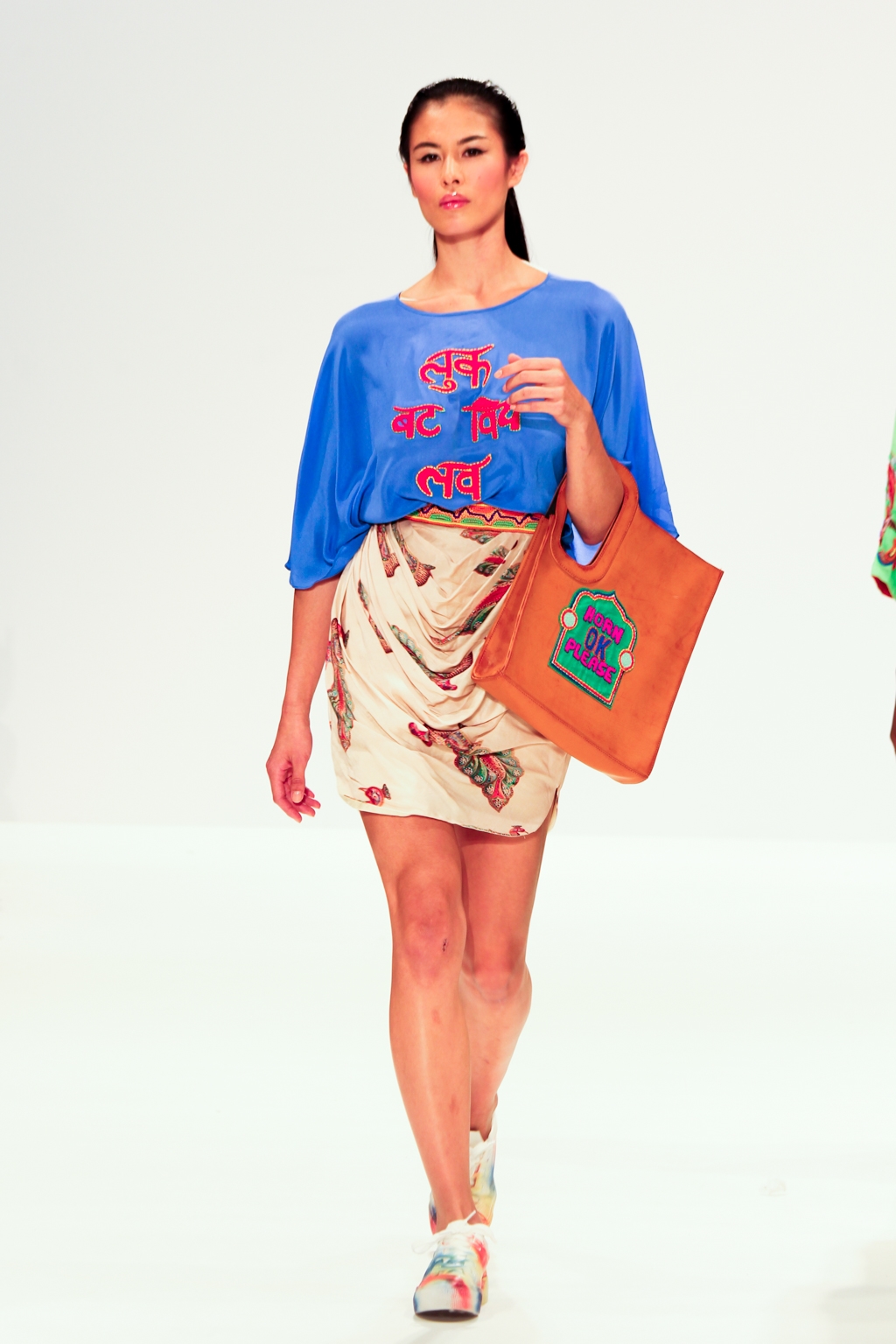 College shows are particularly fun to watch because of the variety of styles on display. Students have not yet been pigeon holed by industry highflyers and the media into representing one “vision” and so are far more comfortable experimenting with their designs and fabrics. Shabnam offered a range; tulip skirted dresses with painstaking floral appliqué were shown next to sari-inspired two pieces with laser cut necklines and pleated skirts, which lent the outfit a modernised movement and shape.Two of the shows highlights were Shabnam’s ball gown pieces; a navy floor length gown with gold glitter fronting and a gravity-defying red and orange off-shoulder piece, complete with a teardrop pleated skirt, elicited a stunned murmur from the audience.