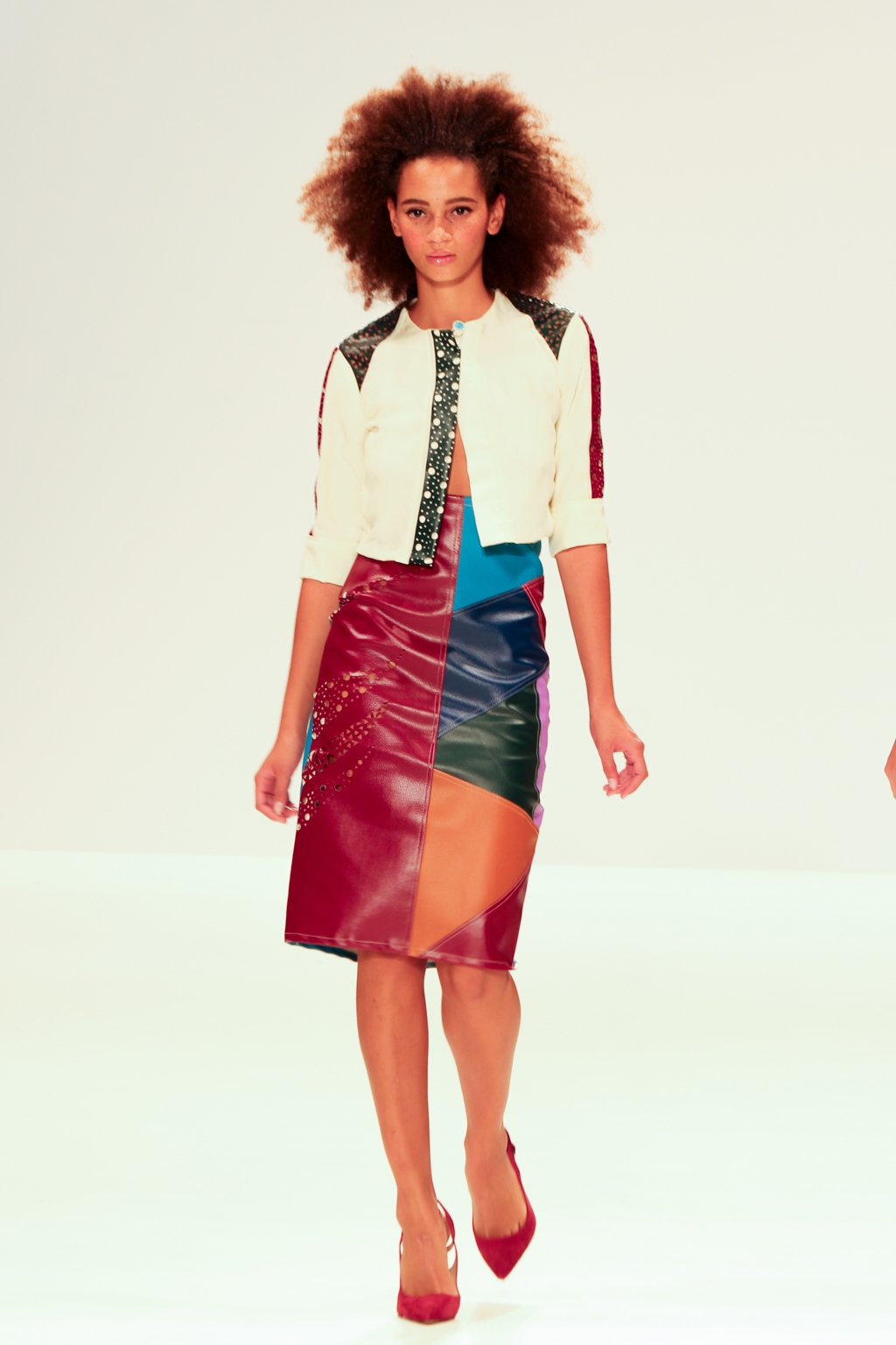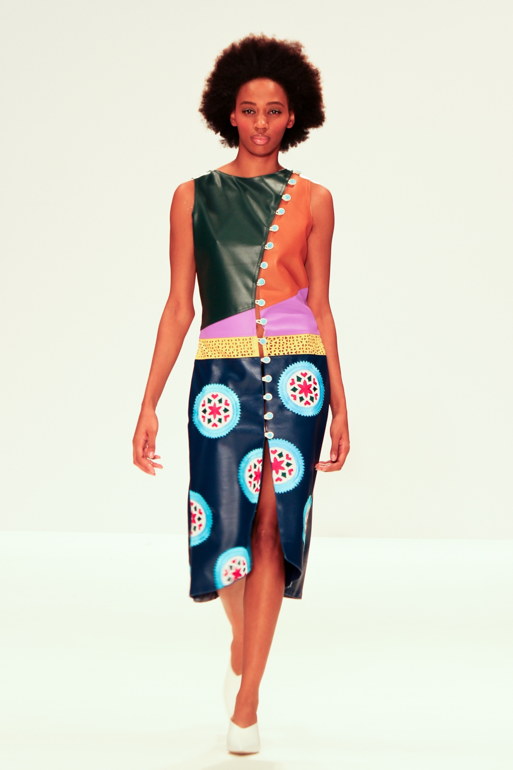 Kamble took on more challenging materials, showing how leather can retain its classic appeal whilst being updated to offer a fresh aesthetic. Leather pencil dresses were made up of clashing intersectioned panels and fixed with an asymmetric buttons down the full length of the dress.