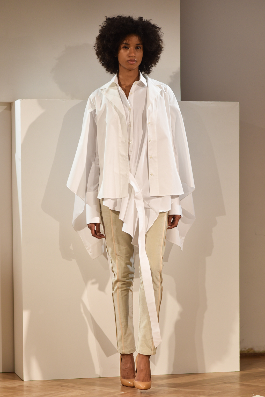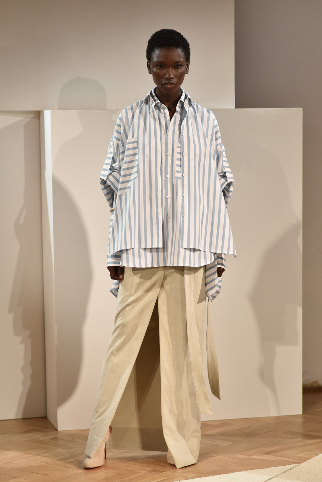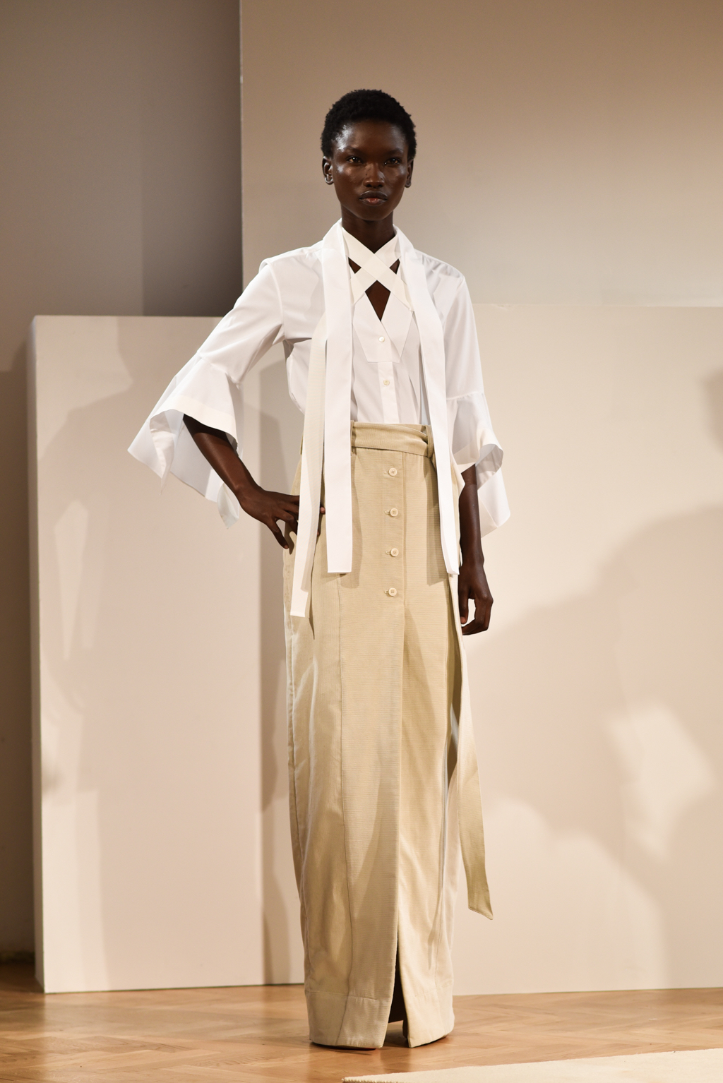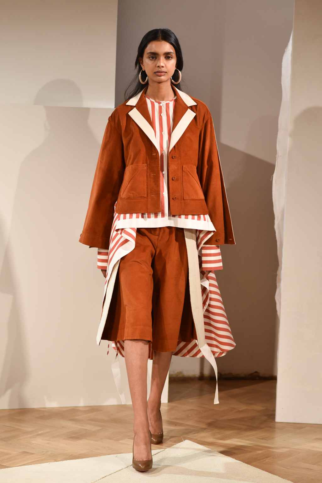 Cotton poplin and chambrays were heavily used for shirting, while micro-corduroy and fine, gauzy cotton knits added layers of intrigue as outerwear. Meanwhile, skirts and trousers were cleverly cut with overlapping prints, which allowed the body to be exposed with movement