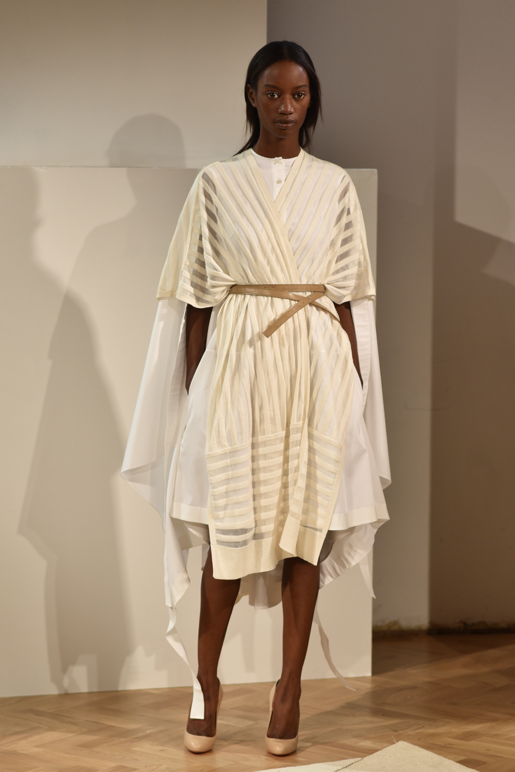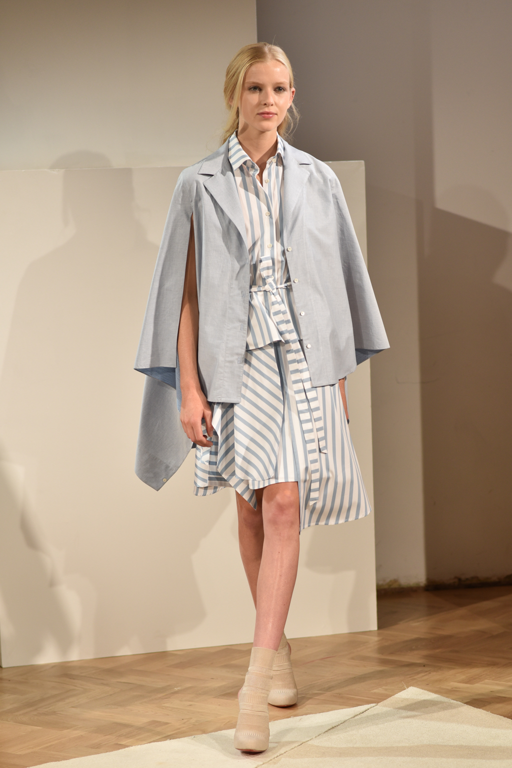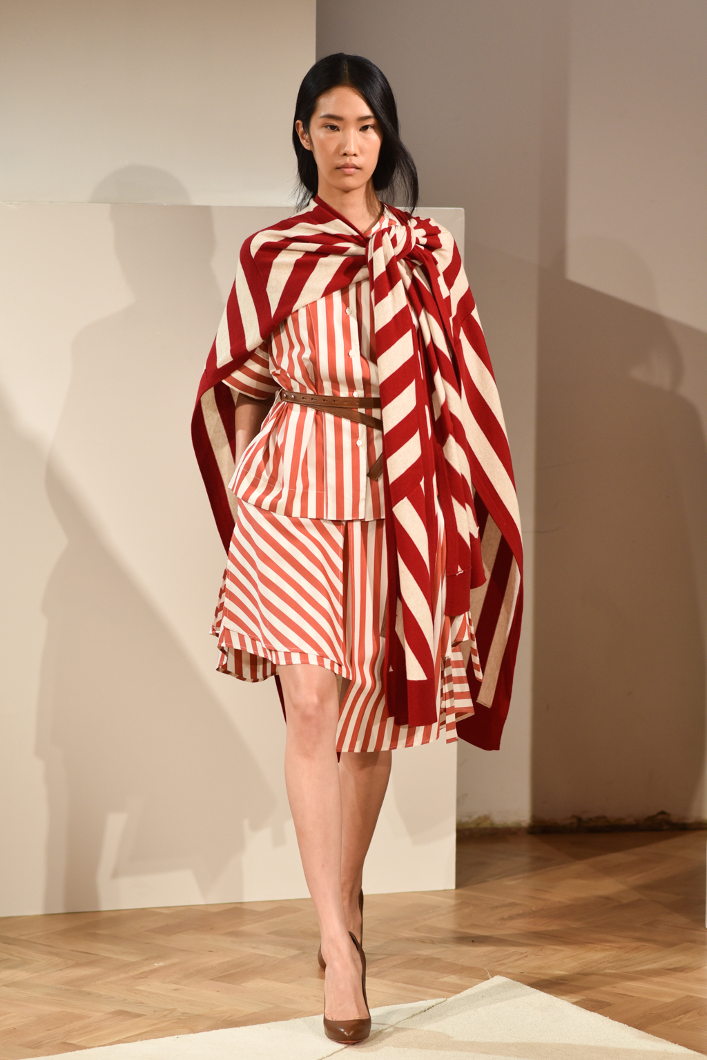 The colour palette and textures were laidback and had a nostalgic feel, but a graphic edge, courtesy of stripe patterns. Muted red, chambray, sky blue, olive and sand were key shades. A deliberate choice of natural fabrics was lifted through layering with robe-like belts and grosgrain trims.