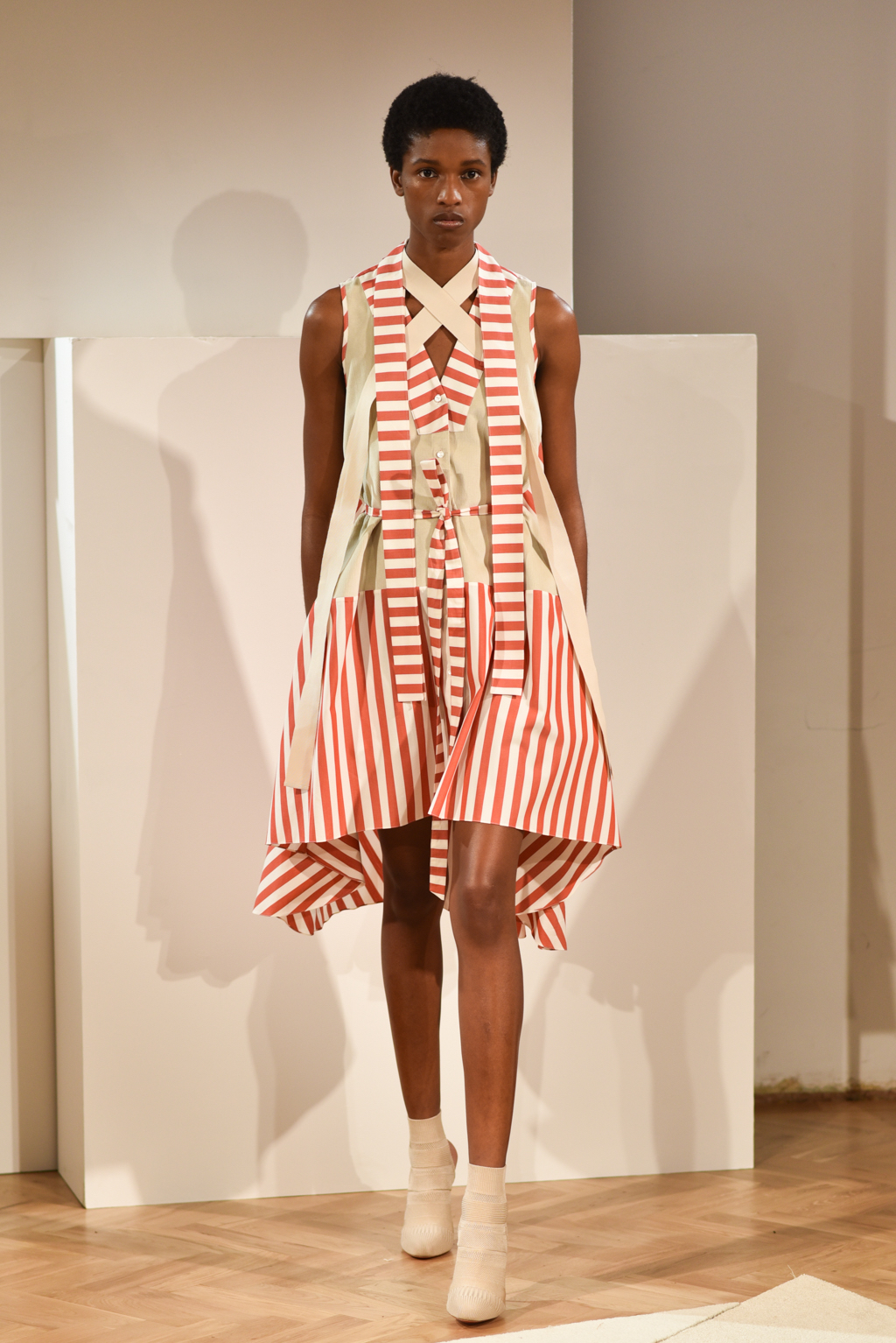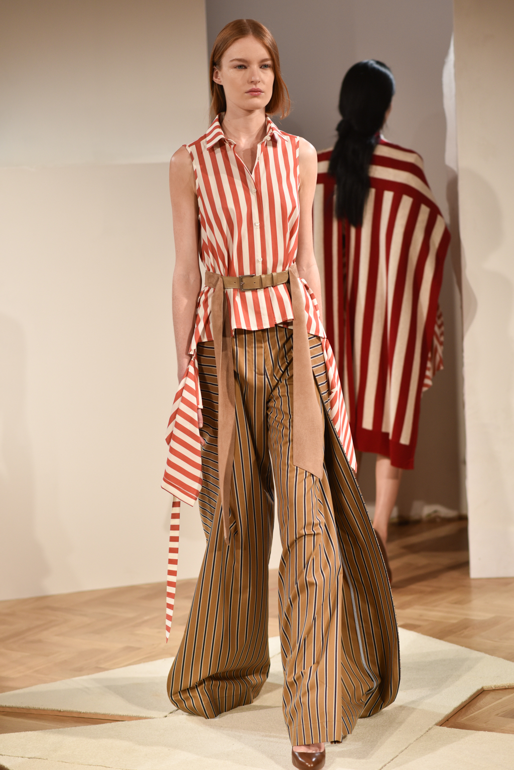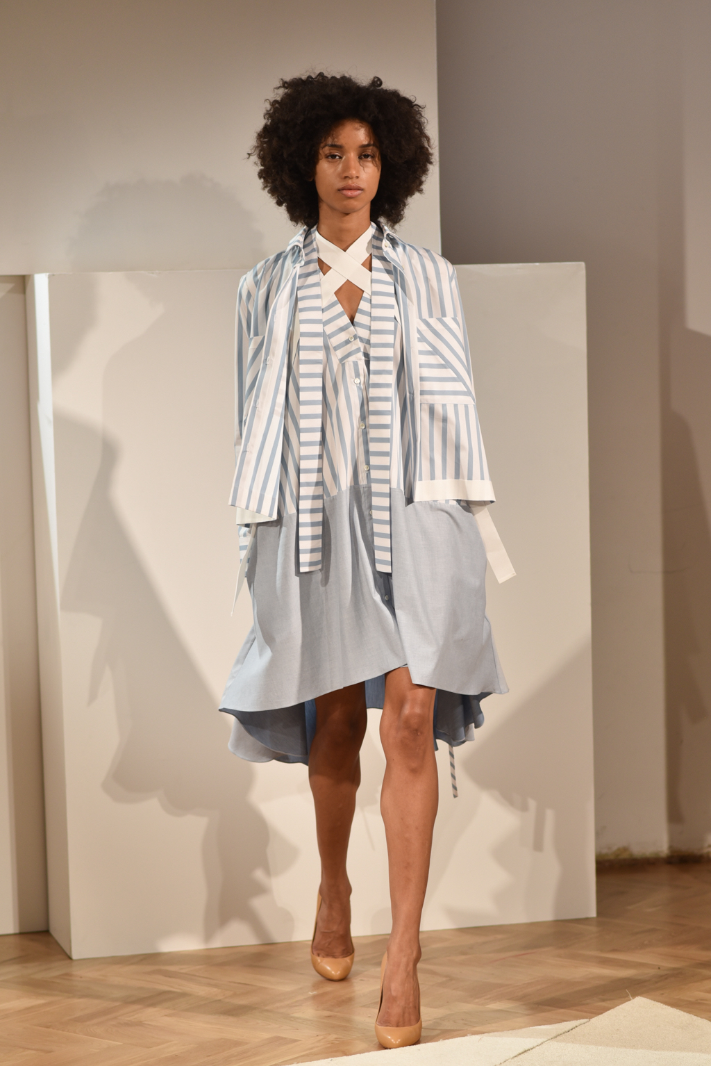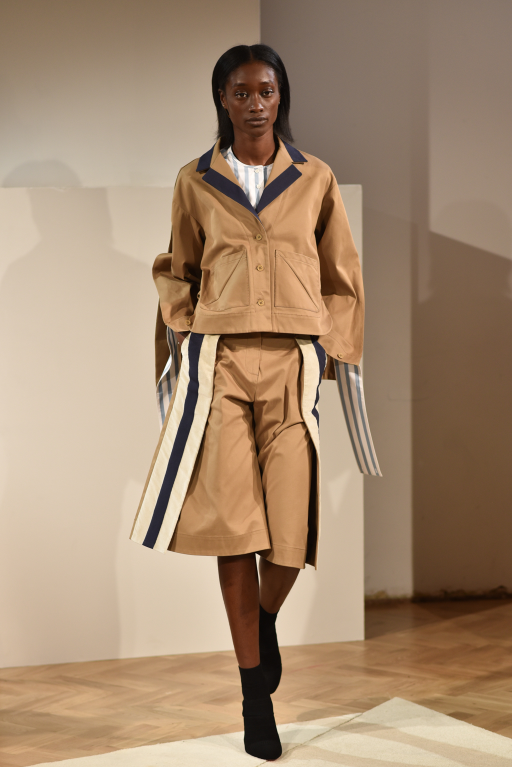 The colour palette and textures were laidback and had a nostalgic feel, but a graphic edge, courtesy of stripe patterns. Muted red, chambray, sky blue, olive and sand were key shades. A deliberate choice of natural fabrics was lifted through layering with robe-like belts and grosgrain trims.