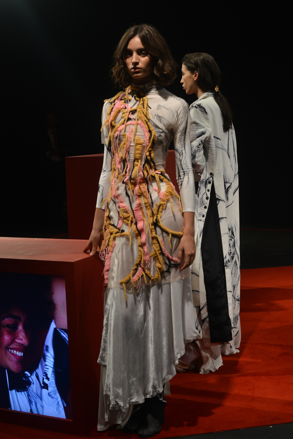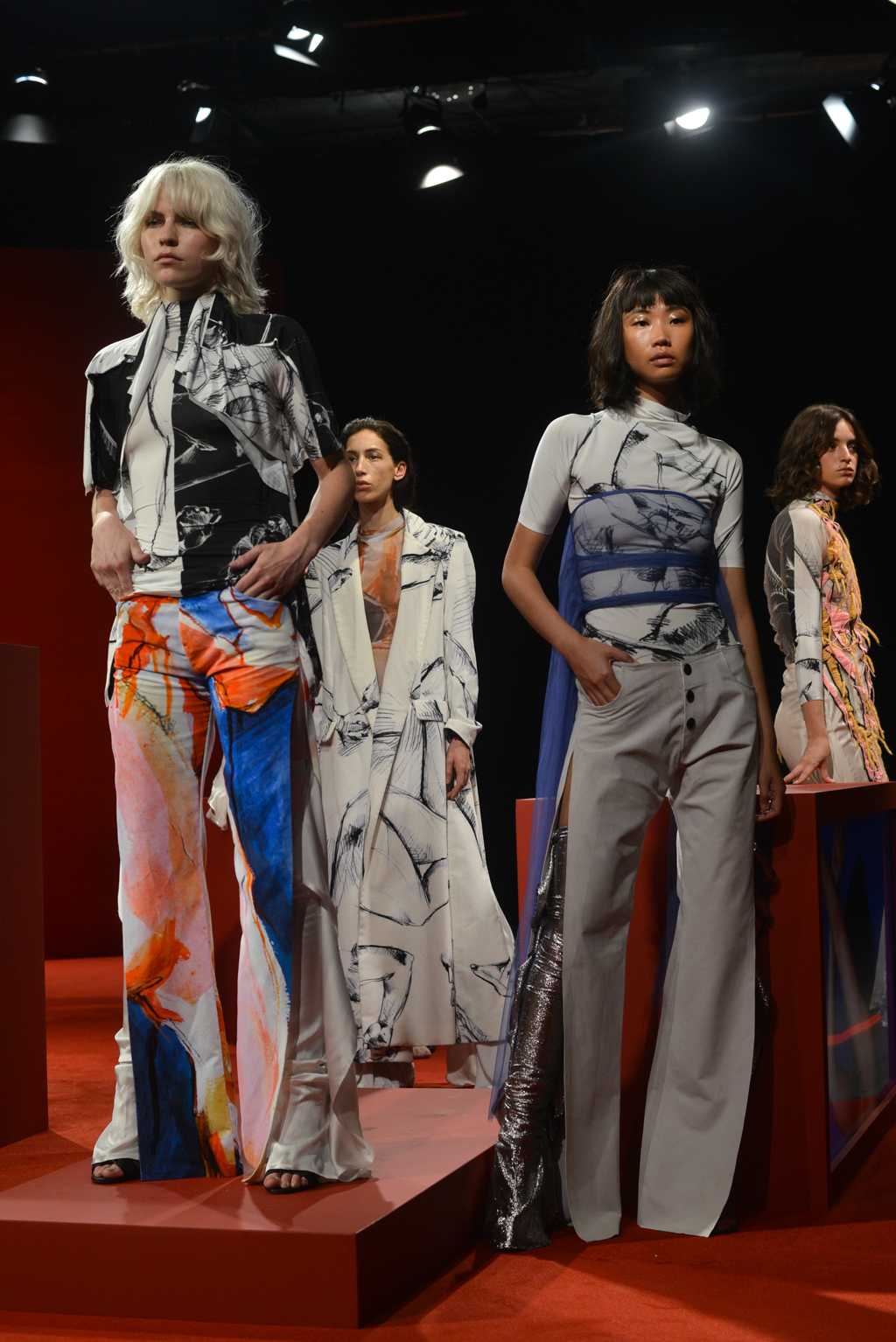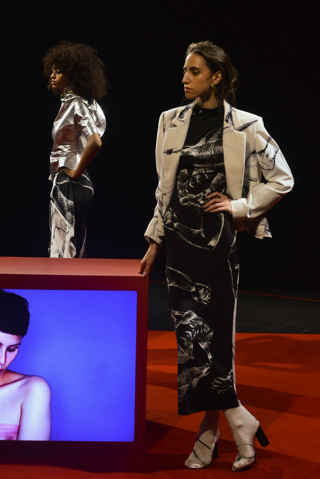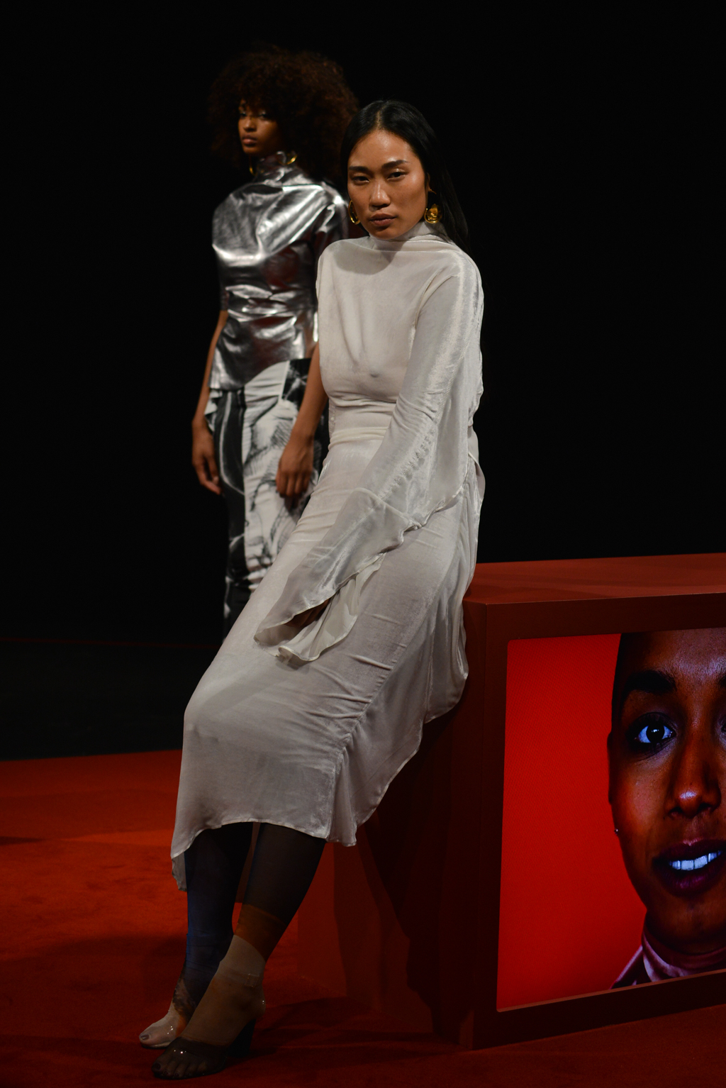 The backdrop of the presentation in the Mall’s Institute of Contemporary Arts is a bold red; screens are encased in red blocks and show lingering video shots of traditionally feminine facial features and interviews conducted as part of her MA at the RCA. These interviews posed questions as to participants’ understanding of womanhood – and the results are reflected in the collection.