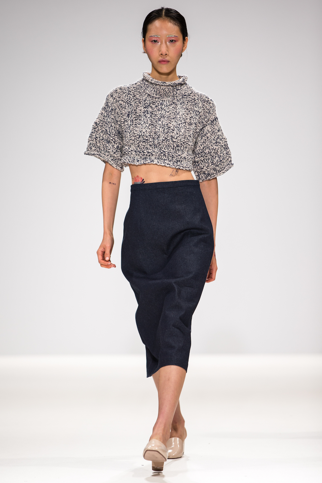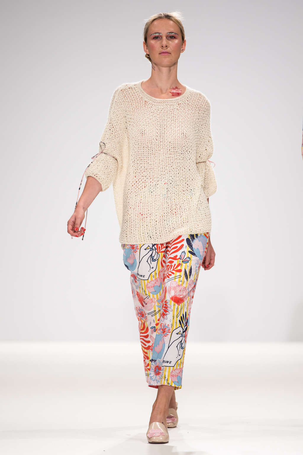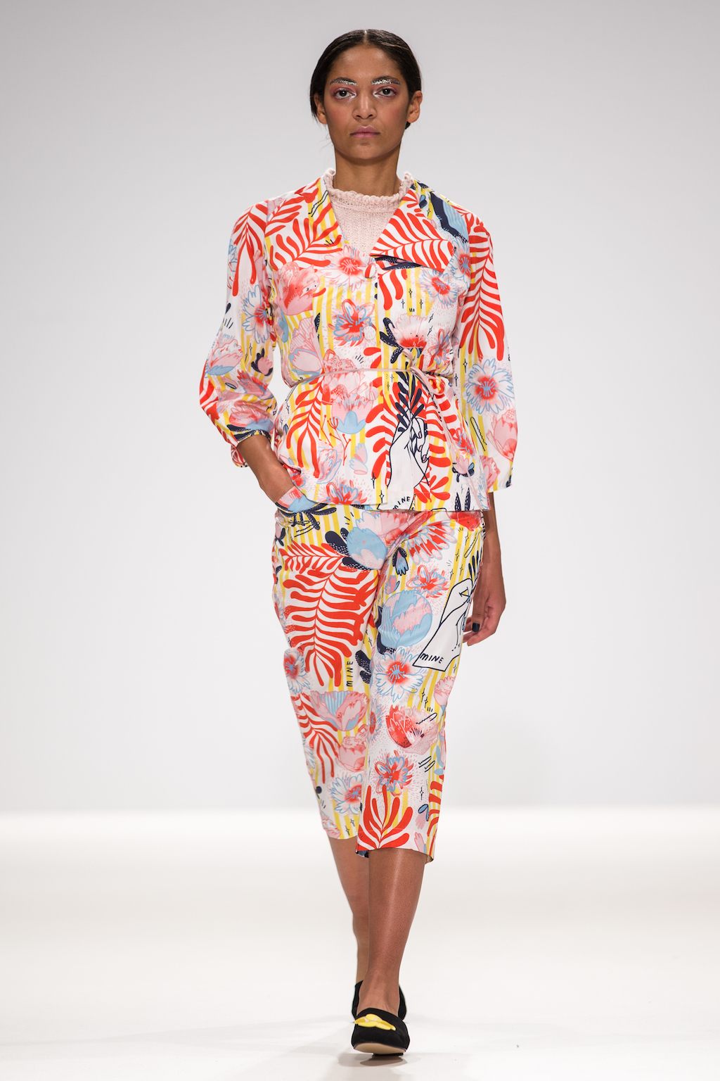 Appealing to that period of sibling rivalry and identity, the collection features silk shirts bearing cartoon hands with the phrase “mine not yours”. To amplify the old school feel, these appear under slip dresses and chunky, salt and pepper cropped jumpers – as other designers have done across NYFW (Rebecca Minkoff) and LFW ( Ashley Williams and Steventai).