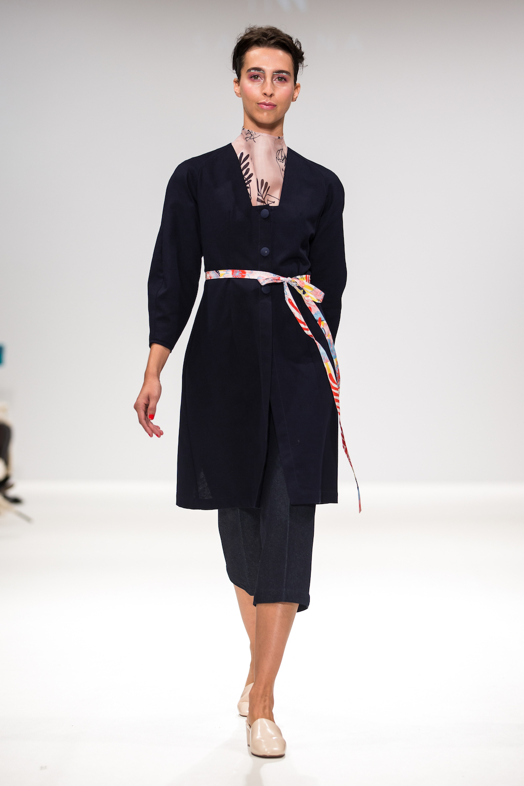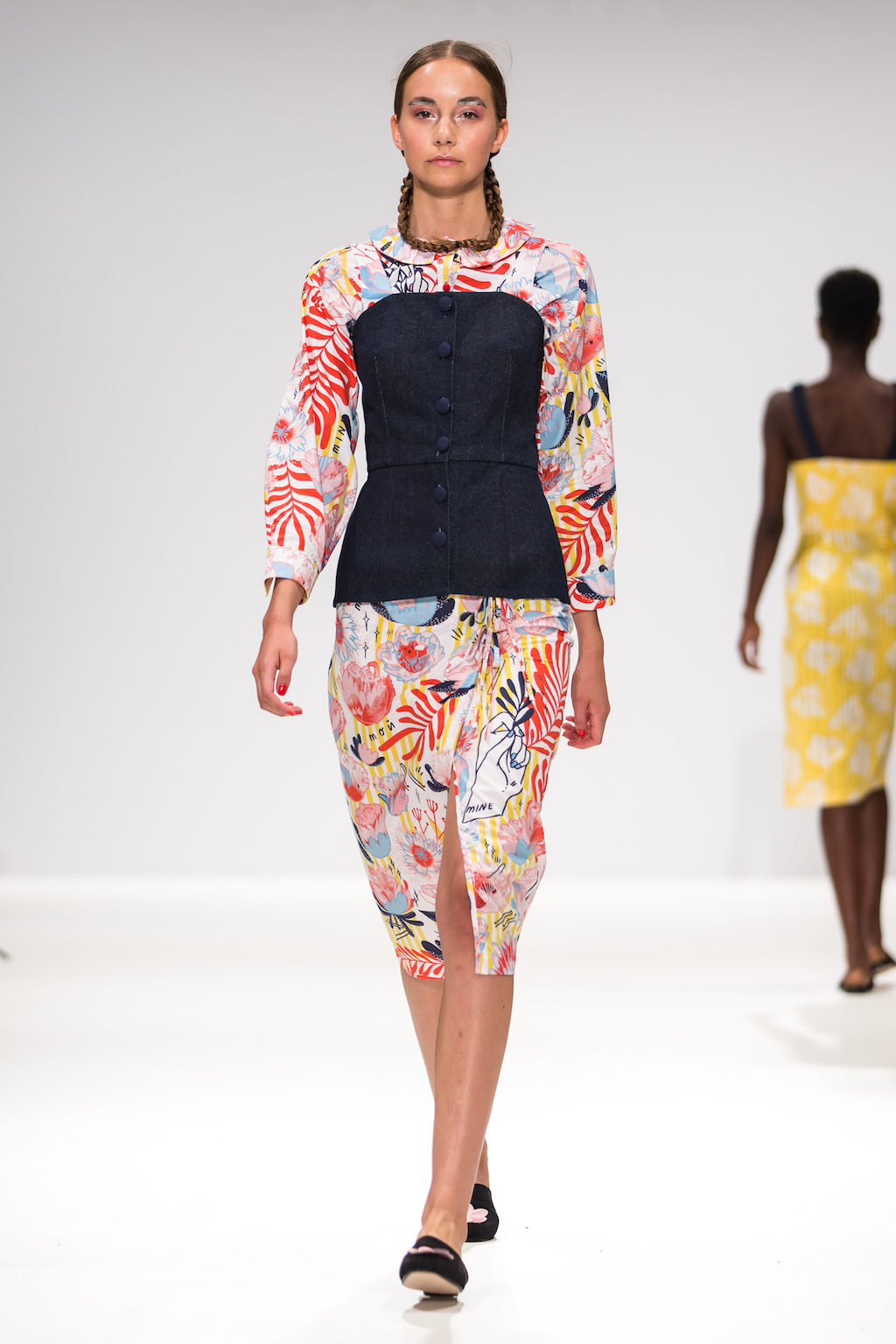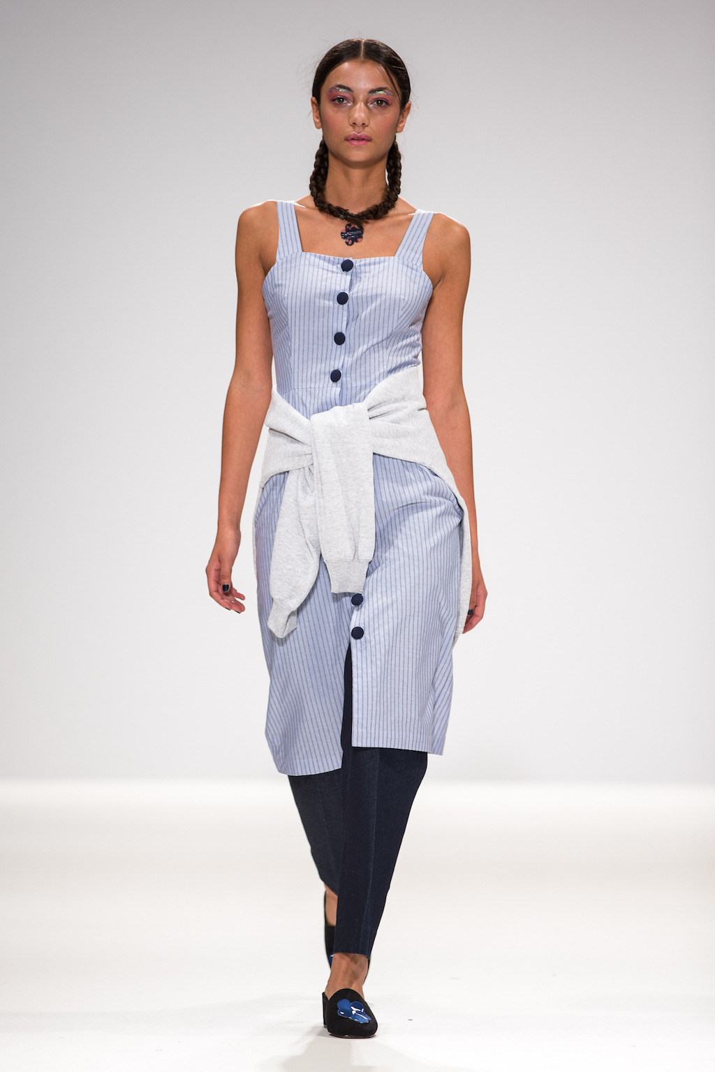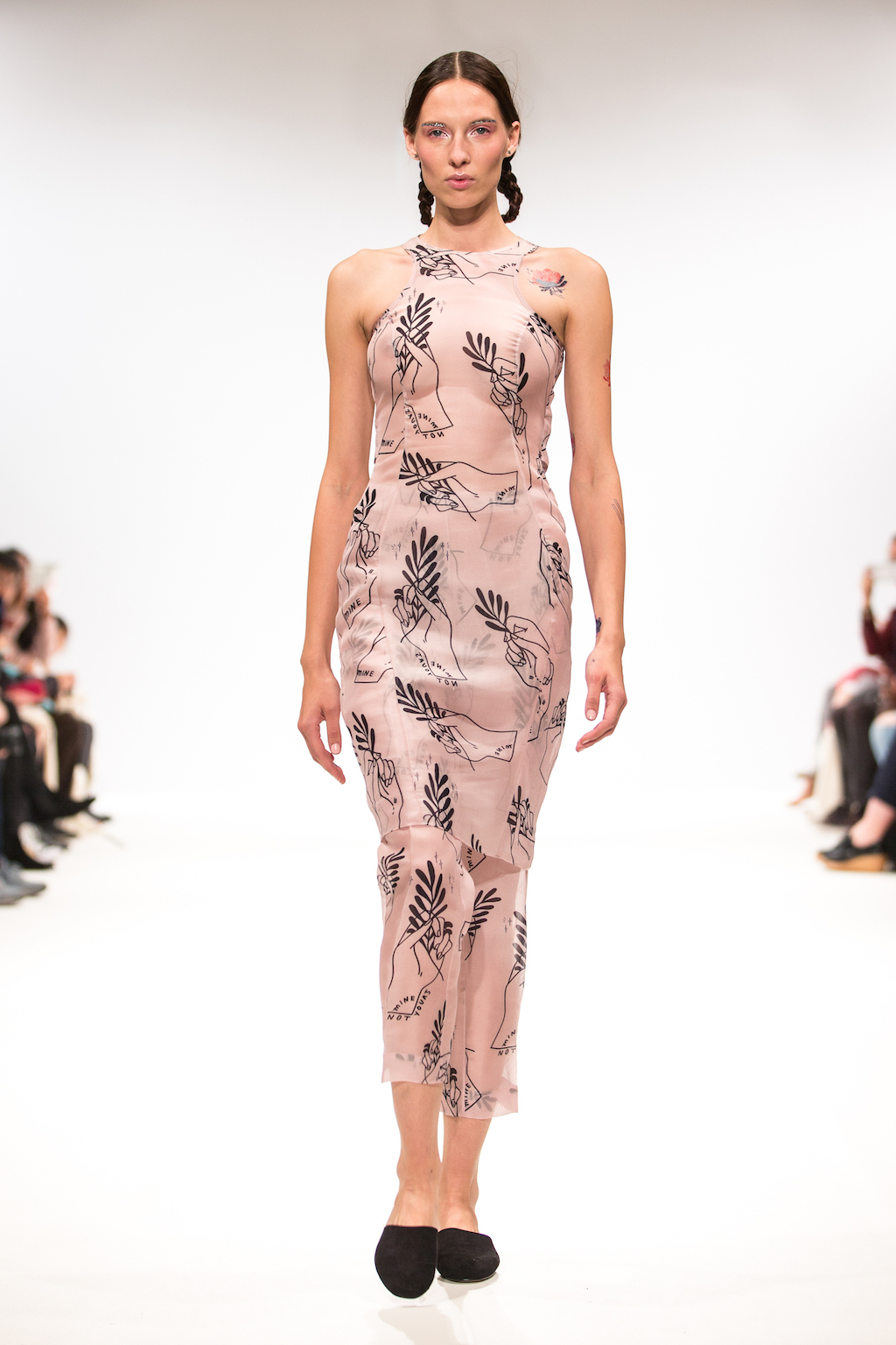 Appealing to that period of sibling rivalry and identity, the collection features silk shirts bearing cartoon hands with the phrase “mine not yours”. To amplify the old school feel, these appear under slip dresses and chunky, salt and pepper cropped jumpers – as other designers have done across NYFW (Rebecca Minkoff) and LFW ( Ashley Williams and Steventai).