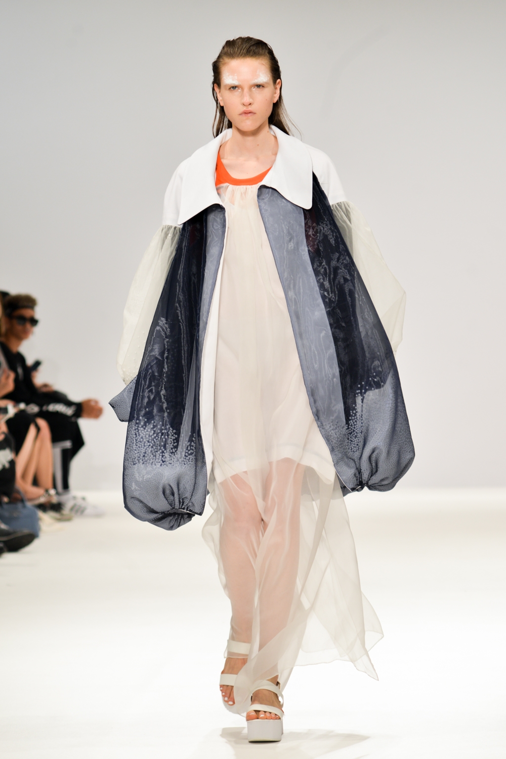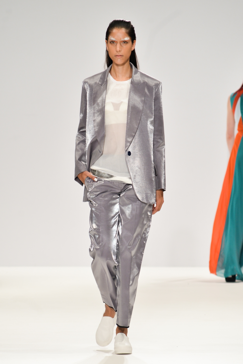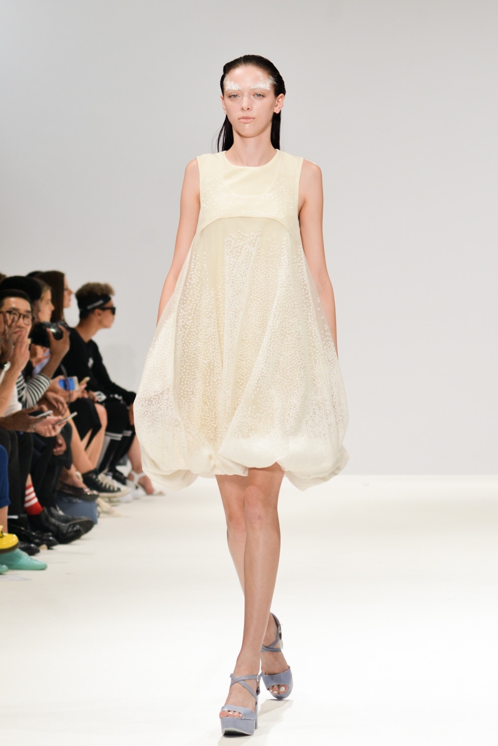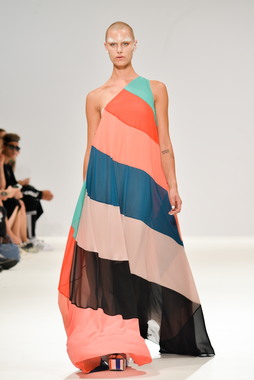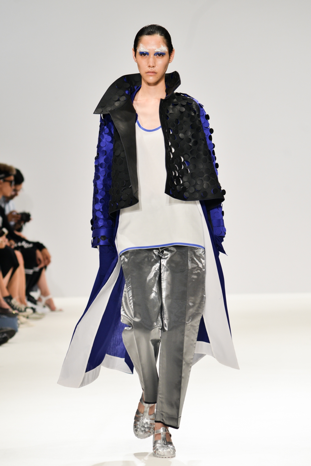 Dresses were gathered and cinched in with ties around the waist and oversized collars on short boxy jackets also featuring the signature laser cutting. This collection was not only cleverly colourful, childlike and playful in spirit but also extremely well-constructed and strong. I am sure Cimone will go from strength to strength and judging from the huge cheer at the finale, I am not the only one.