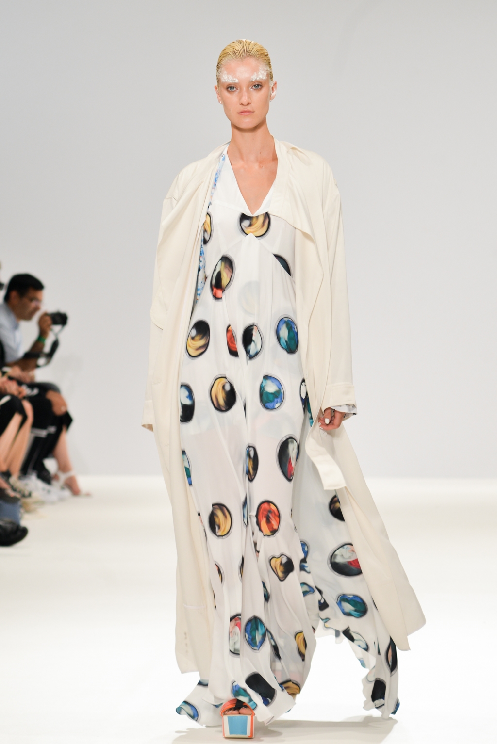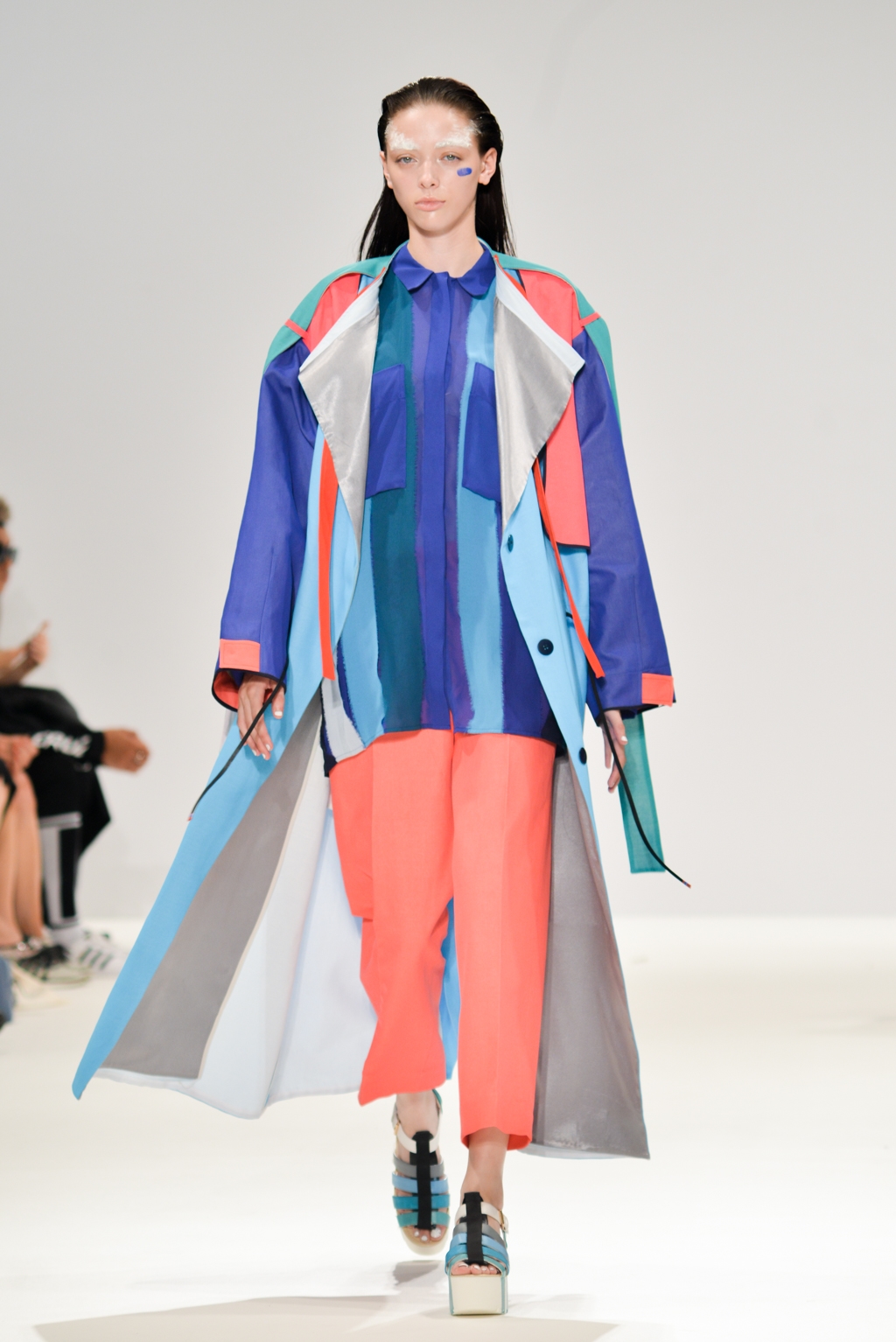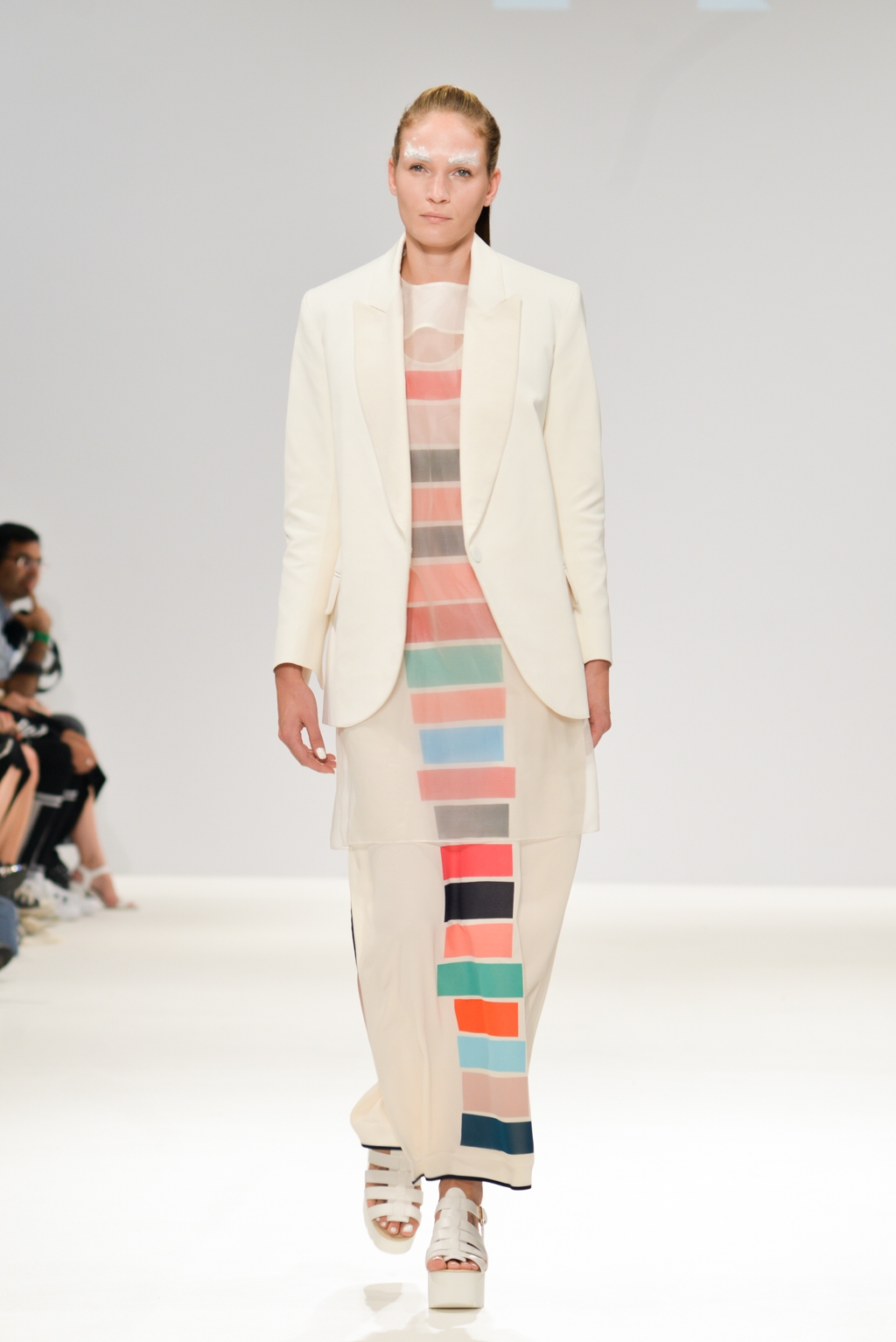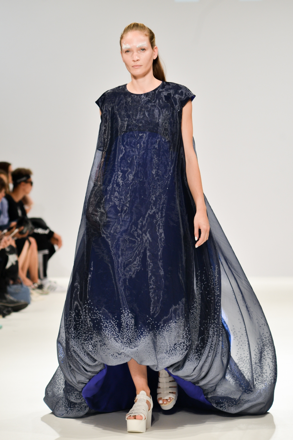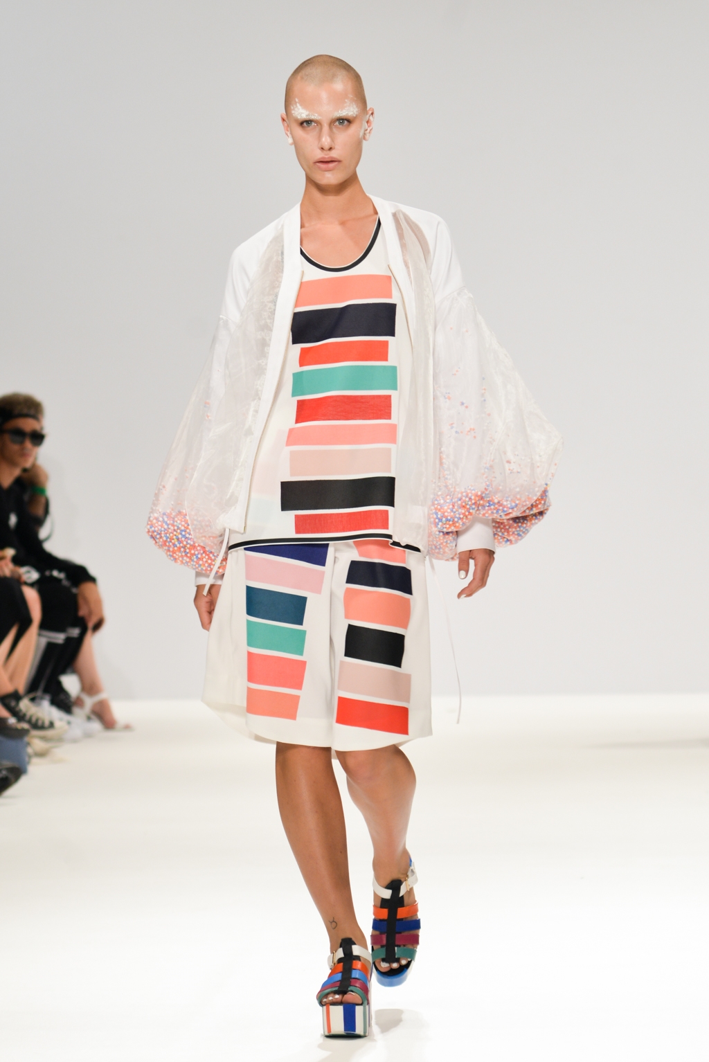 Dresses were gathered and cinched in with ties around the waist and oversized collars on short boxy jackets also featuring the signature laser cutting. This collection was not only cleverly colourful, childlike and playful in spirit but also extremely well-constructed and strong. I am sure Cimone will go from strength to strength and judging from the huge cheer at the finale, I am not the only one.