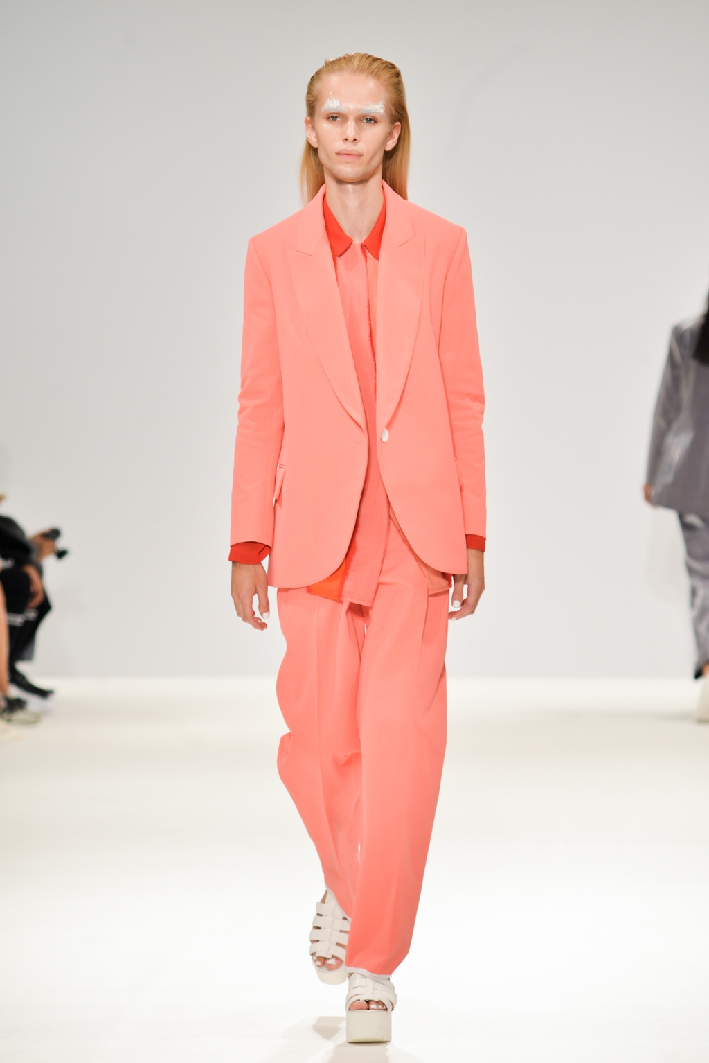 The pieces were carefully designed to be worn both inside and out, and for both genders interchangeably. Eyebrows were thickly plastered in white paint, again echoing this painterly-inspired collection. Intricate coin-sized circles were laser cut into top layers of dresses and jackets, showing bold reds and orange silks peeking through the underneath.