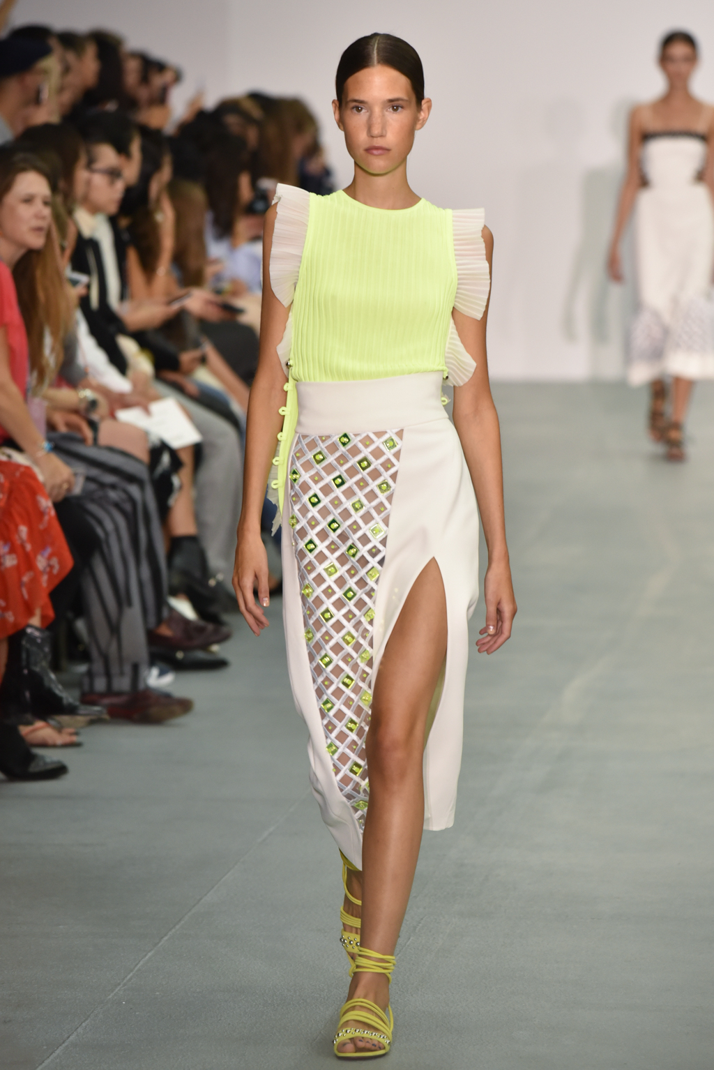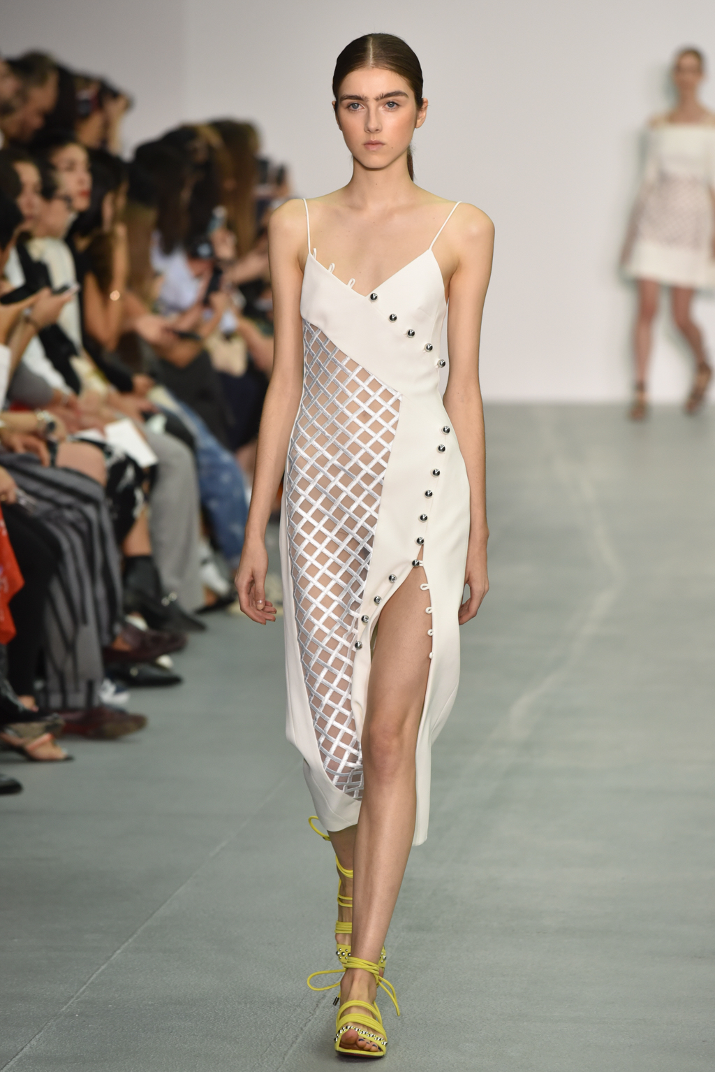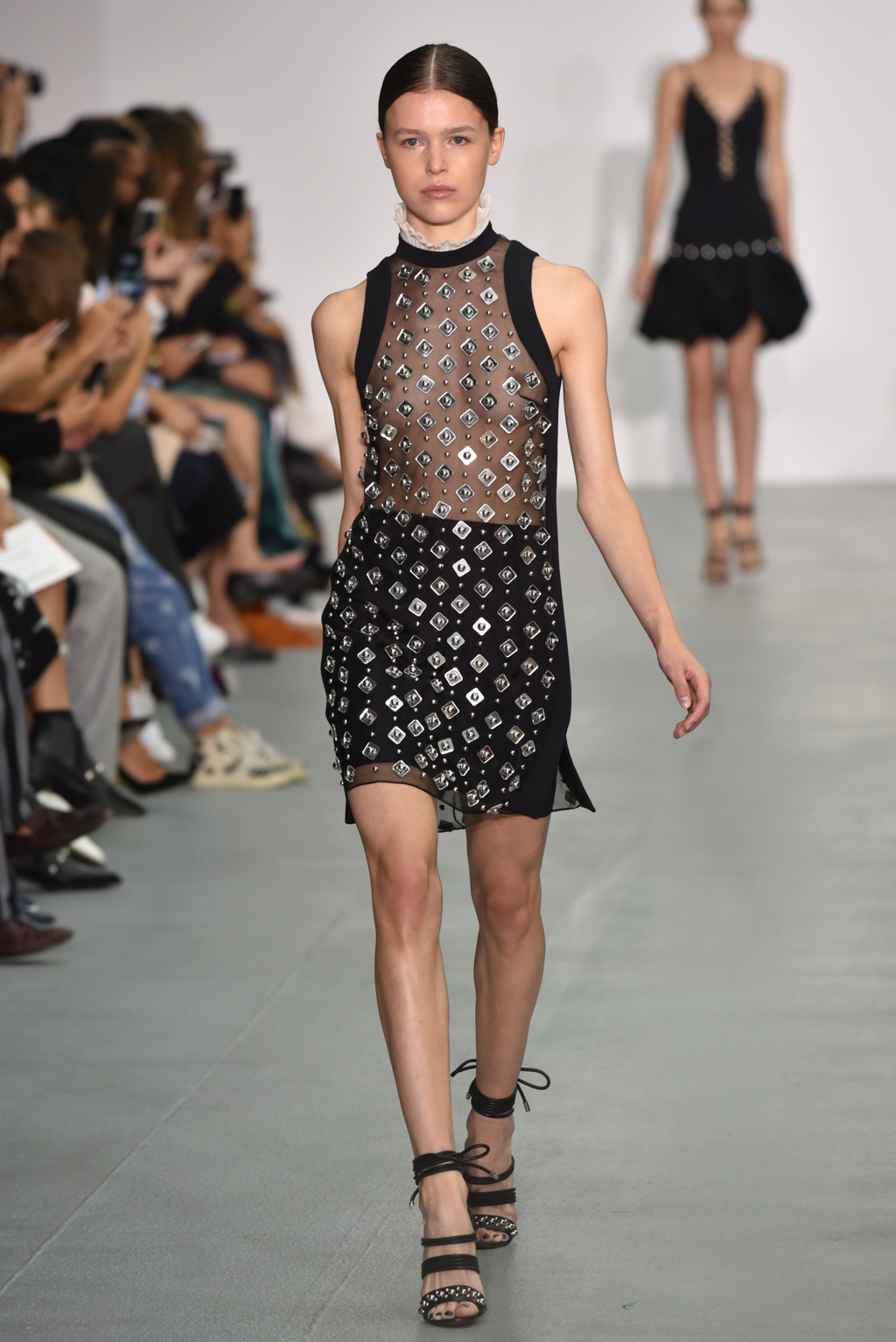 A neat diamond pattern linked the various dresses, skirts, tops and jumpsuits; sometimes, these diamonds shimmered as silver sequins, whilst at other points they were cut into sheer inserts at a hemline or a waist. Indeed, sheer panels that revealed a glimpse at the body beneath were another recurring theme, adding an edgy sensuality to the cocktail dresses and jumpsuits that dominated the catwalk.