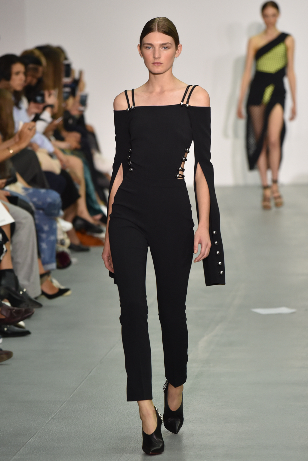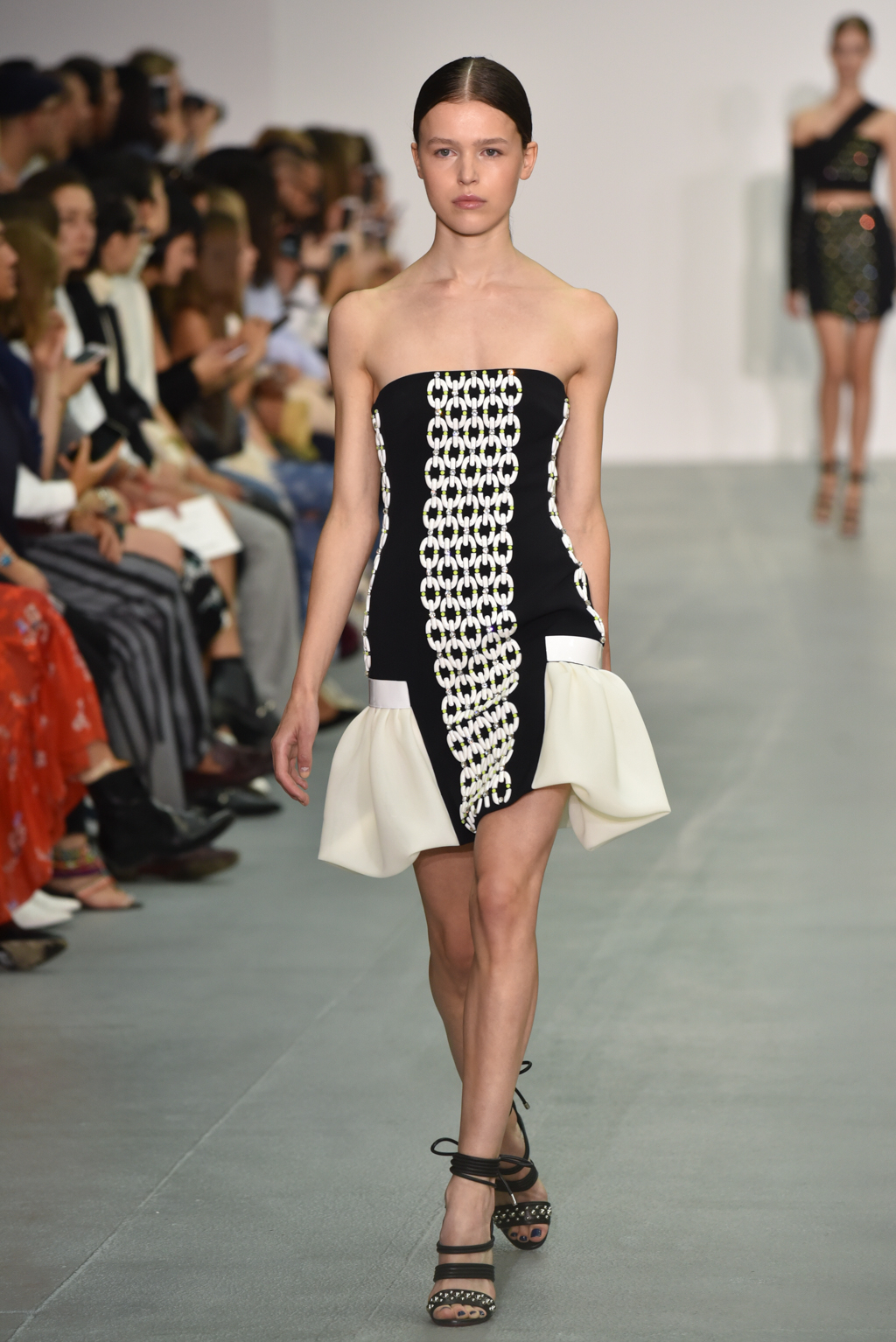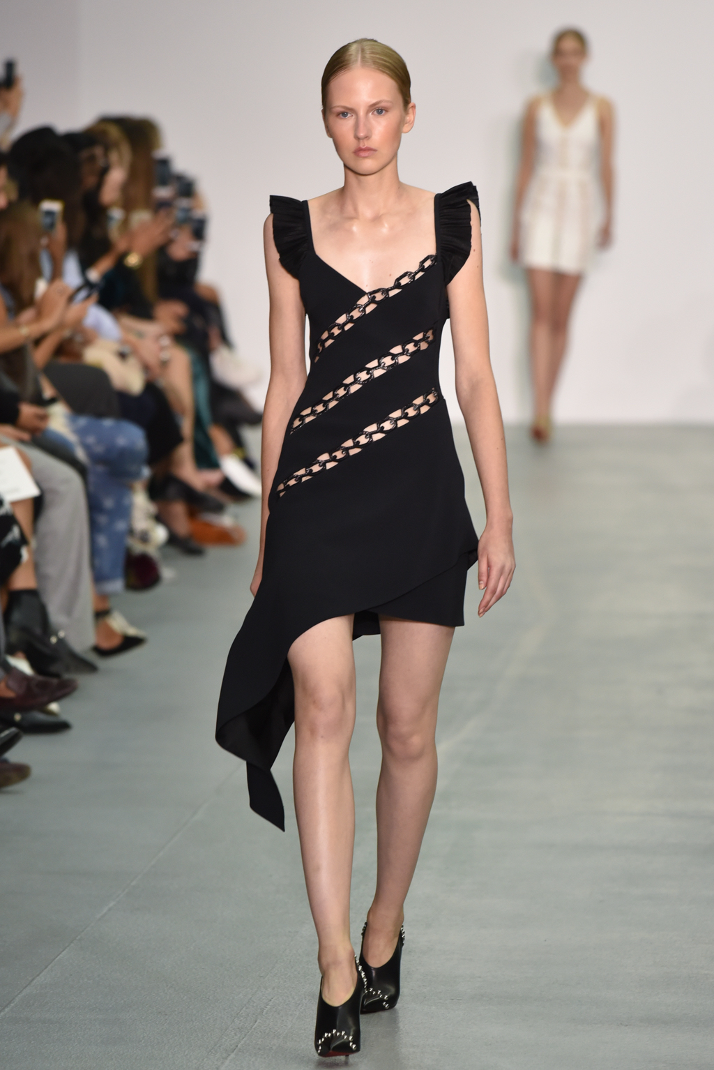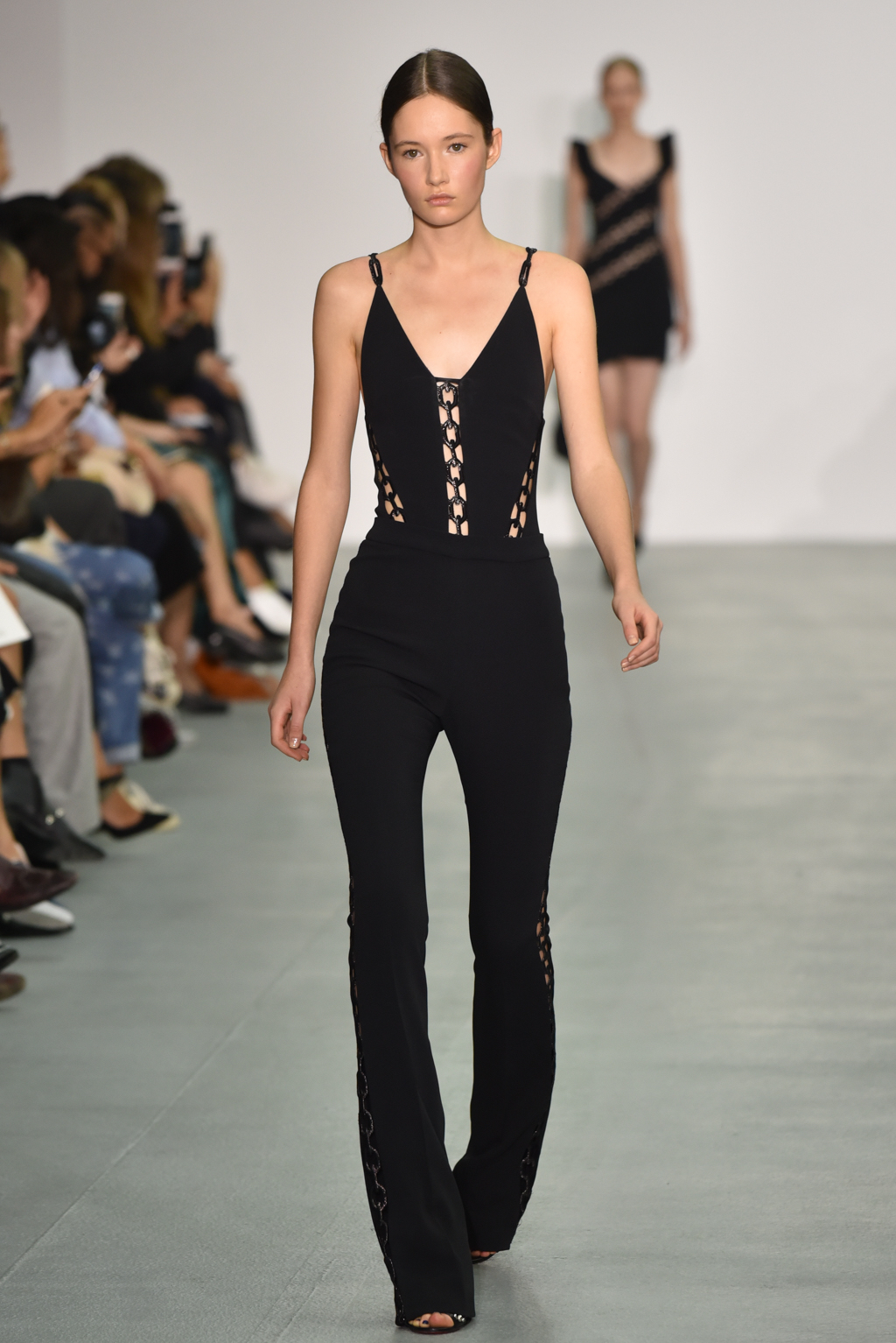 As the collection continued, a chain-like motif seemed to emerge, cutting itself through the often skin-tight fabric and then wrapping around the form to tantalising effect. A collection of black jumpsuits, meanwhile, offered a stylish evening-ready alternative to the standard cocktail dress.