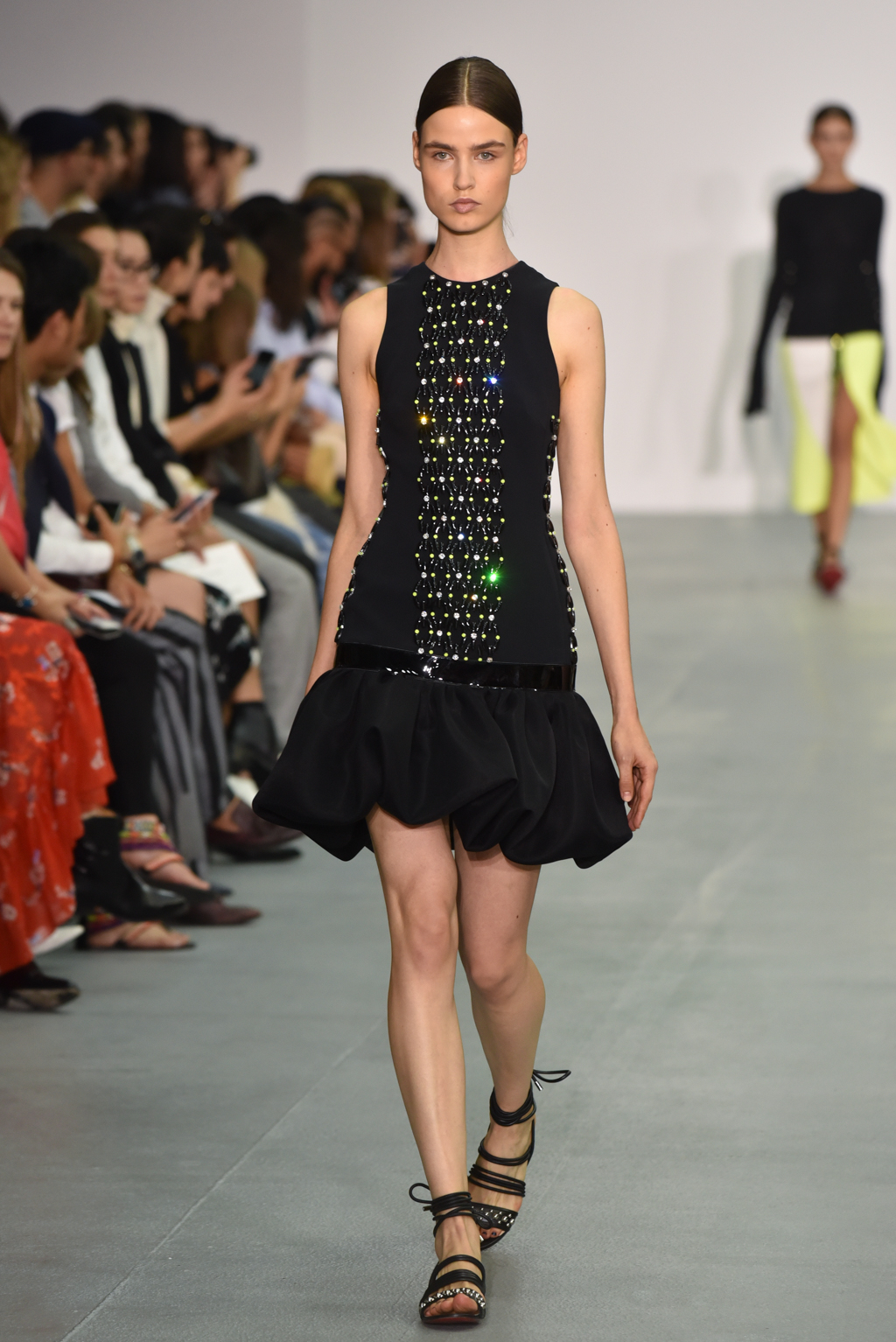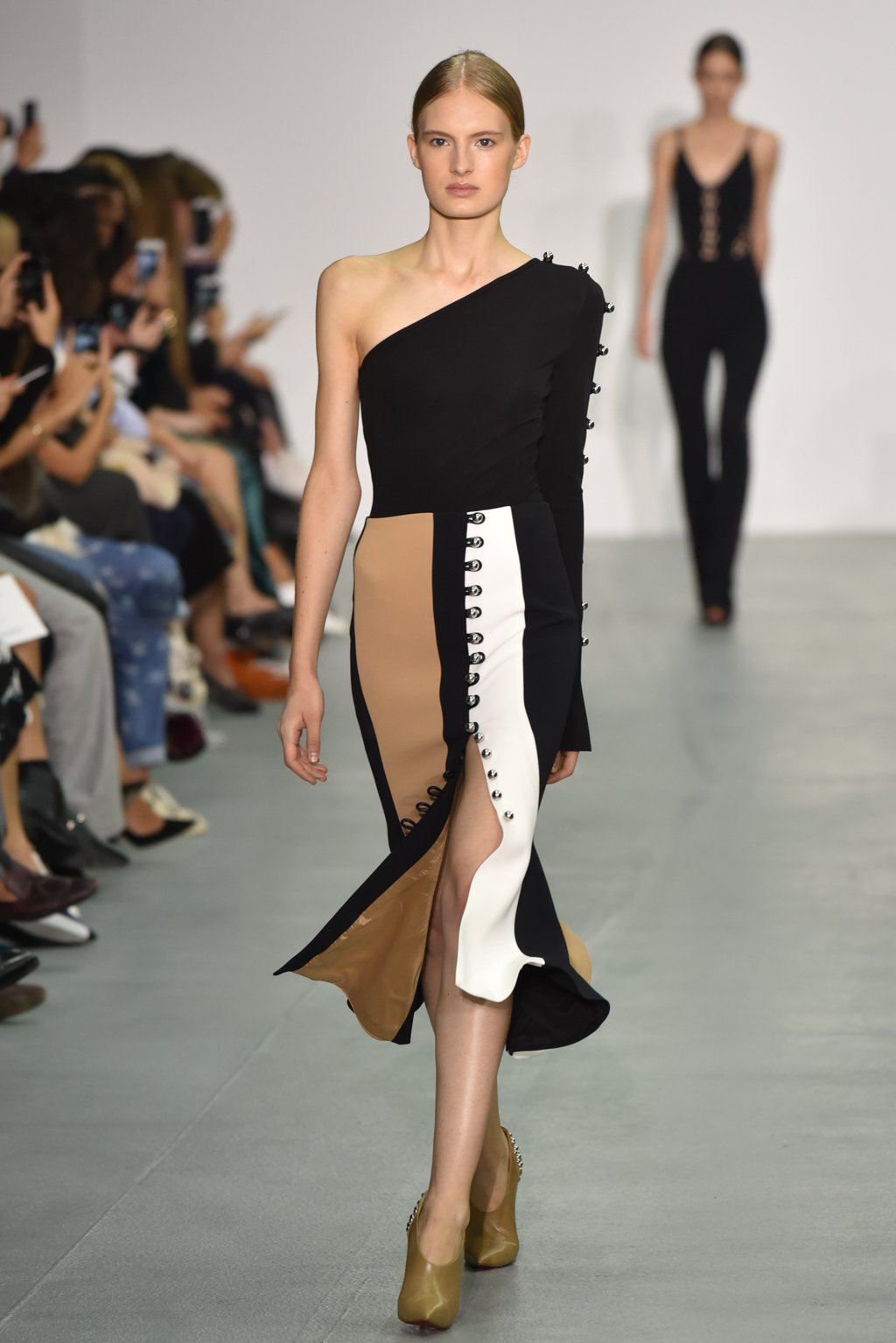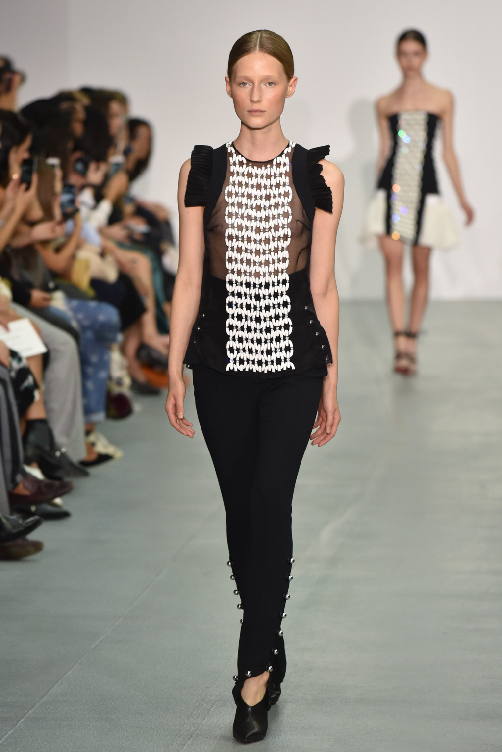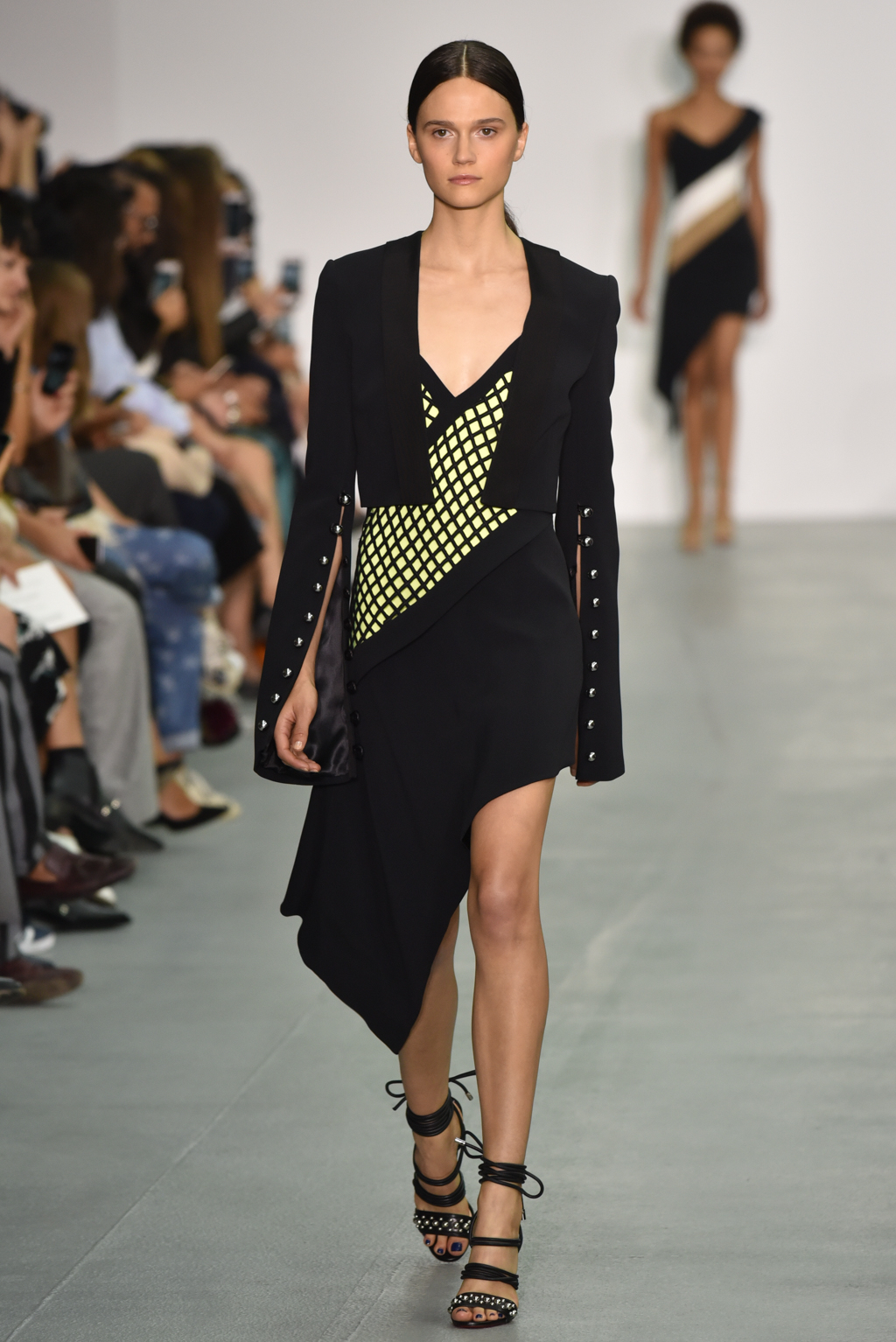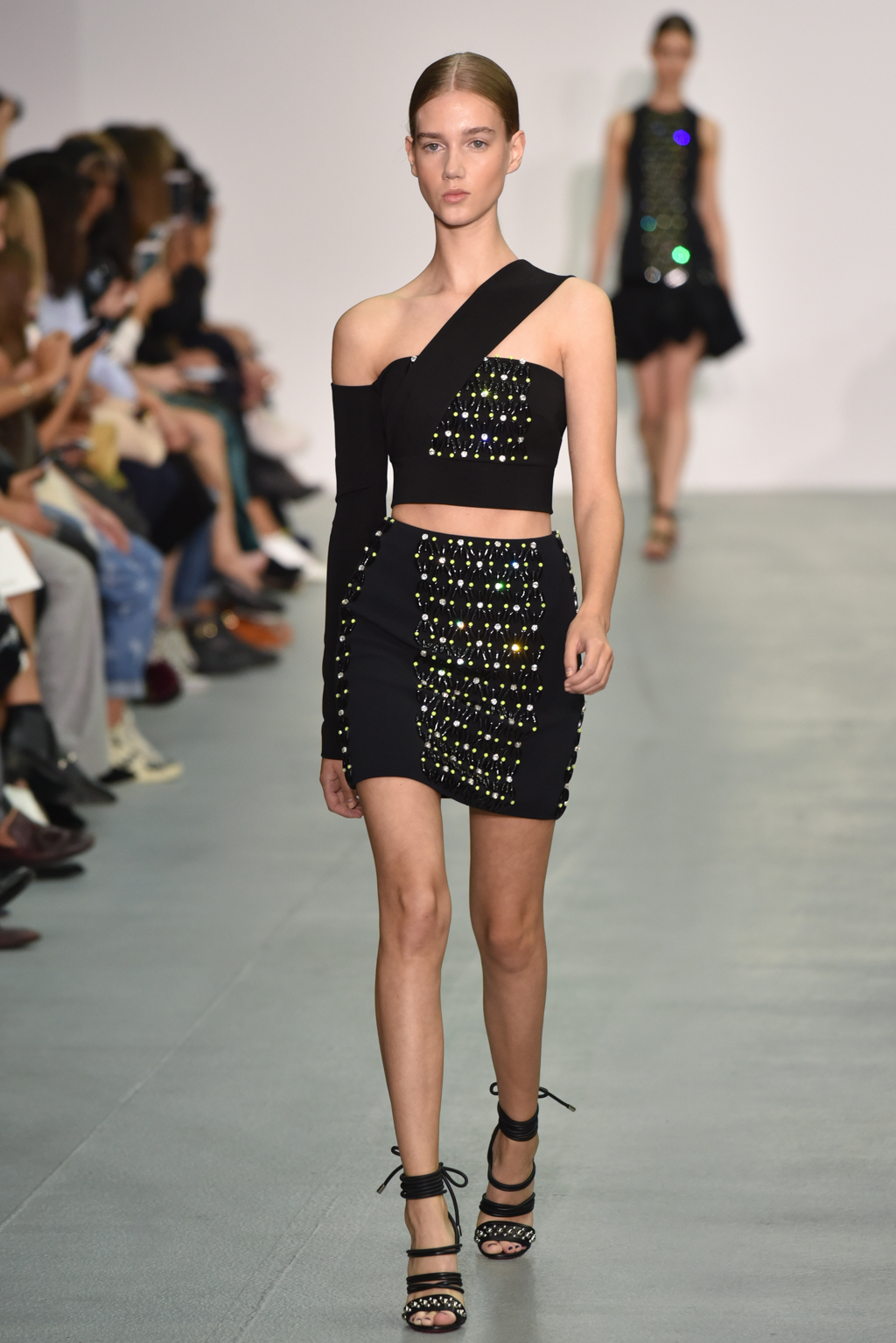 As the collection continued, a chain-like motif seemed to emerge, cutting itself through the often skin-tight fabric and then wrapping around the form to tantalising effect. A collection of black jumpsuits, meanwhile, offered a stylish evening-ready alternative to the standard cocktail dress.