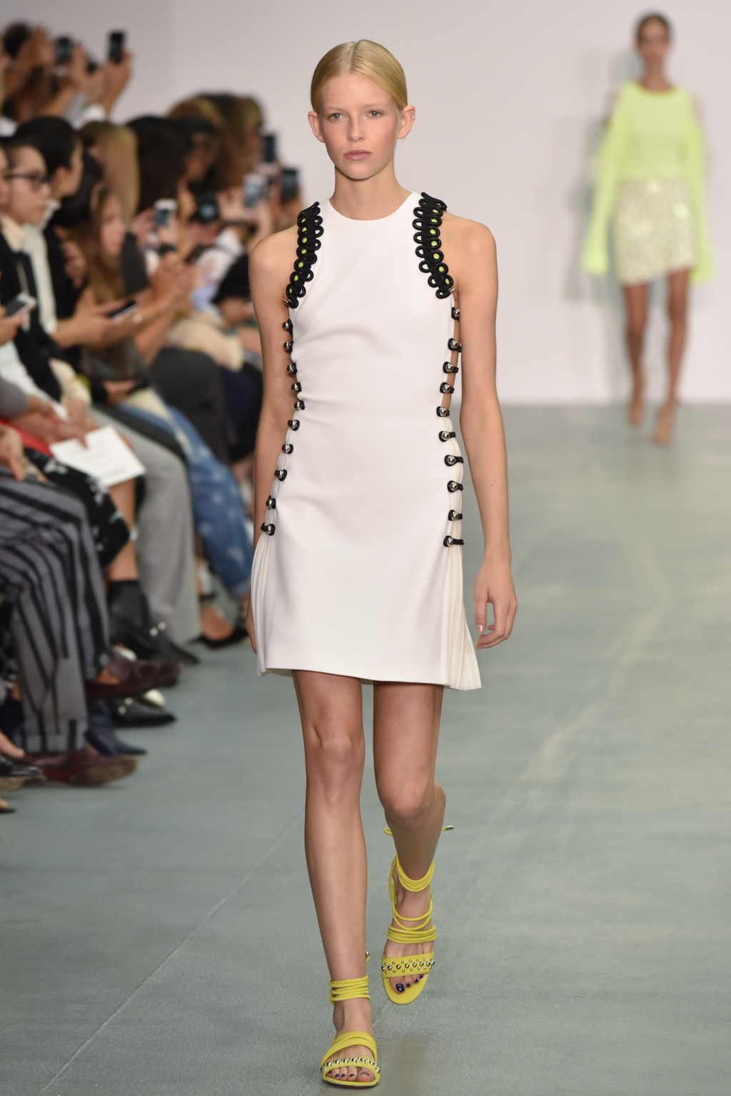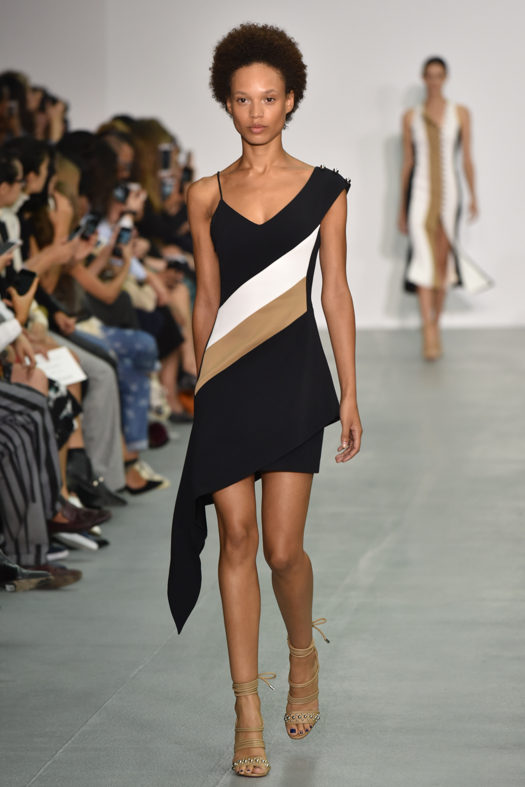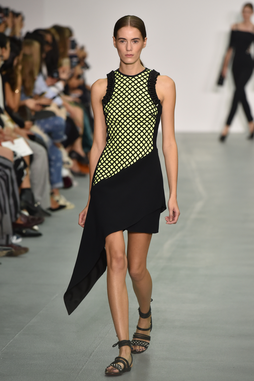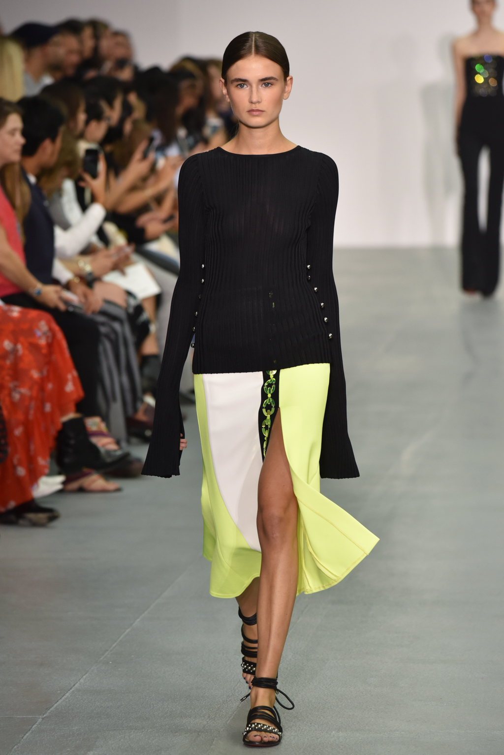 As the collection continued, a chain-like motif seemed to emerge, cutting itself through the often skin-tight fabric and then wrapping around the form to tantalising effect. A collection of black jumpsuits, meanwhile, offered a stylish evening-ready alternative to the standard cocktail dress.