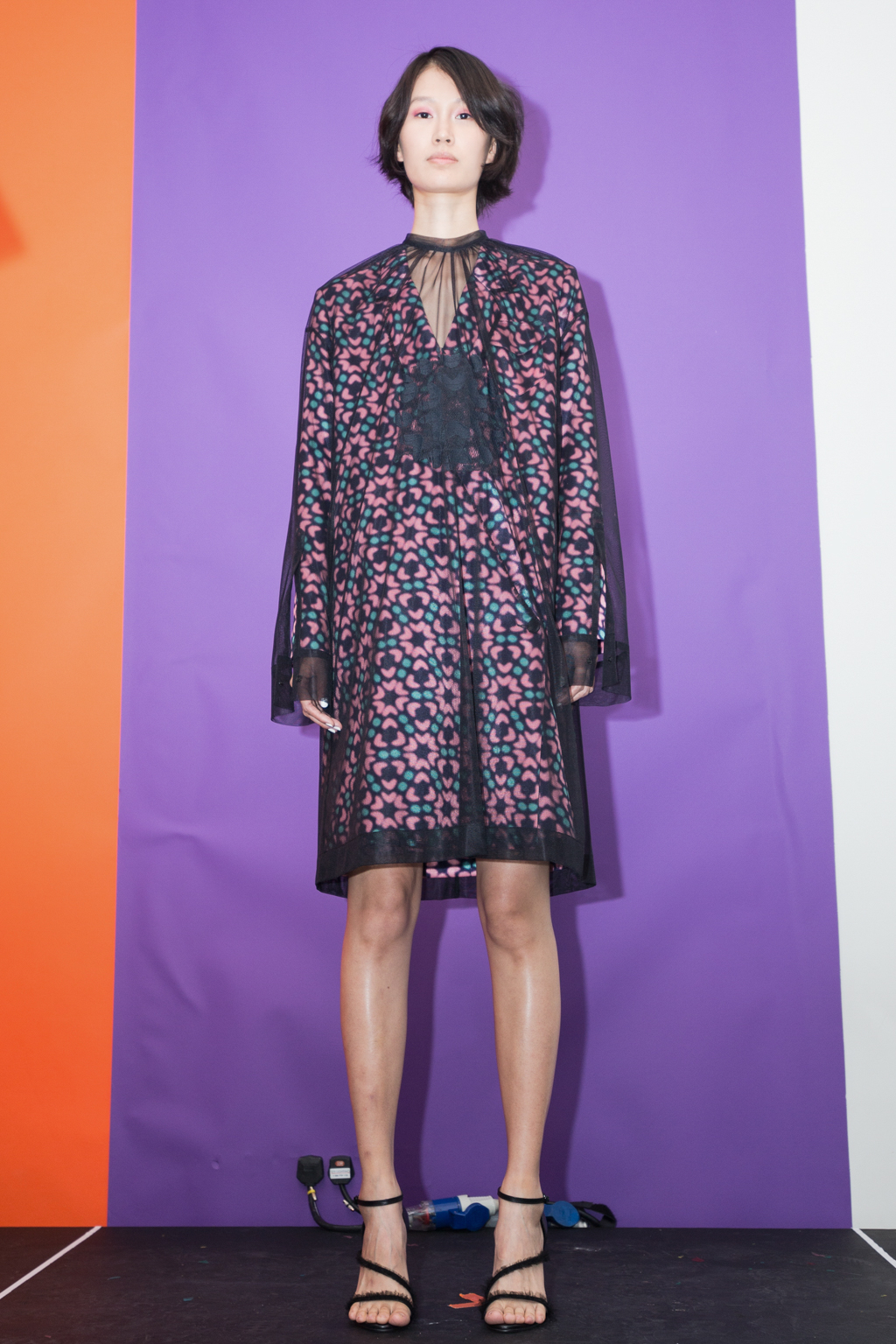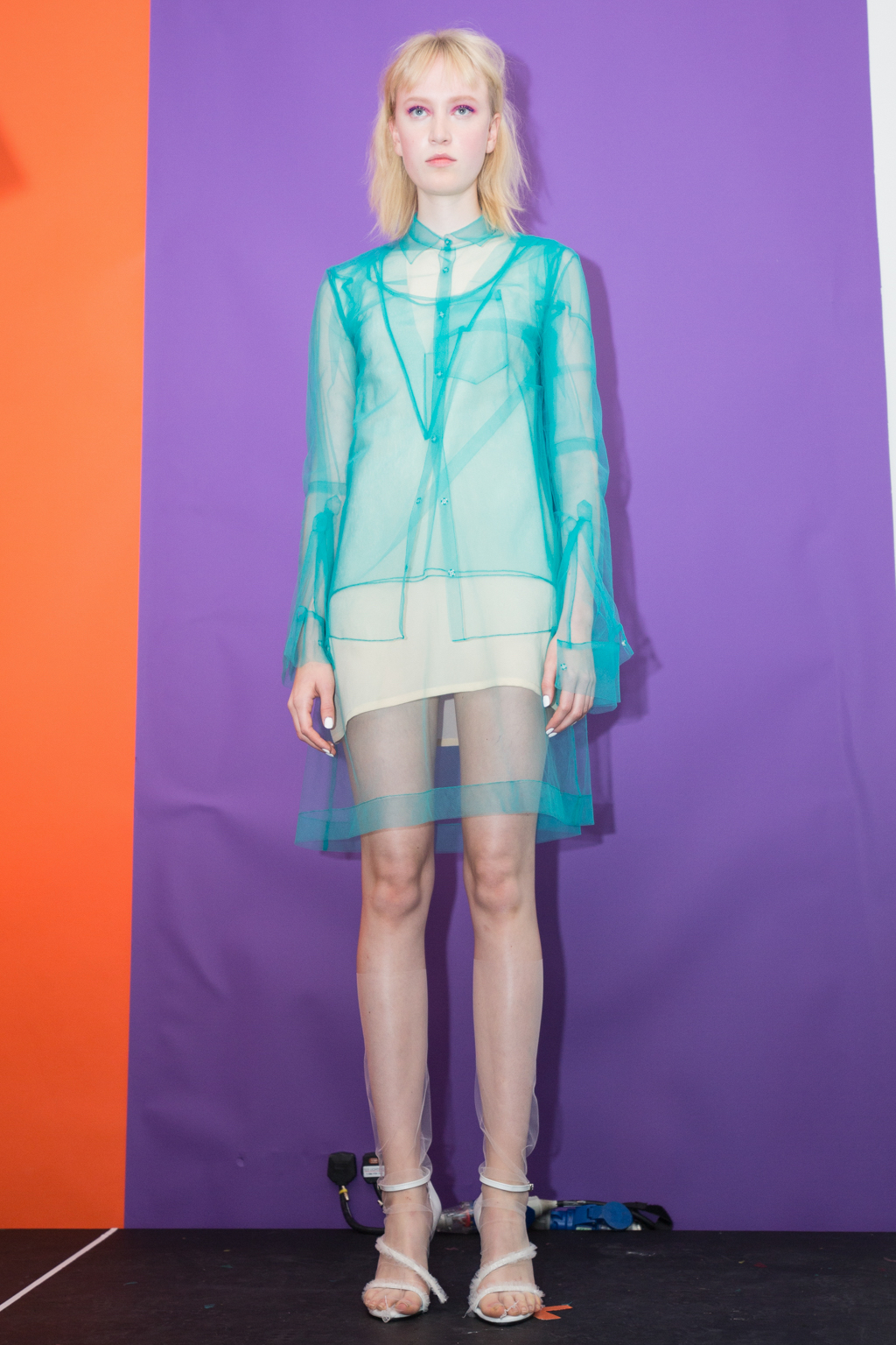 Titled School of Thought: The Class of SS17 and described as an installation and presentation hybrid, with filmmaker and photographers Eamonn Freel and Henry Gorse providing the set and music design. The models walked pausing for a spin around the revolving dance floor and stopping in front of a backdrop of splashes of primary paint box colours to showcase the collection. Diaphanous tulle, box shouldered overcoats with were worn layered over white shirting school dresses with scalloped black, white and forest green piping, all slightly off-centre and hallucinogenic.