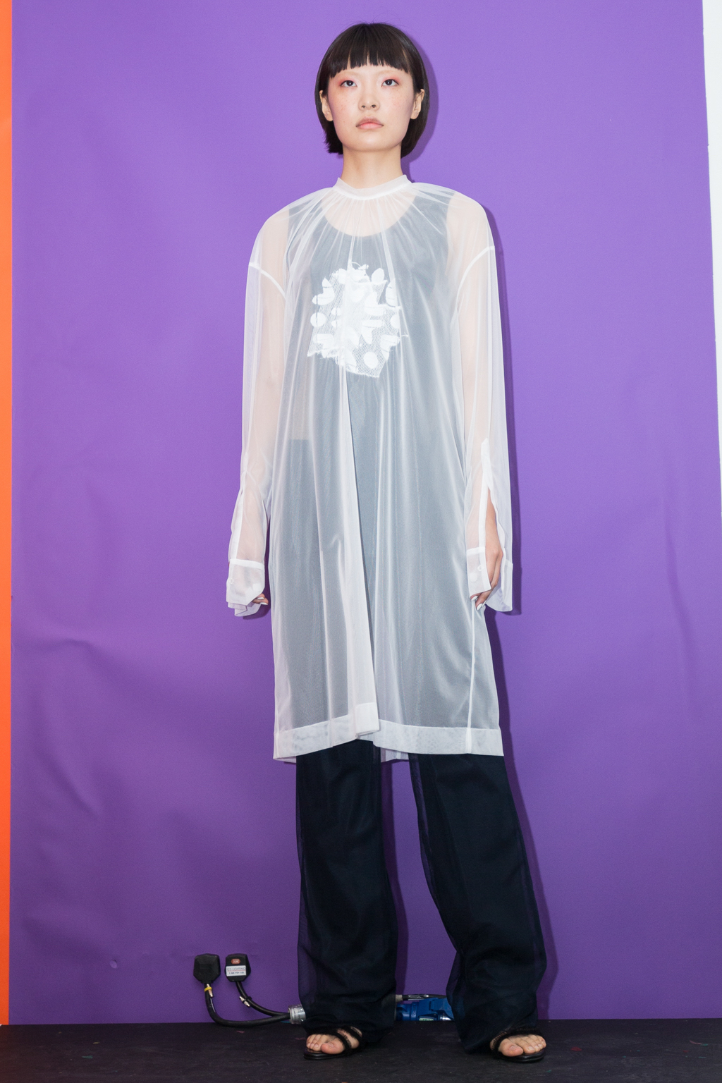 Skirts were high but hidden under the tulle, as Lee aimed for the transparent layering to echo the individuality of her schoolgirls. Influenced by sculptor and artist Angela de la Cruz to create an almost dual personality or split to her pieces, she added oversized and faintly hidden, skewed pockets and plackets, asymmetric waists and uneven or mismatched hems to her designs.