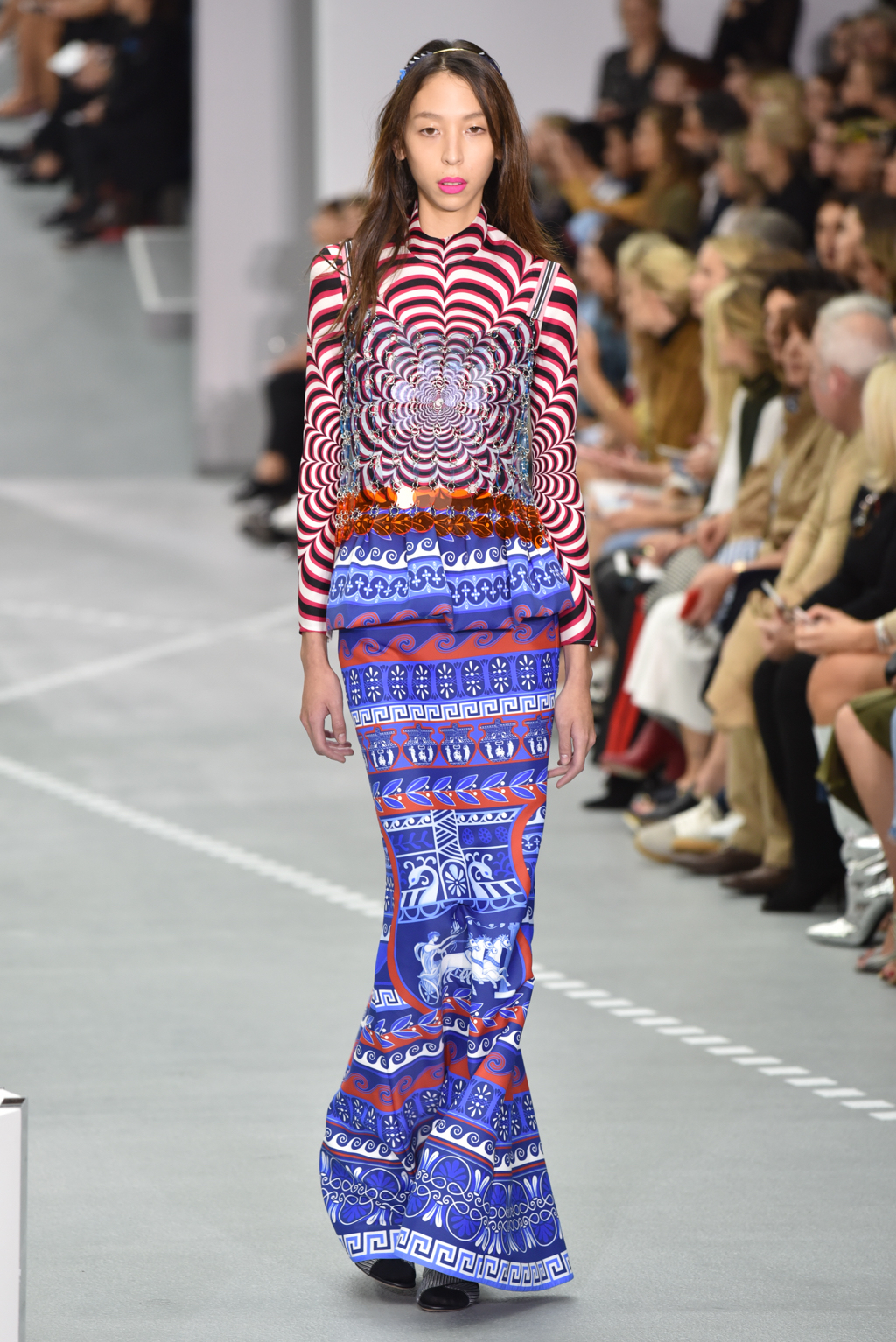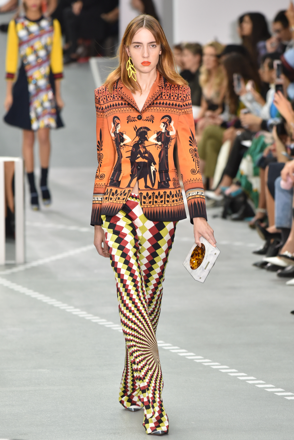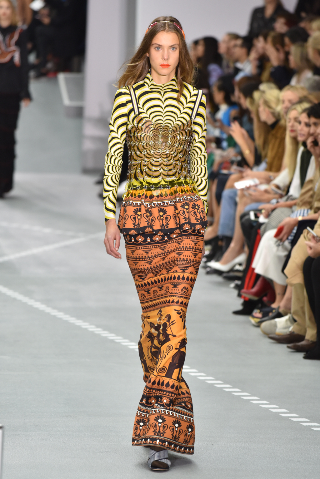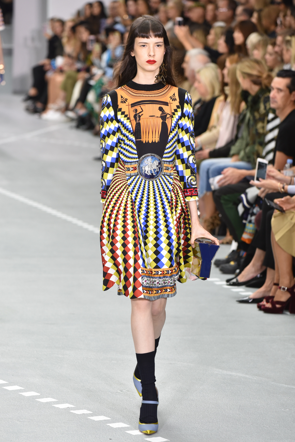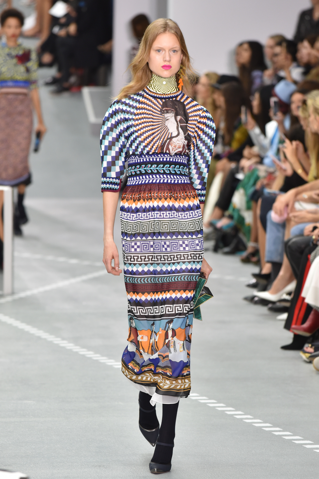 Mary Katrantzou today offered a statement Spring 2017 collection characterised by bold colours, psychedelic prints and Ancient Egyptian-inspired motifs.