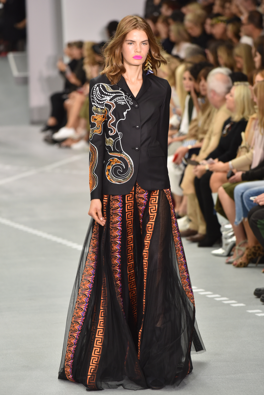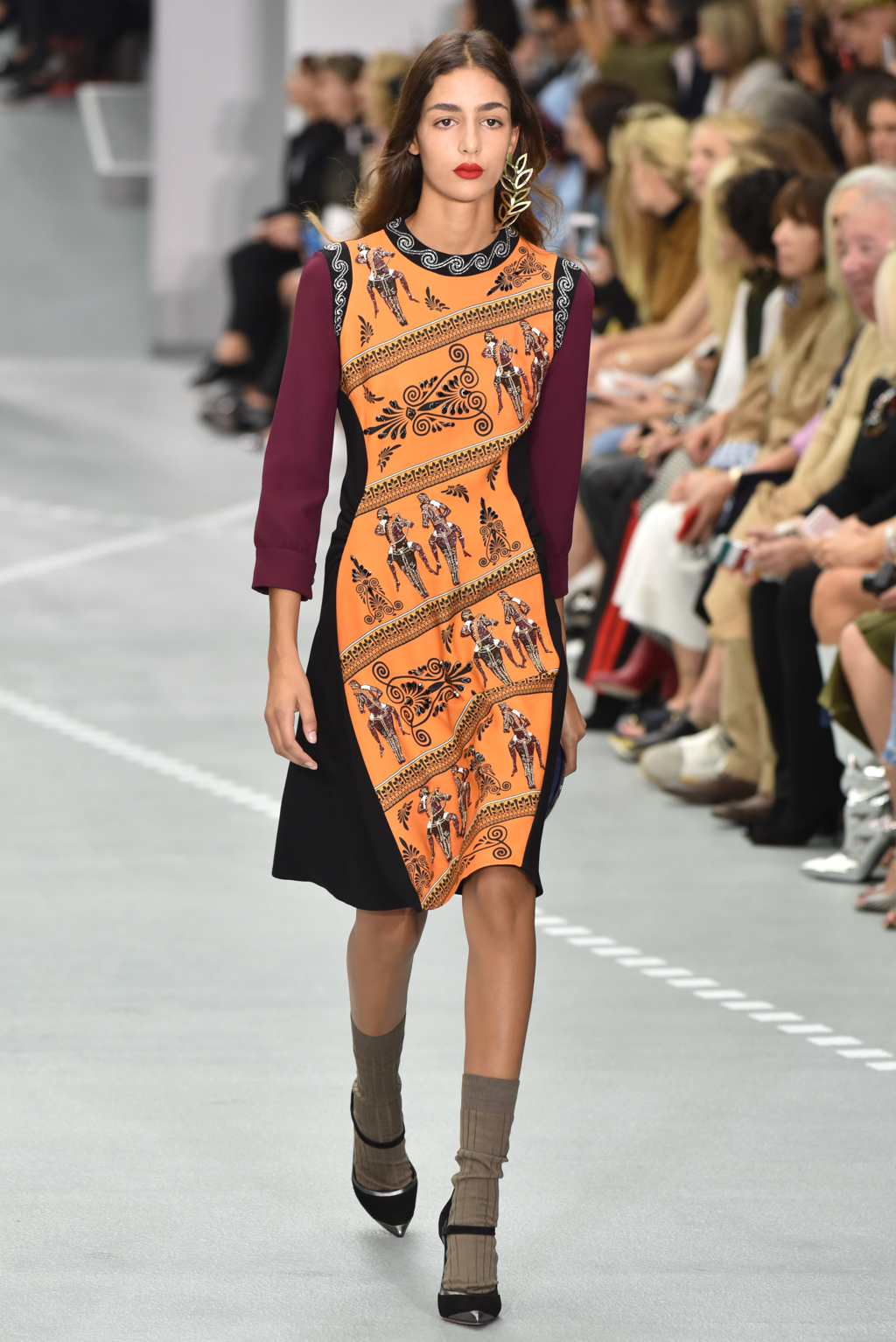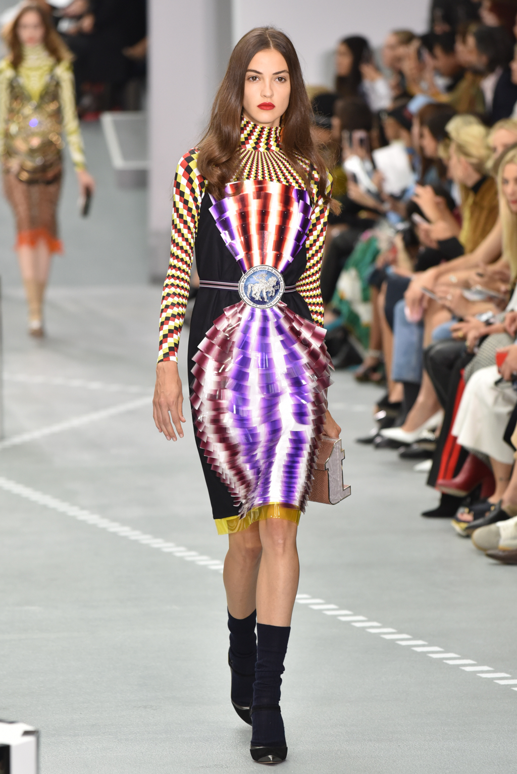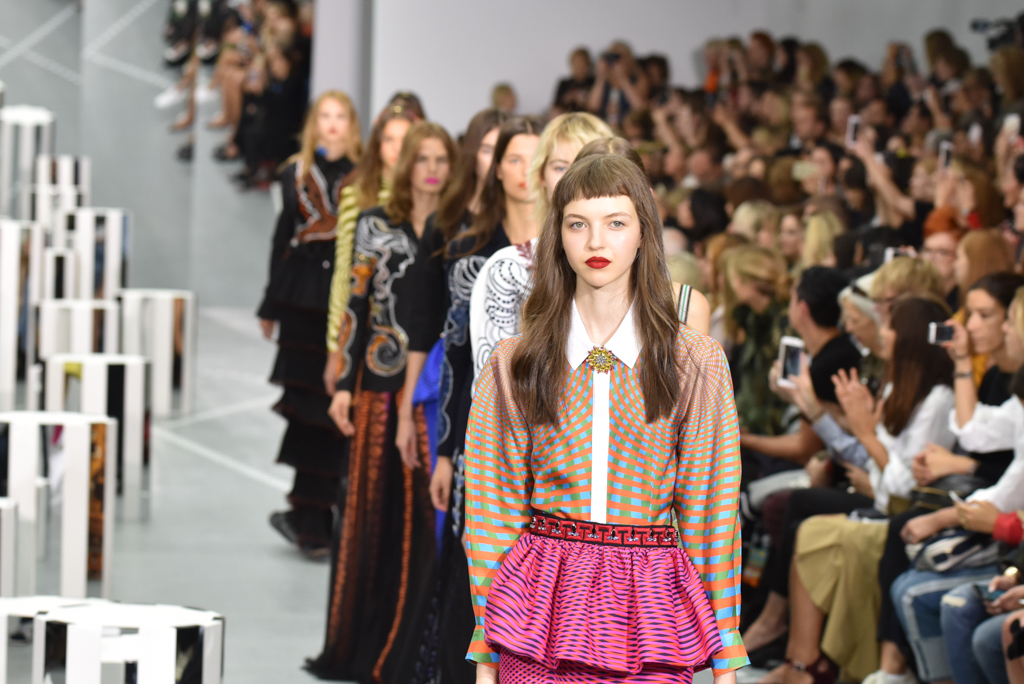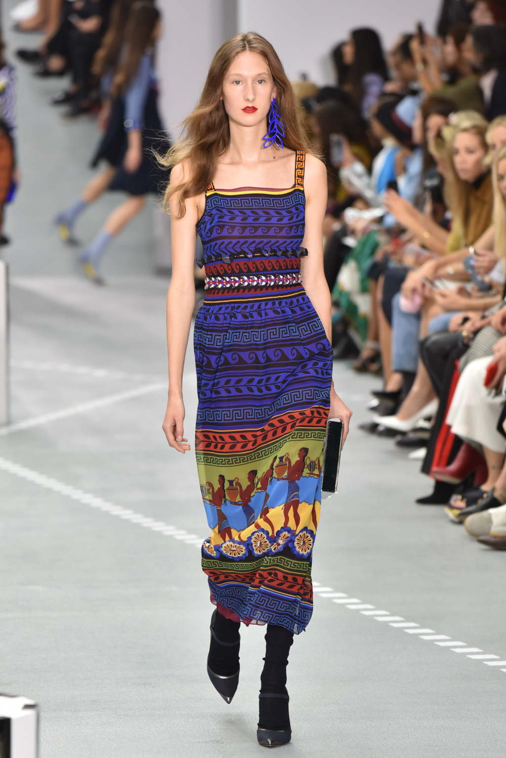 Mary Katrantzou today offered a statement Spring 2017 collection characterised by bold colours, psychedelic prints and Ancient Egyptian-inspired motifs.