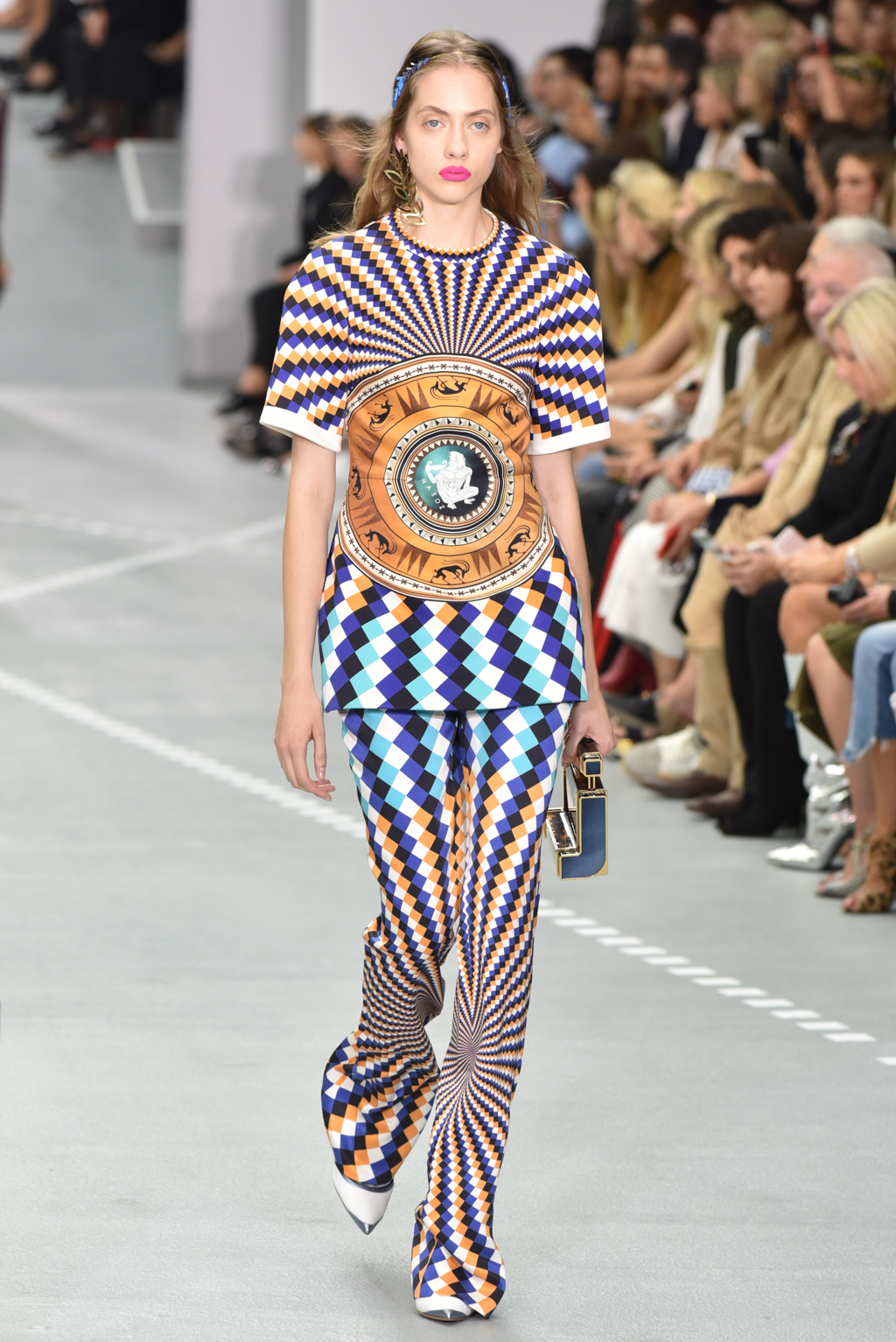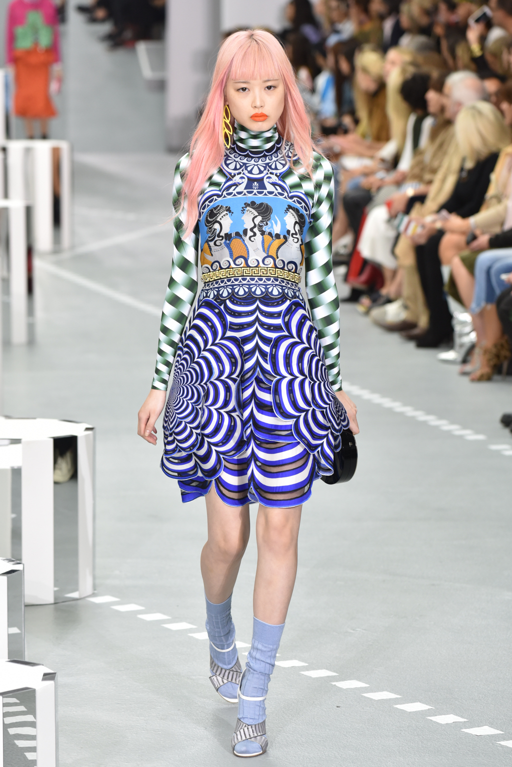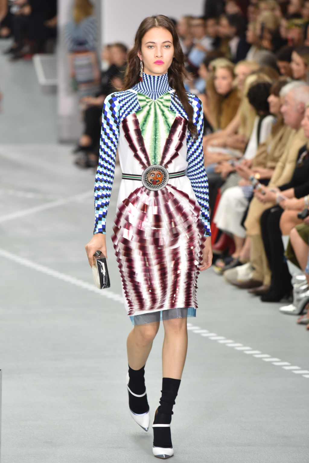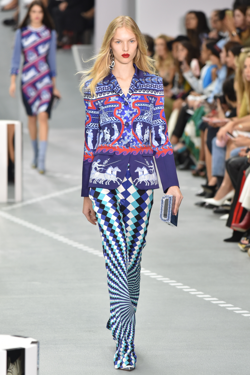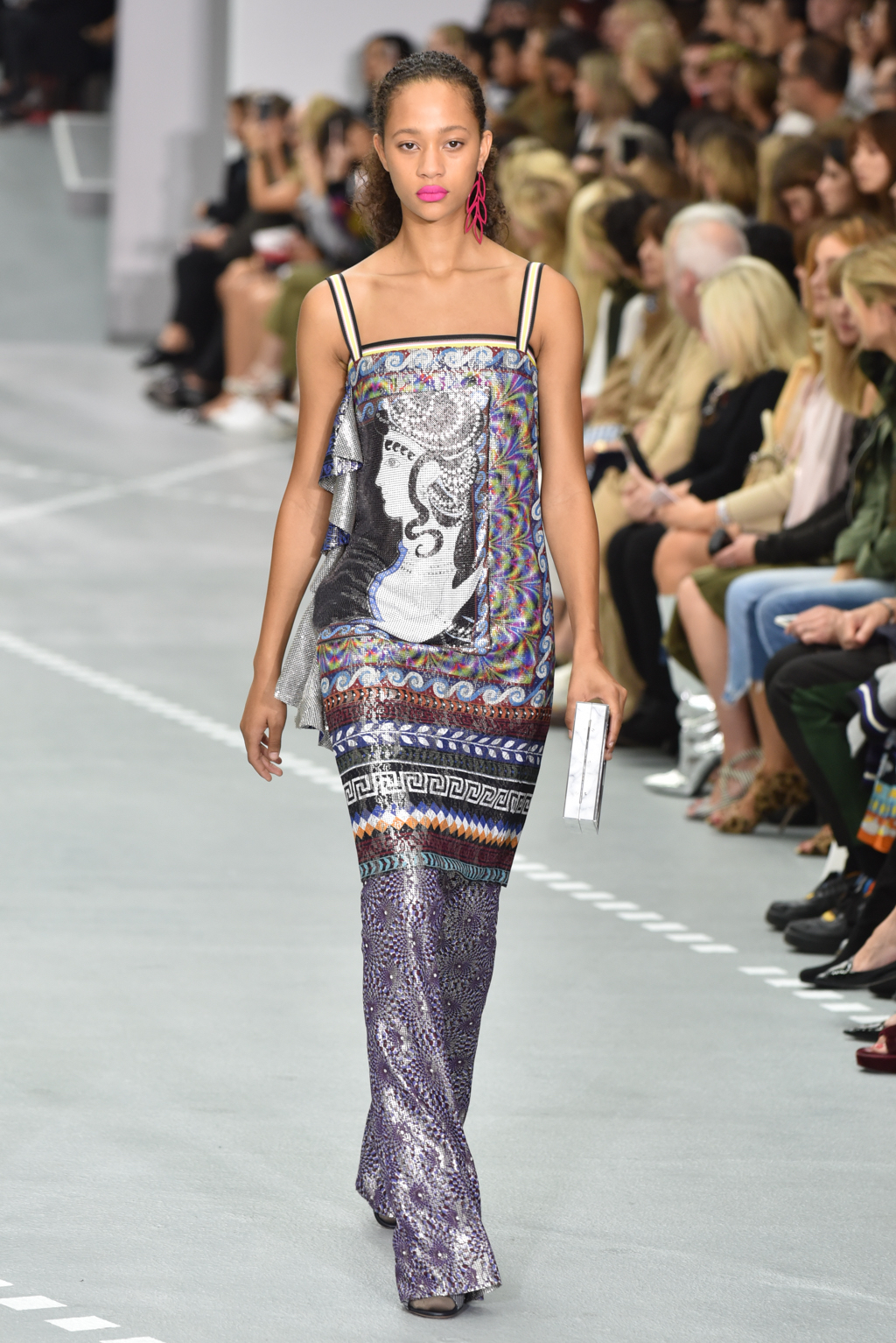 Mary Katrantzou today offered a statement Spring 2017 collection characterised by bold colours, psychedelic prints and Ancient Egyptian-inspired motifs.