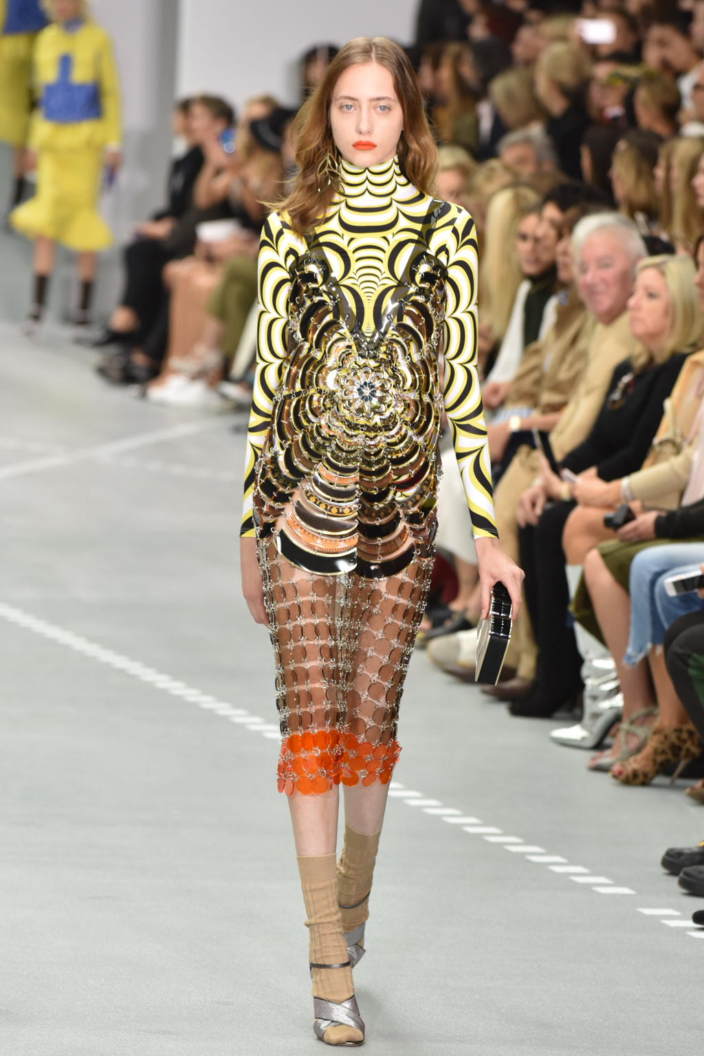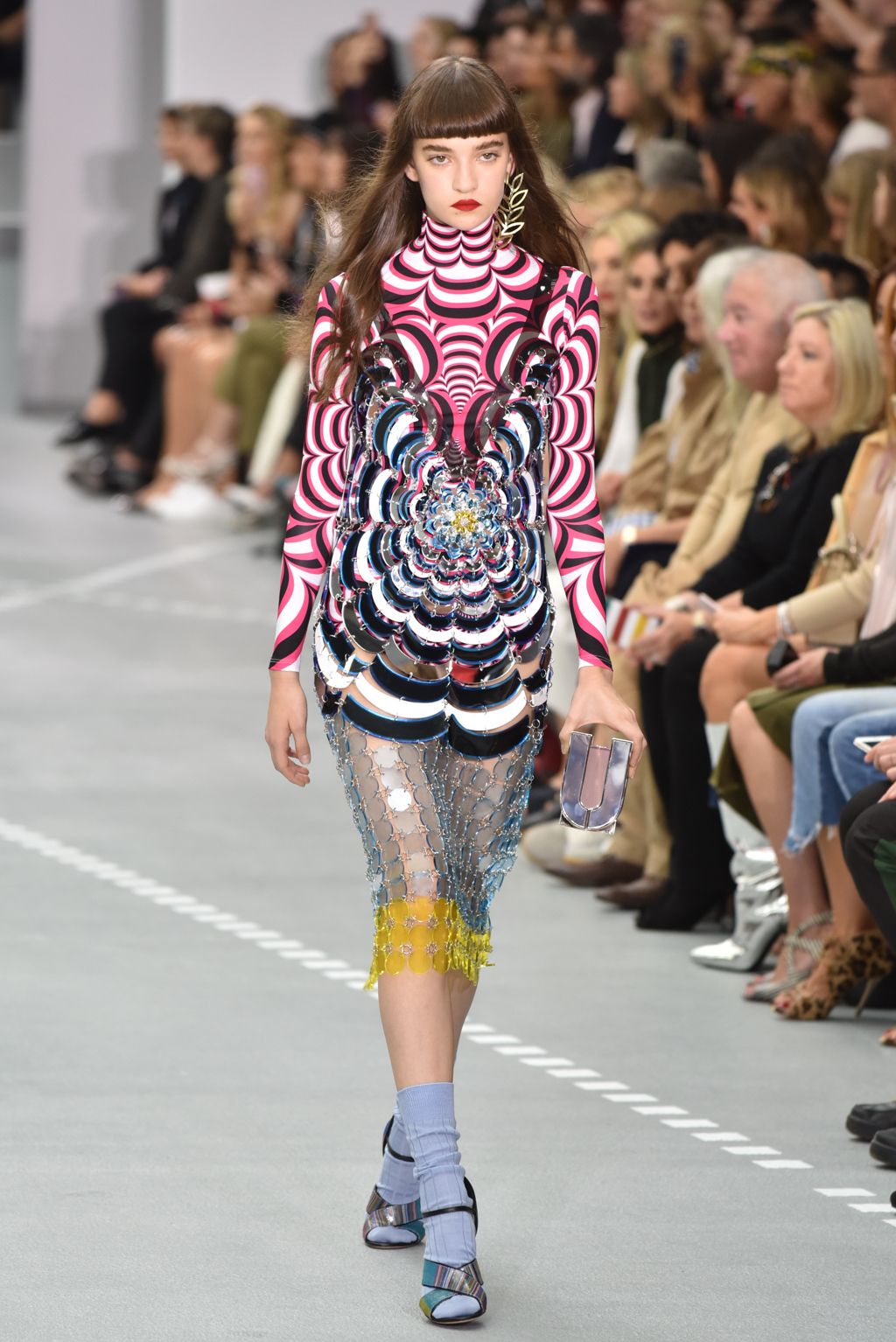 Elsewhere, oversized sequins arranged themselves into endlessly repeating patterns, or else radiated in eye-boggling ways from a medallion-like motif at the waist.