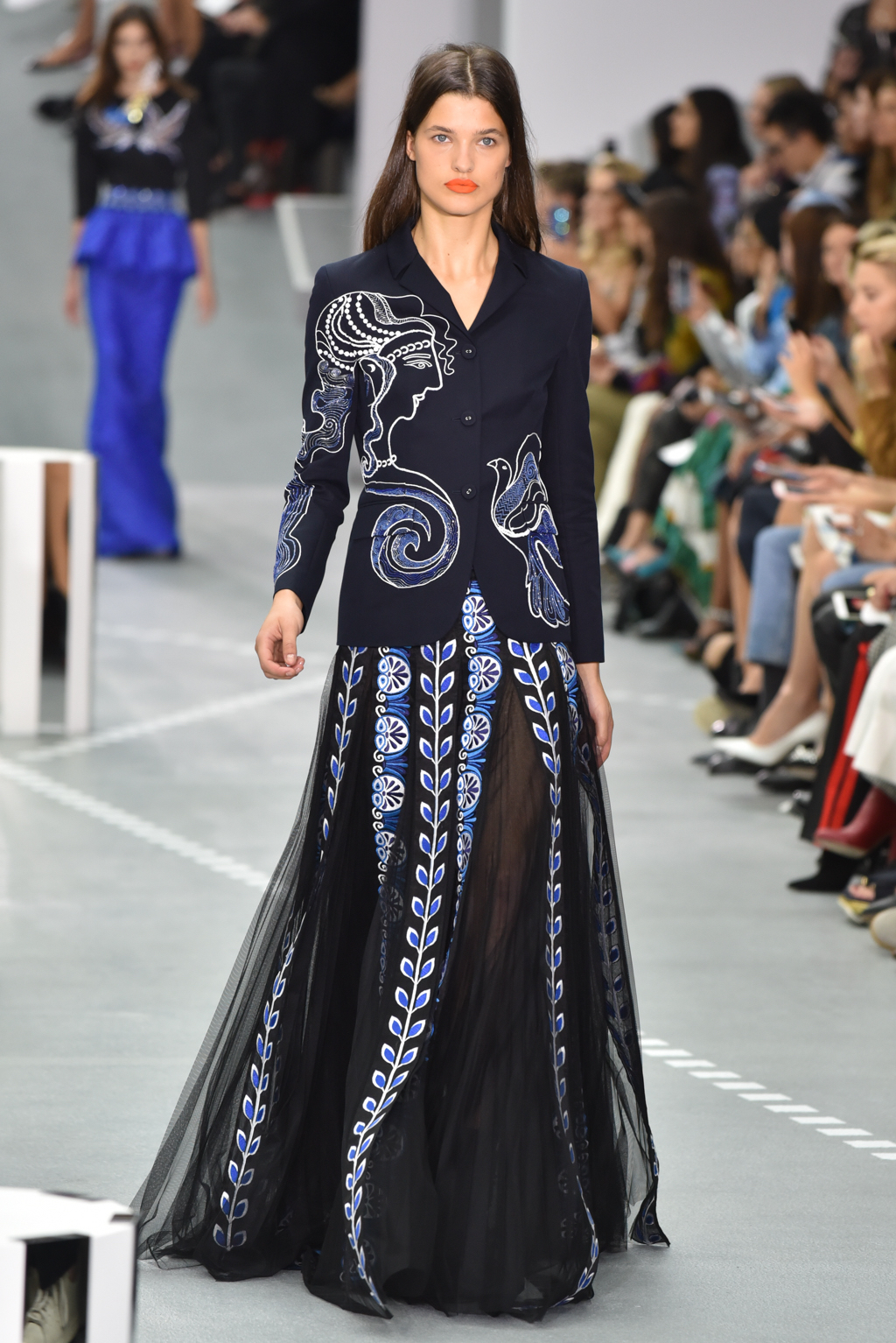 Some of the strongest pieces came towards the end of the show, when Katrantzou offered a range of full-length gowns with peplum waists. Many were (relatively) simple, featuring an embroidered dove offering an olive branch to a simplified outline of a woman’s face.