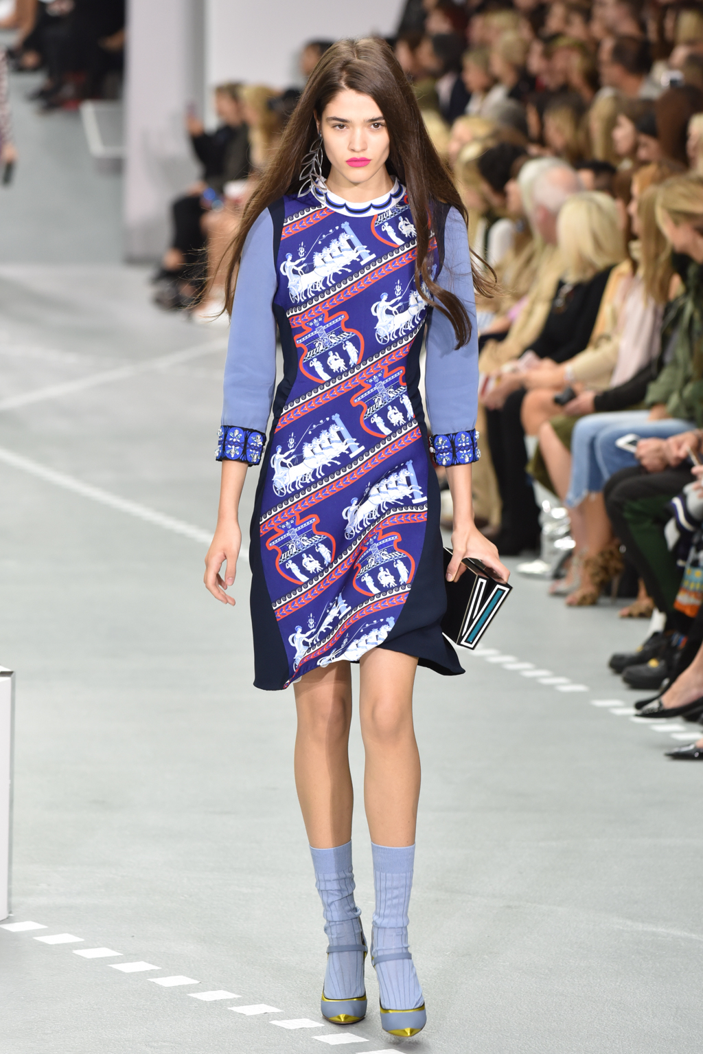 The hieroglyph theme ran throughout the collection, transformed into vibrant repeating patterns that zig-zagged across form-fitting dresses and tailored jackets.