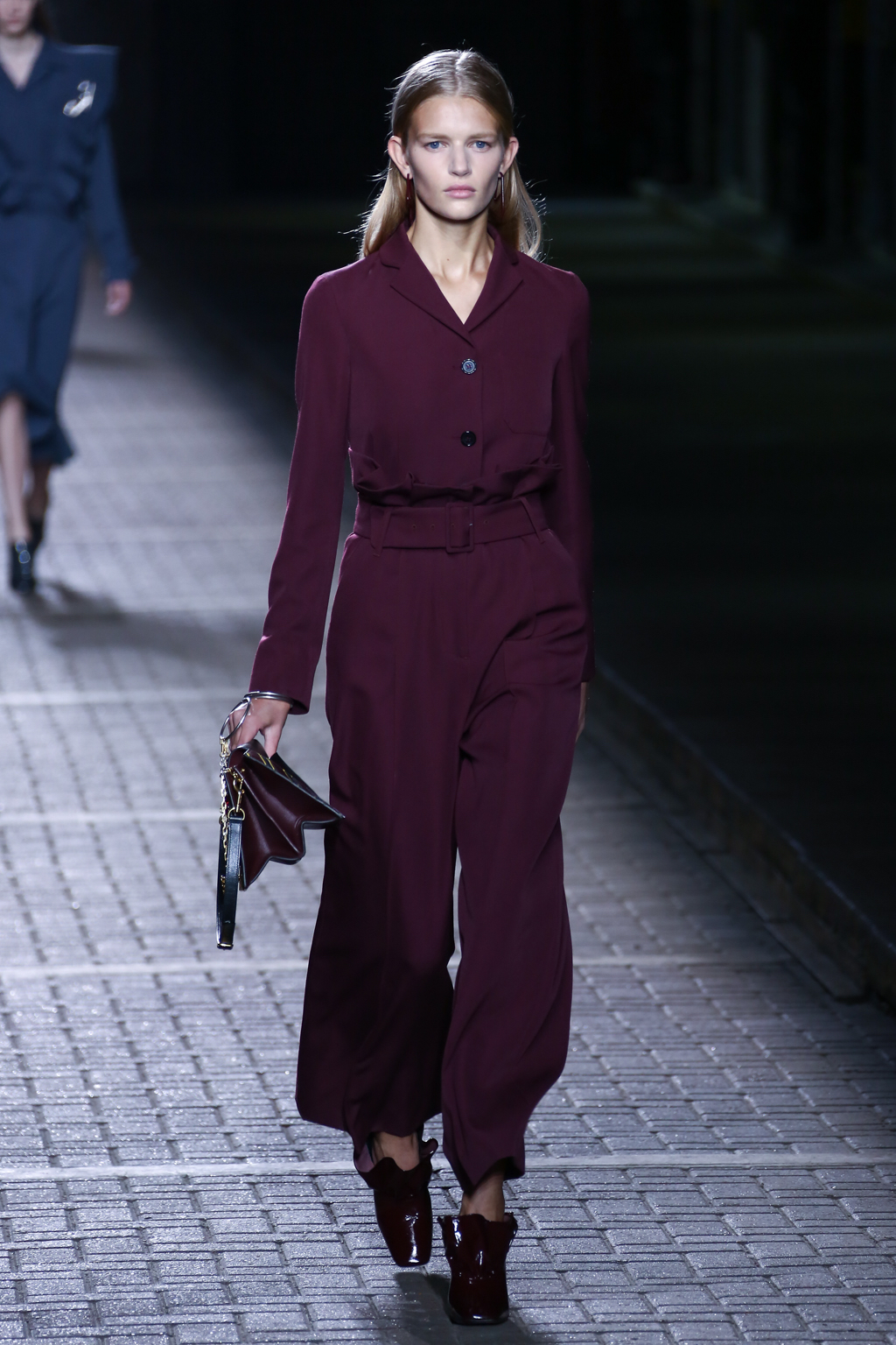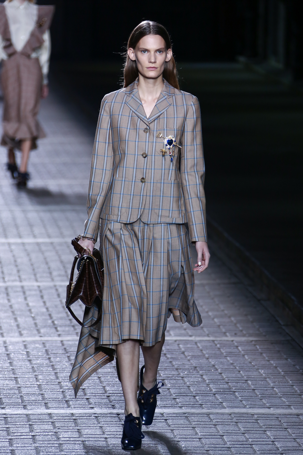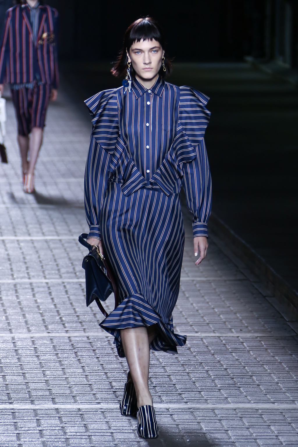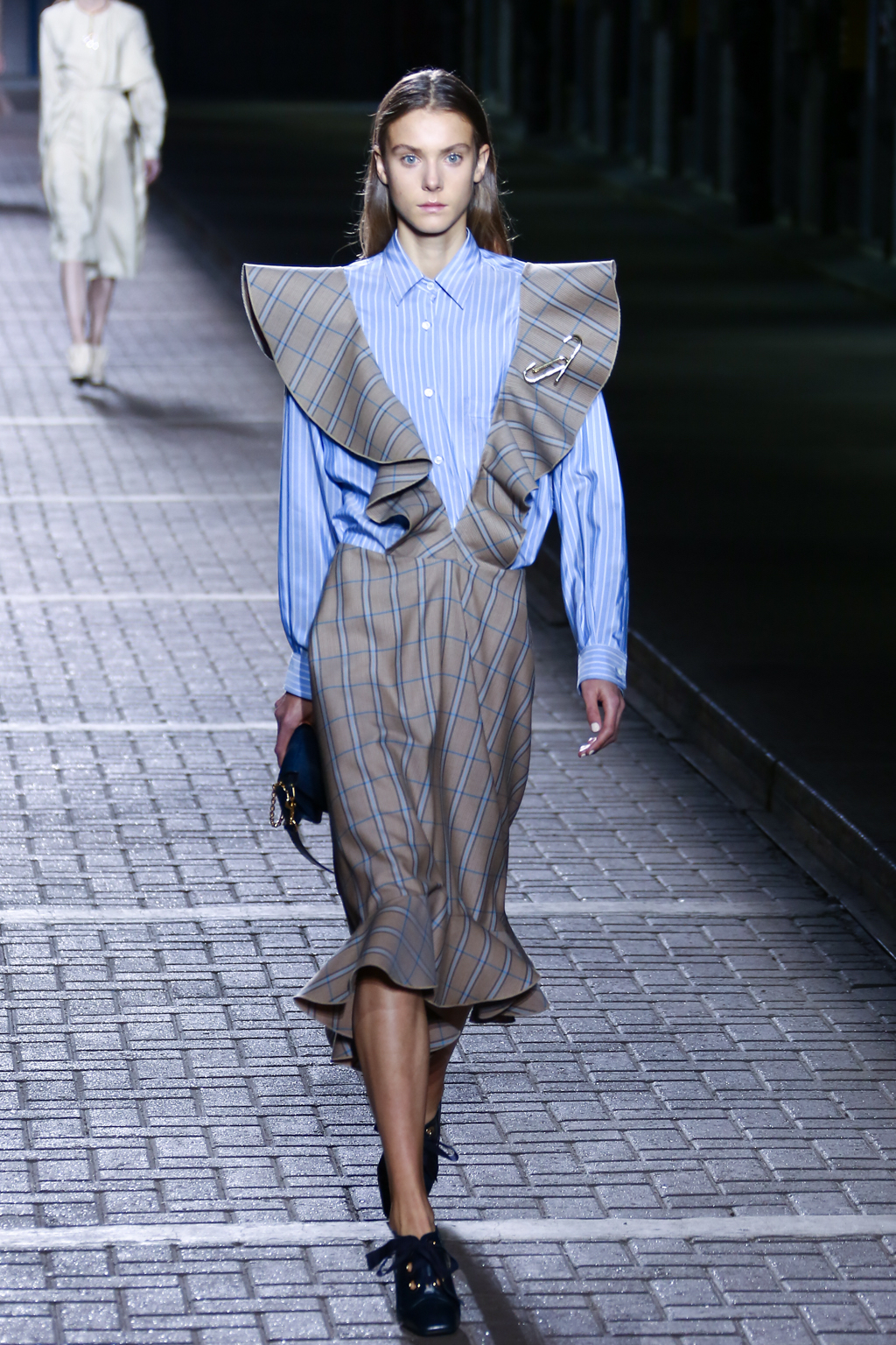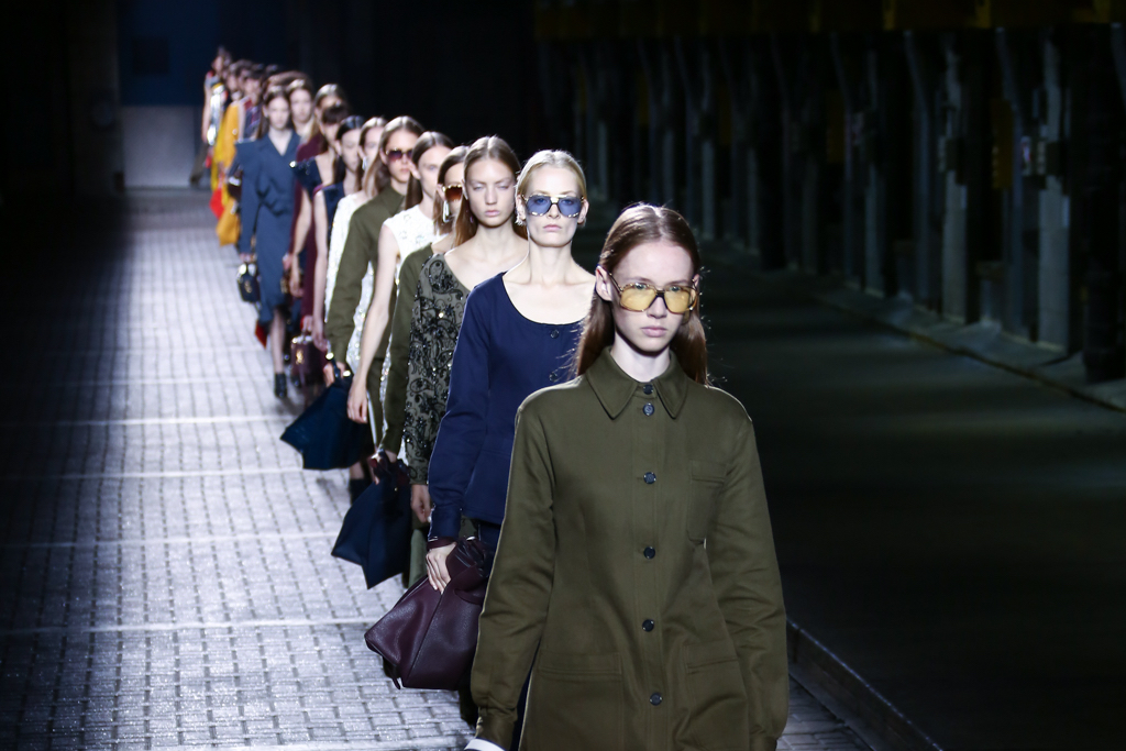 From the flapper-waisted skirt suits to the pinstripe Carnaby street-inspired pieces to the rather “19th-century American farmer’s wife” ruffled cotton pinafore dresses, Mulberry presented a collection that was anything but static. A dynamic interchange of fabrics and reference periods managed to be cohesive, all tied together in neat leather satchels.