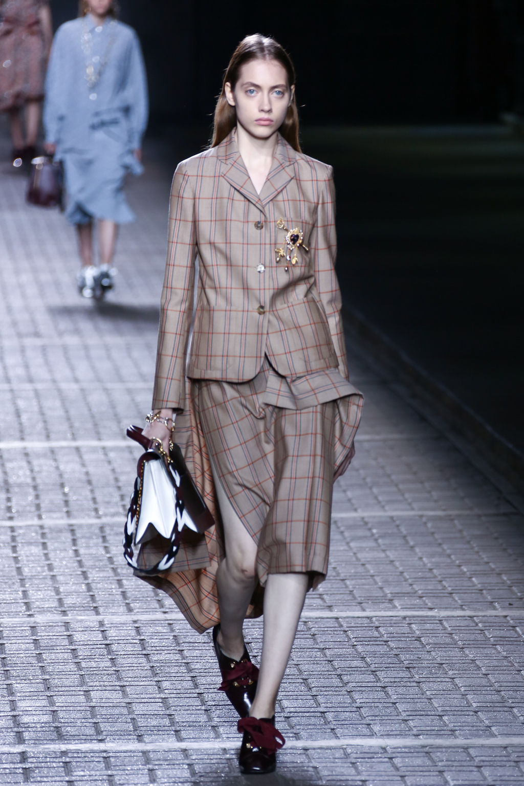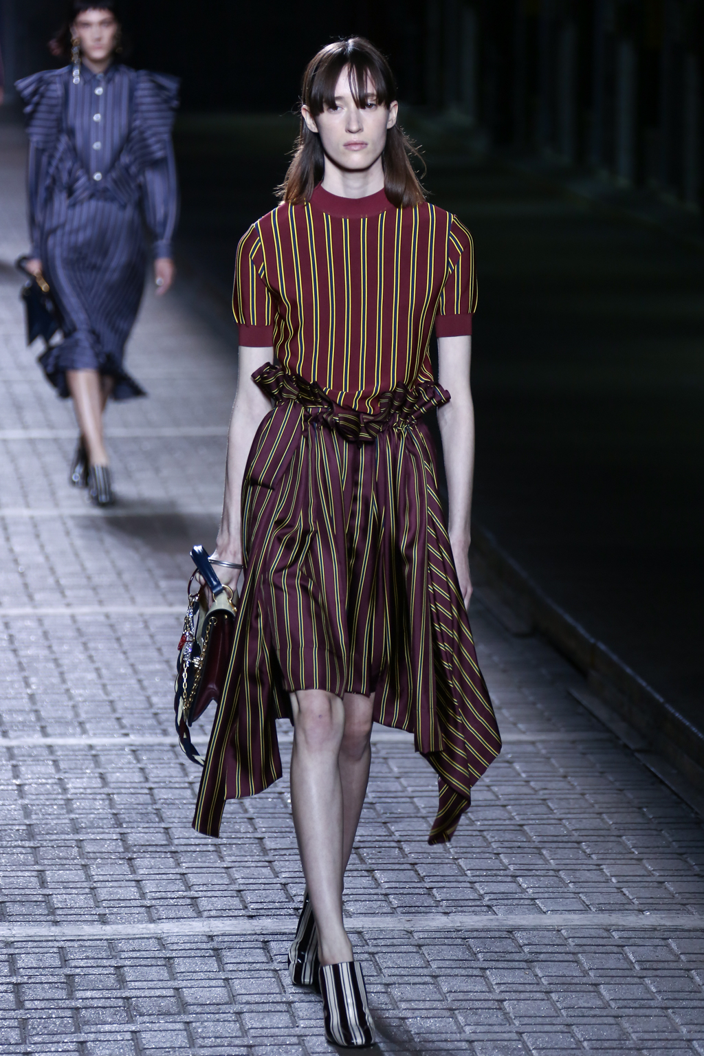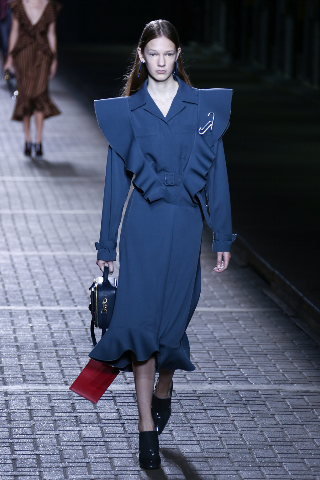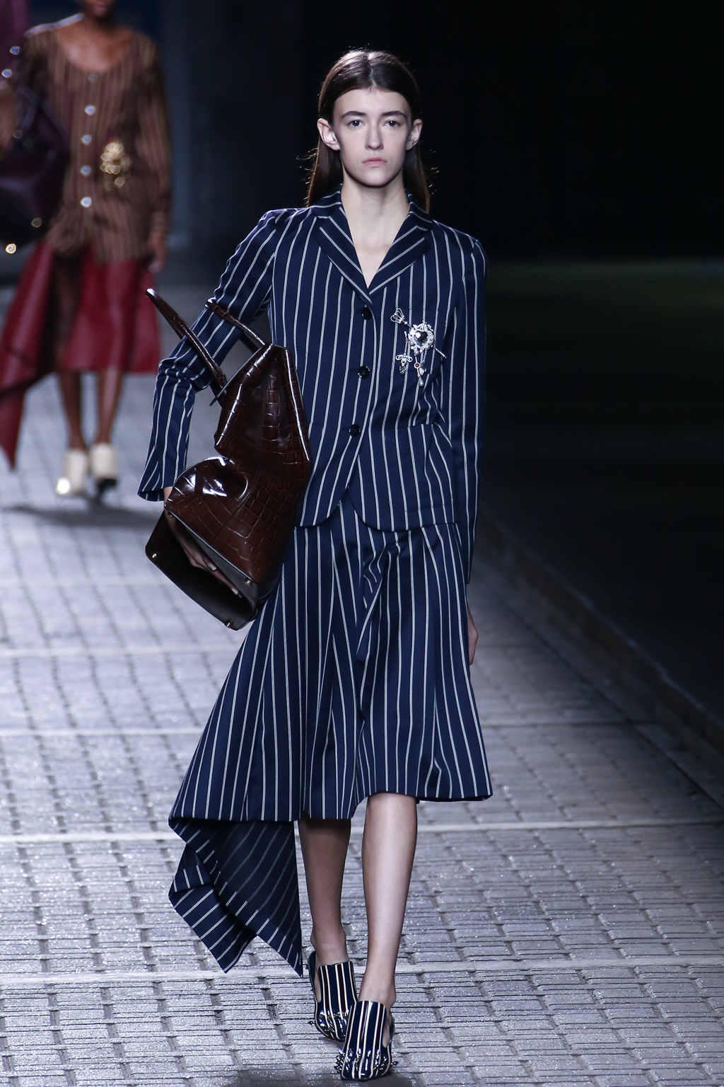 From the flapper-waisted skirt suits to the pinstripe Carnaby street-inspired pieces to the rather “19th-century American farmer’s wife” ruffled cotton pinafore dresses, Mulberry presented a collection that was anything but static. A dynamic interchange of fabrics and reference periods managed to be cohesive, all tied together in neat leather satchels.