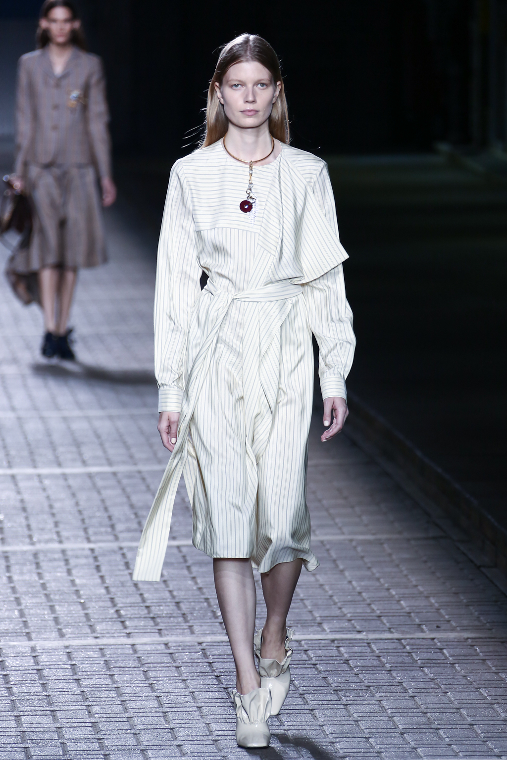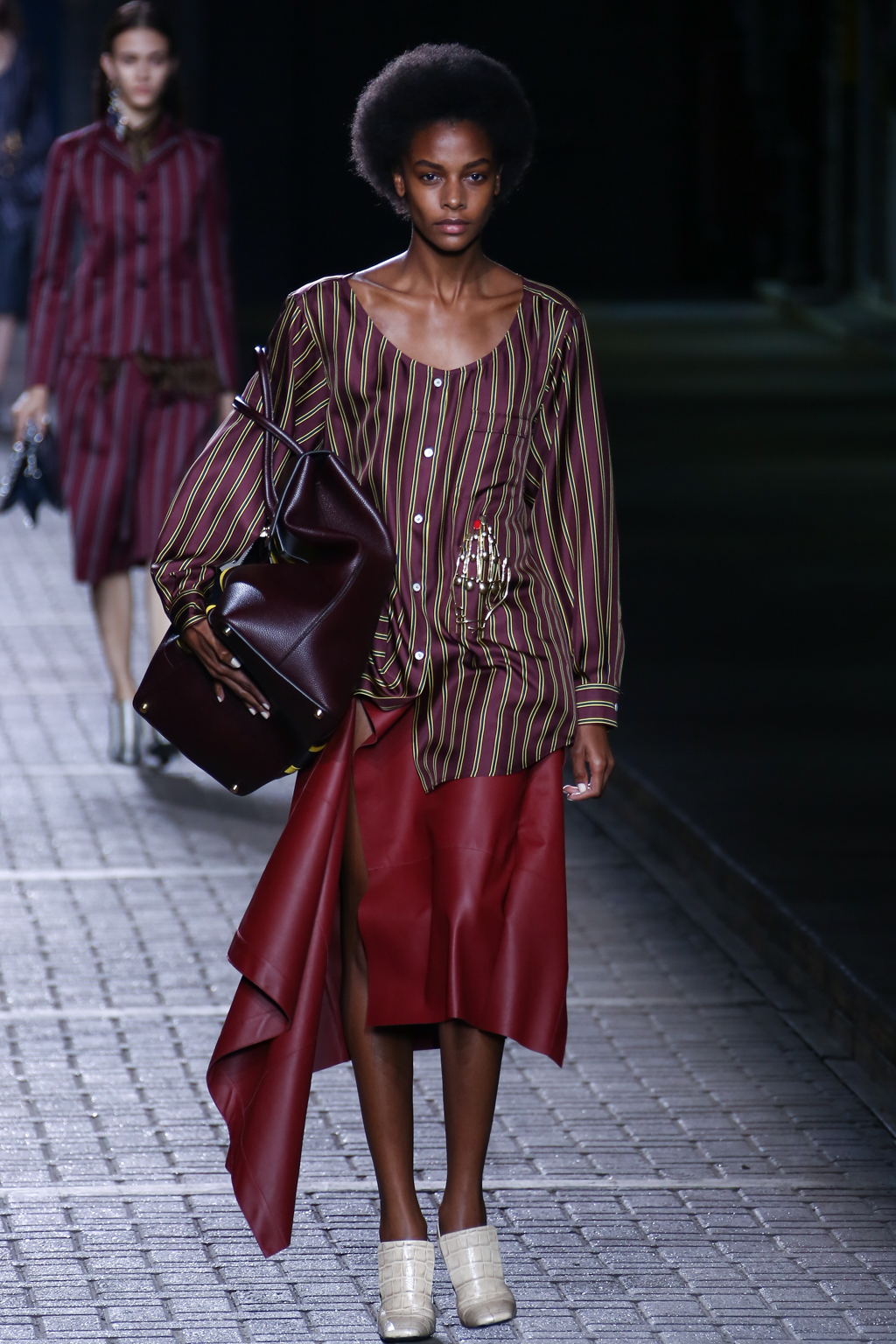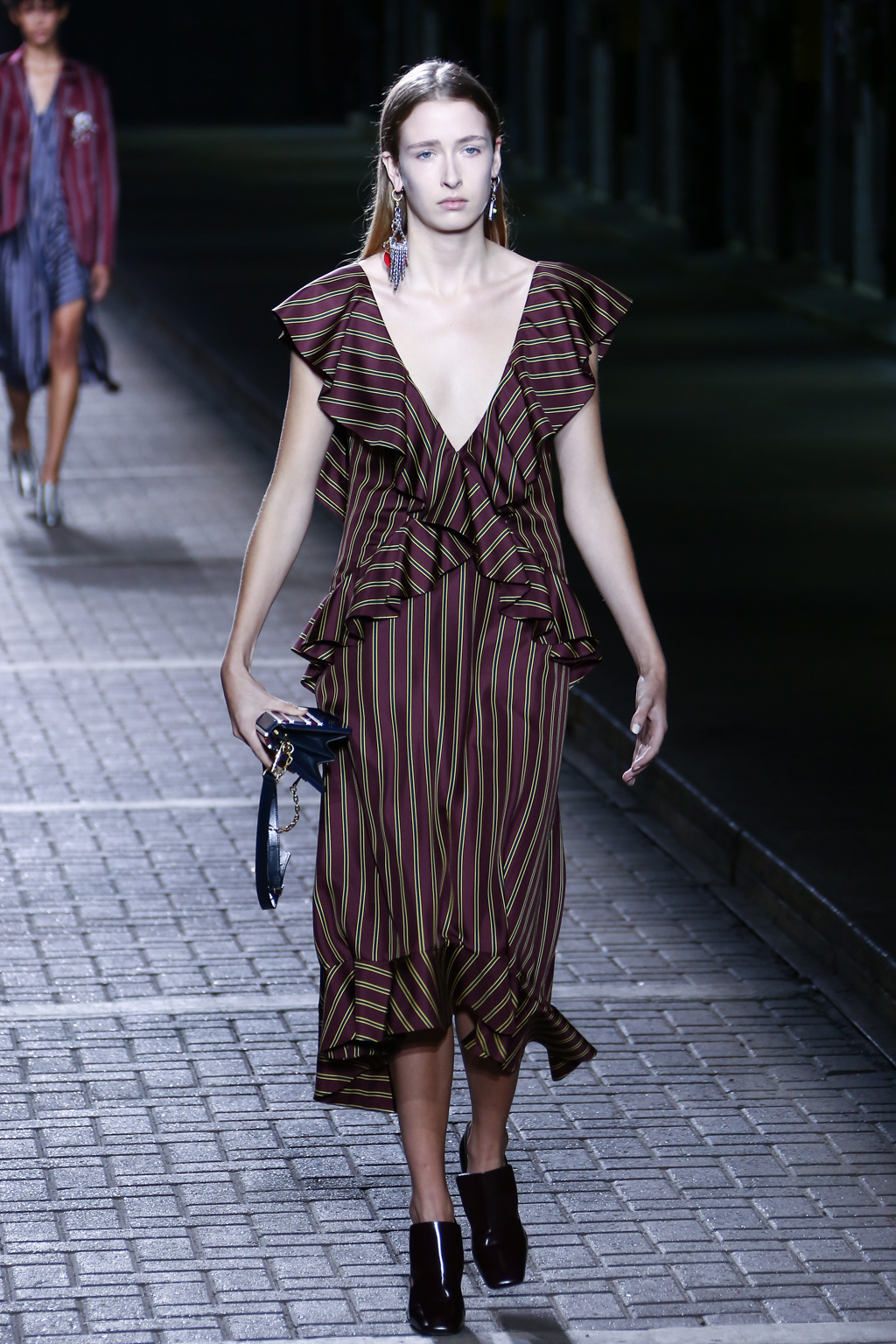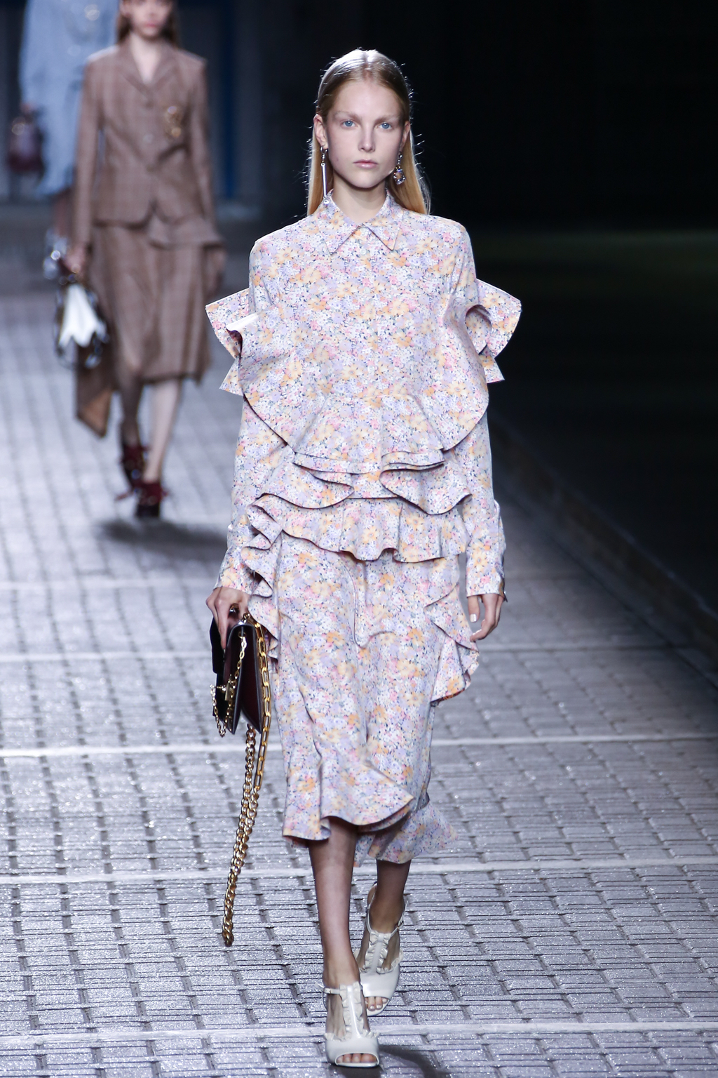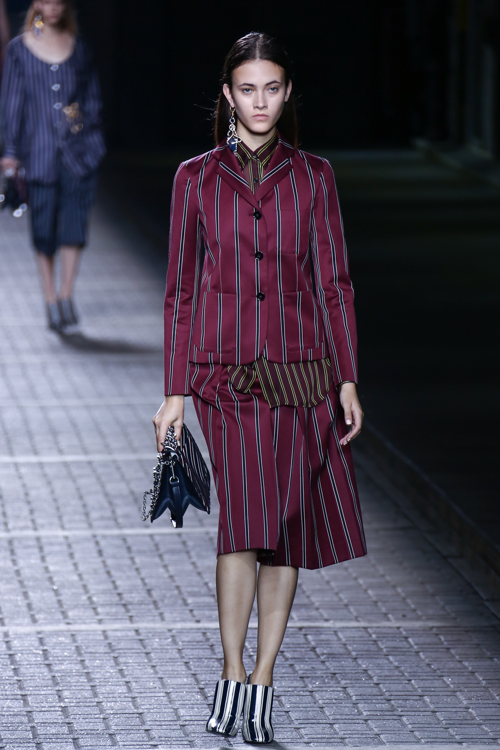 From the flapper-waisted skirt suits to the pinstripe Carnaby street-inspired pieces to the rather “19th-century American farmer’s wife” ruffled cotton pinafore dresses, Mulberry presented a collection that was anything but static. A dynamic interchange of fabrics and reference periods managed to be cohesive, all tied together in neat leather satchels.