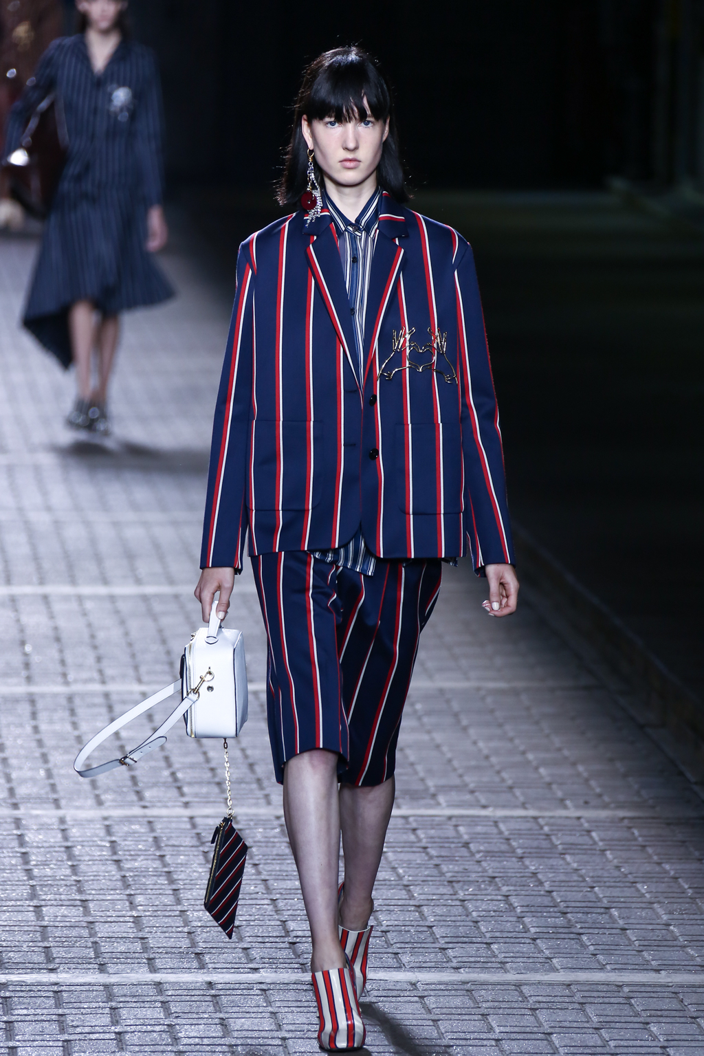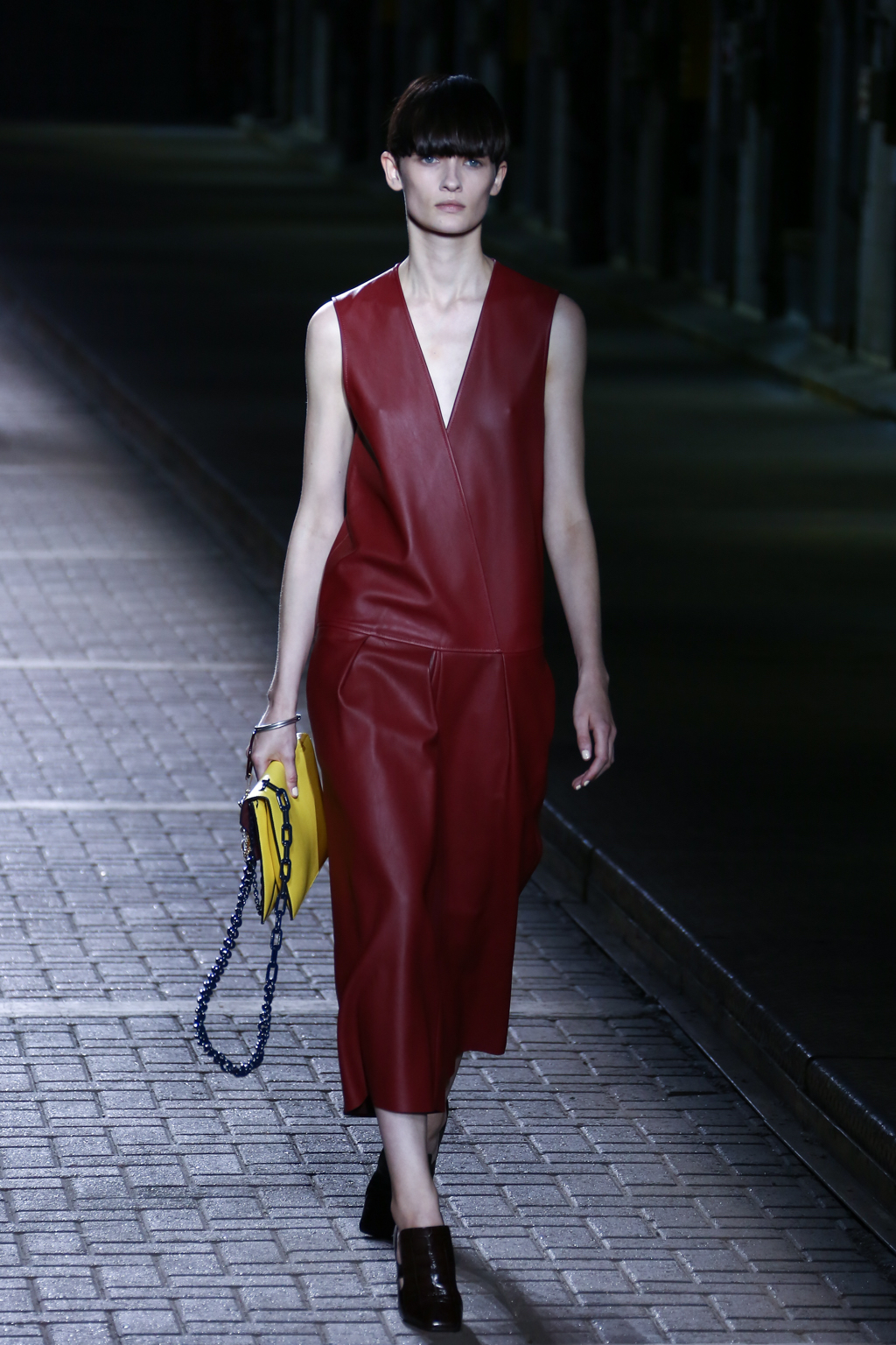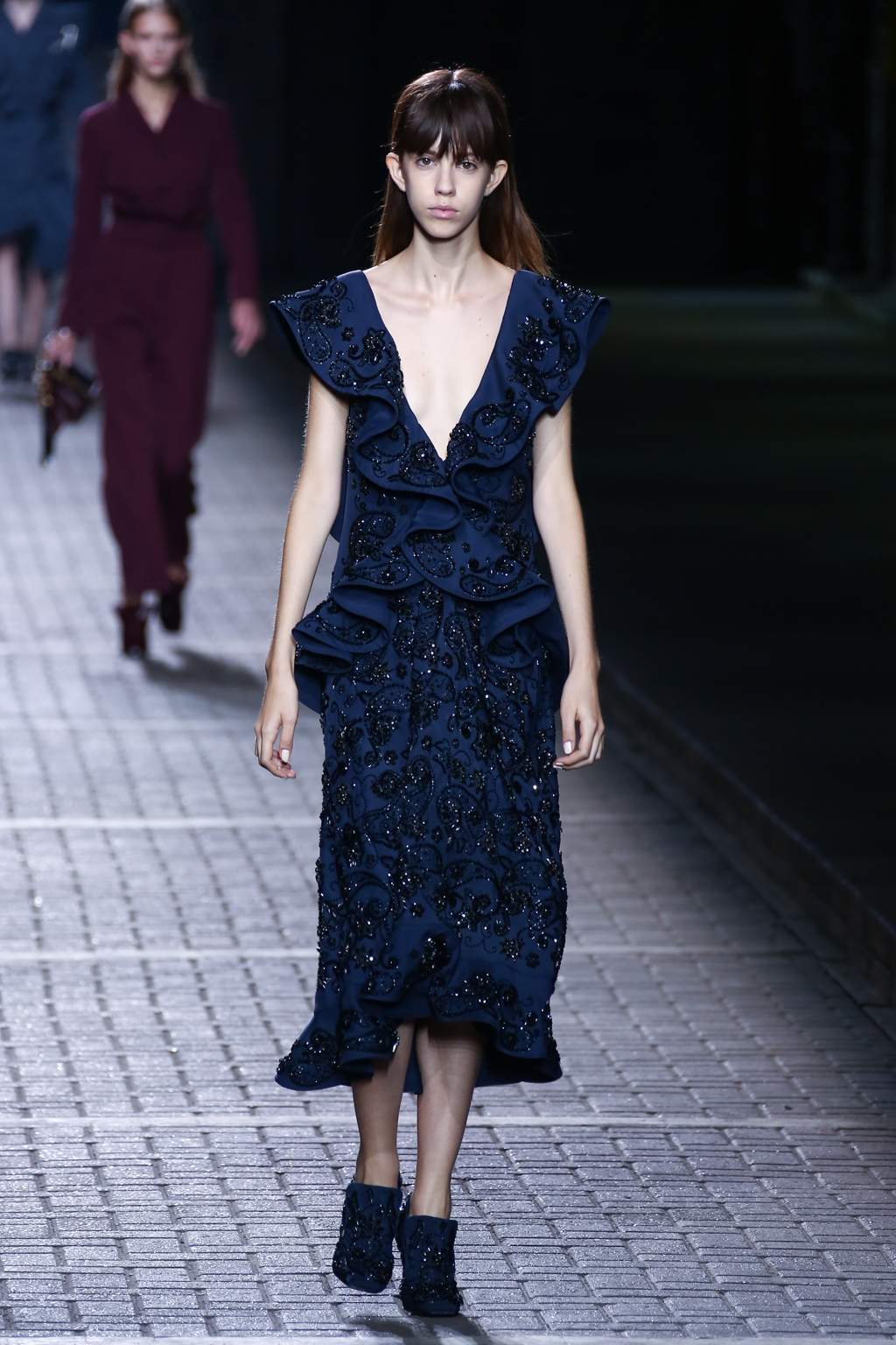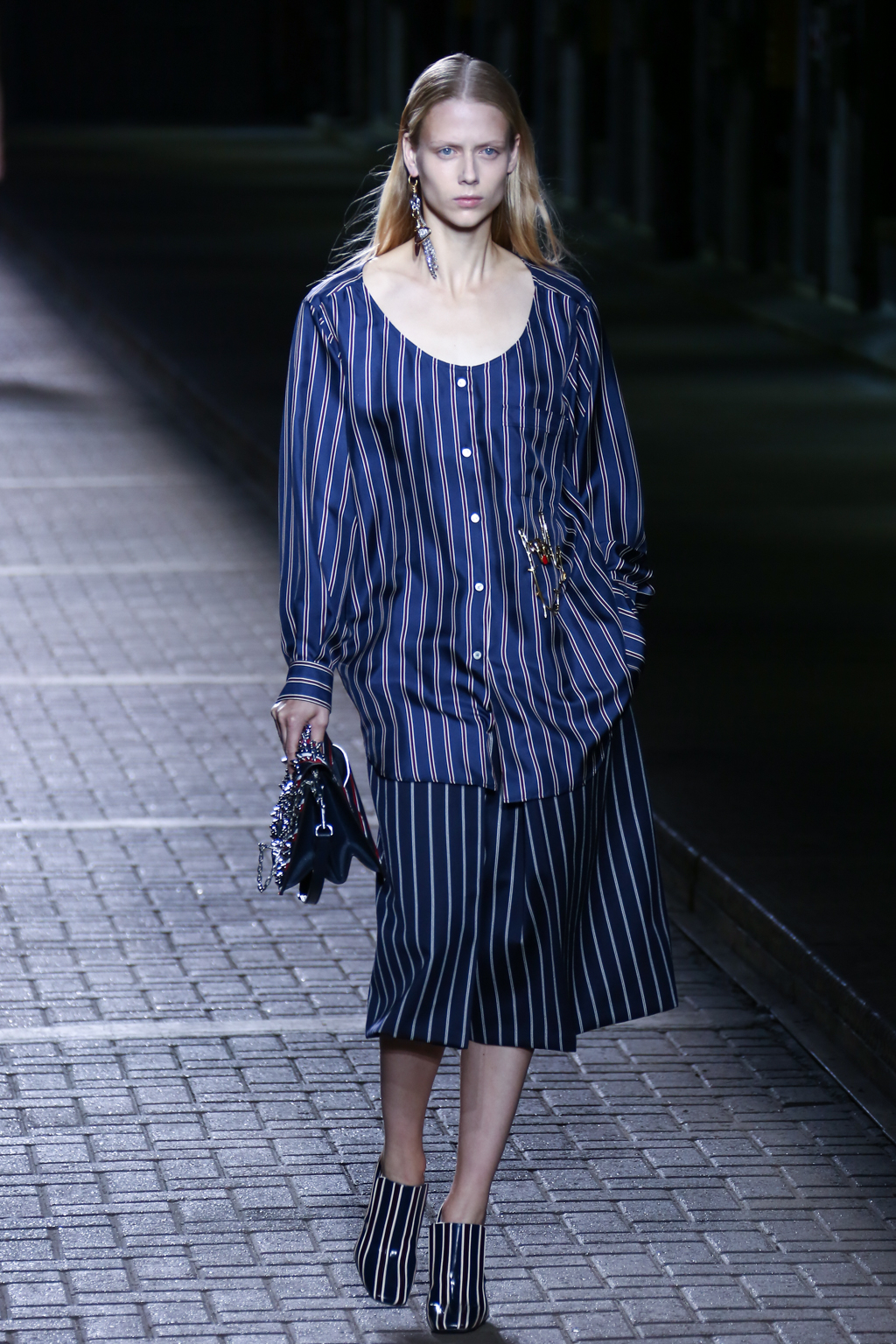 From the flapper-waisted skirt suits to the pinstripe Carnaby street-inspired pieces to the rather “19th-century American farmer’s wife” ruffled cotton pinafore dresses, Mulberry presented a collection that was anything but static. A dynamic interchange of fabrics and reference periods managed to be cohesive, all tied together in neat leather satchels.