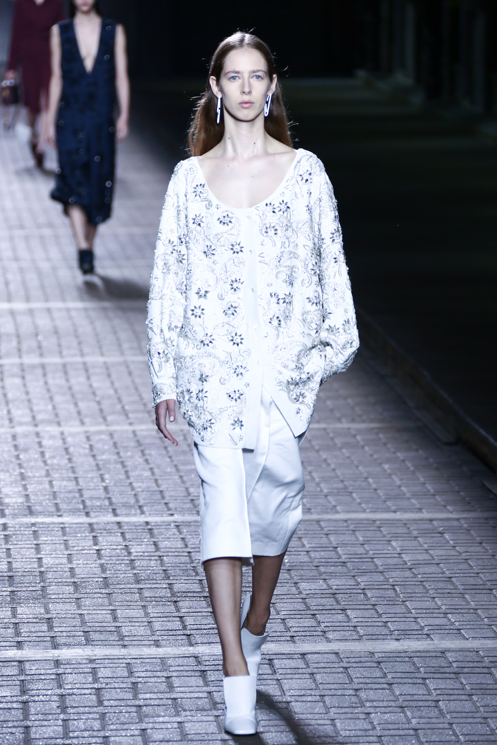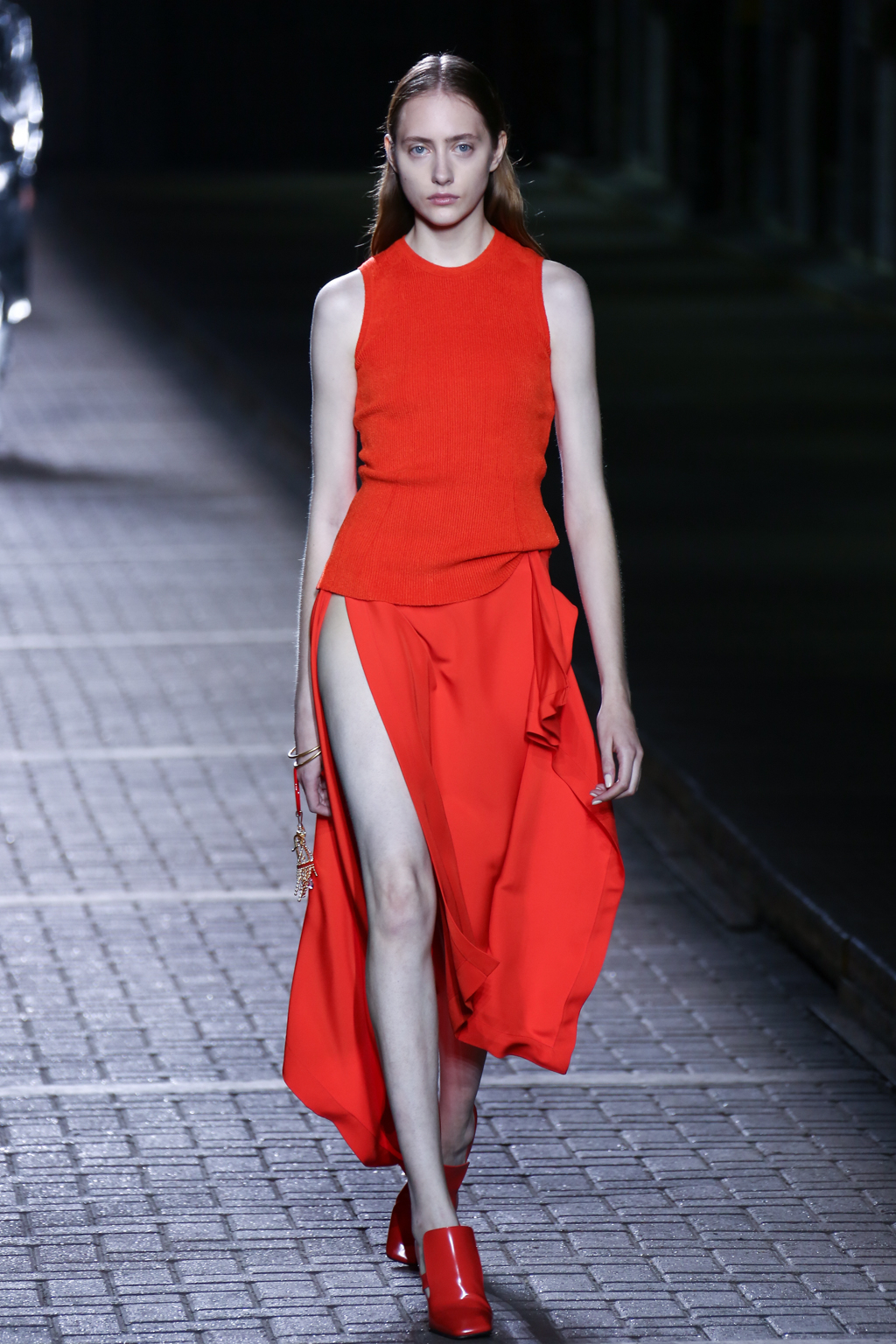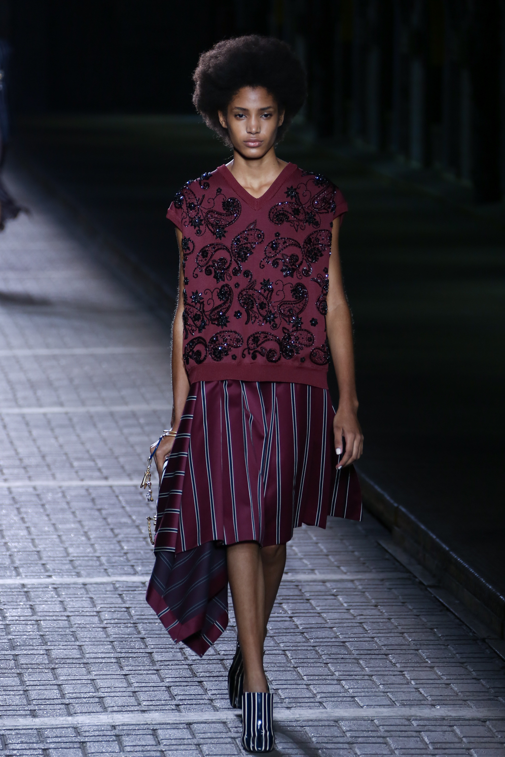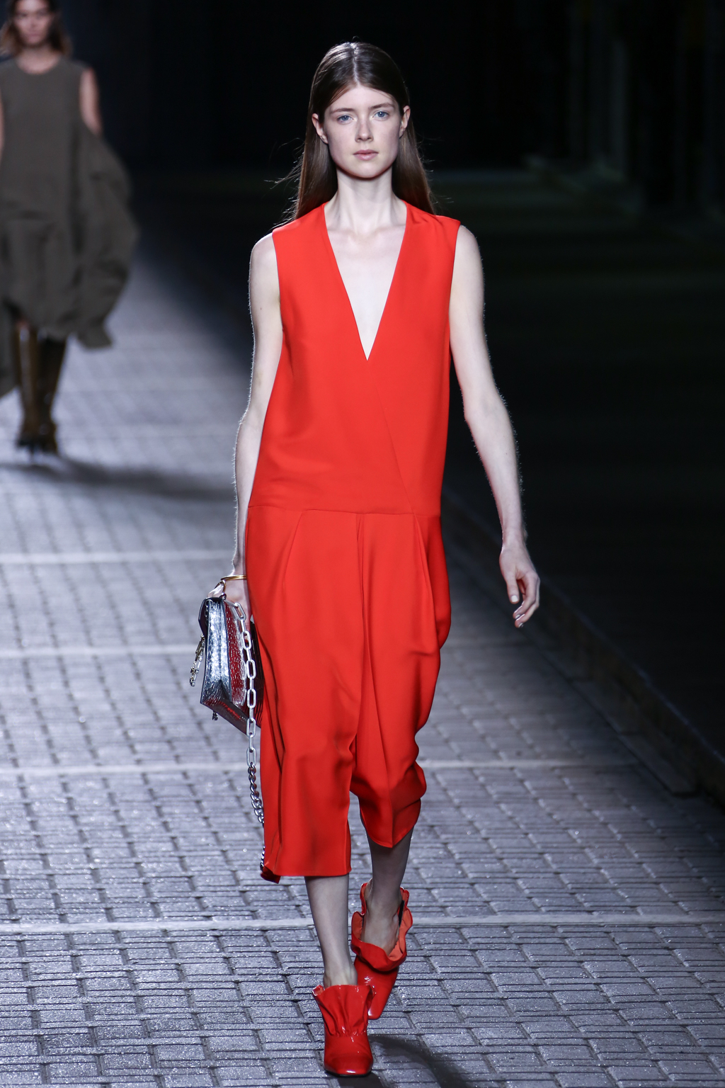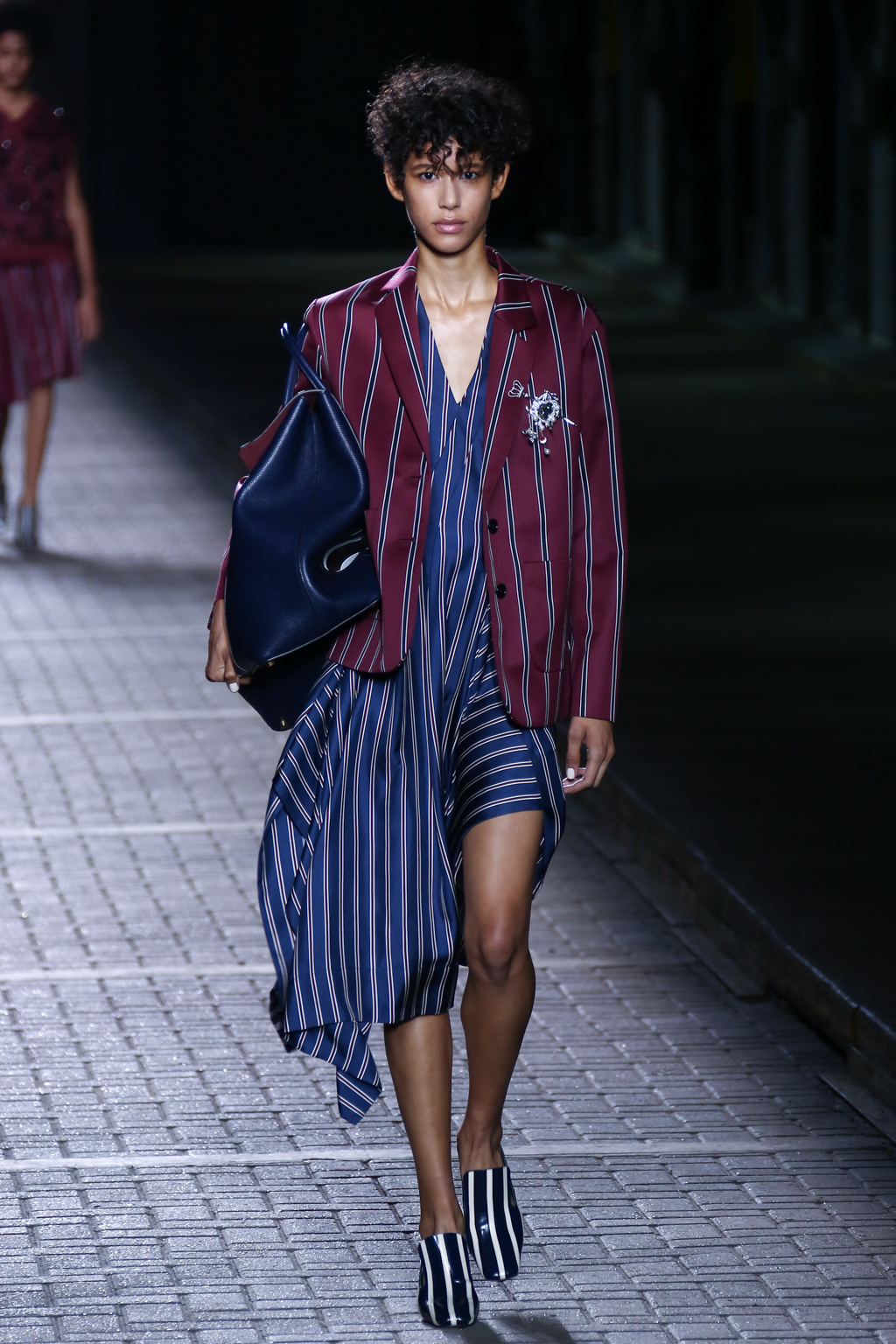 From the flapper-waisted skirt suits to the pinstripe Carnaby street-inspired pieces to the rather “19th-century American farmer’s wife” ruffled cotton pinafore dresses, Mulberry presented a collection that was anything but static. A dynamic interchange of fabrics and reference periods managed to be cohesive, all tied together in neat leather satchels.