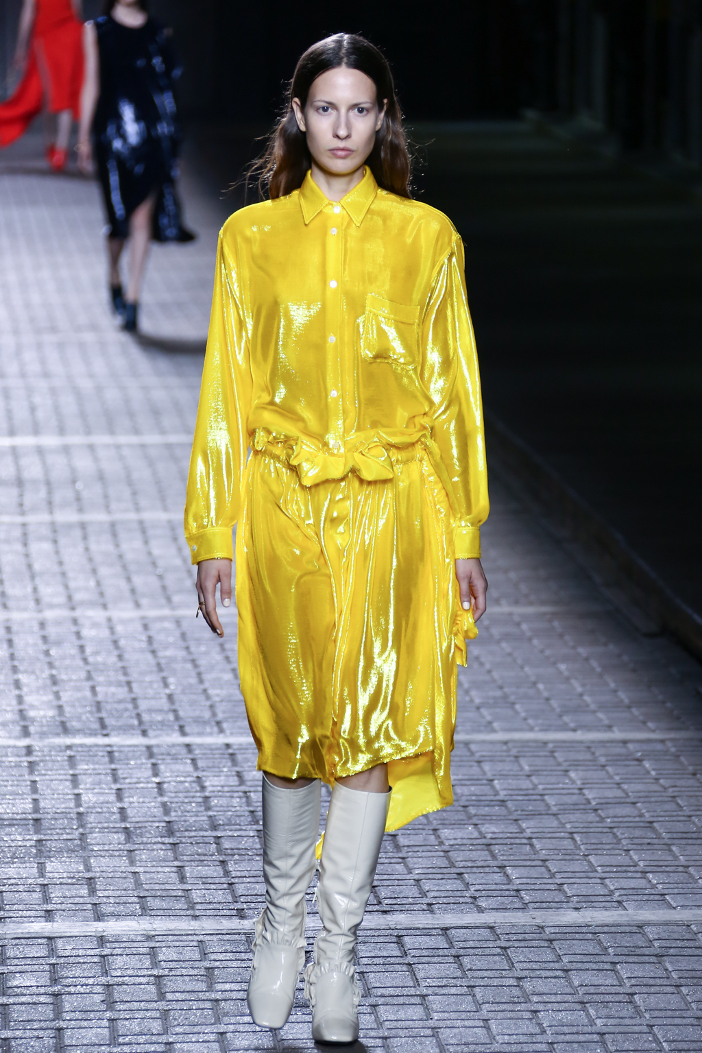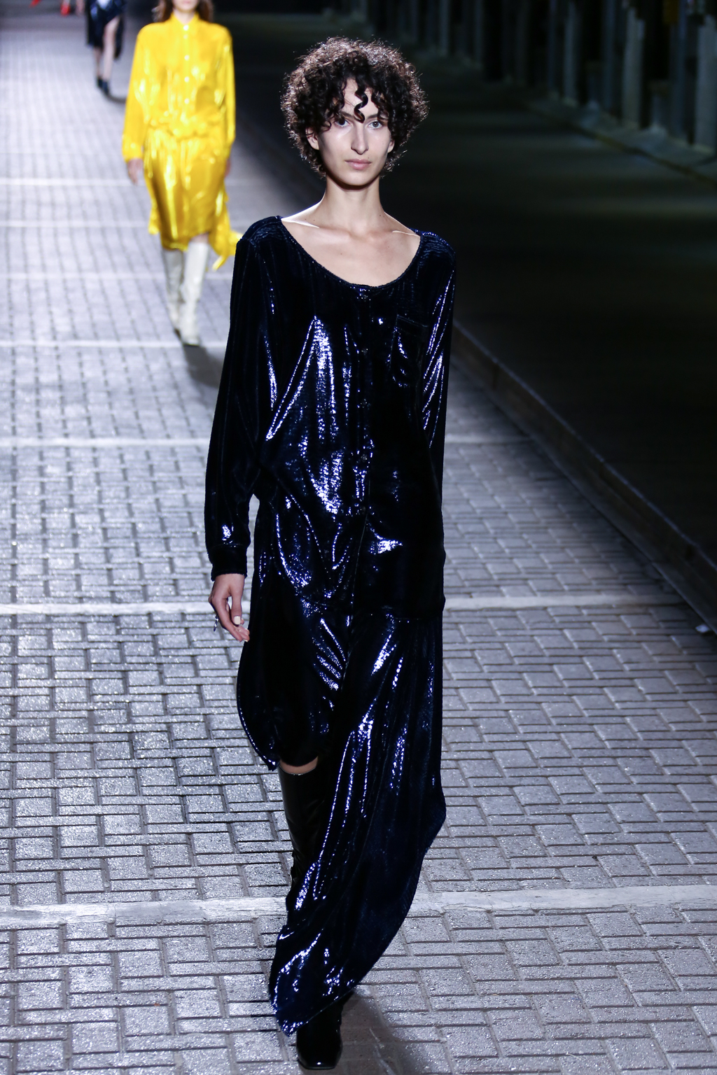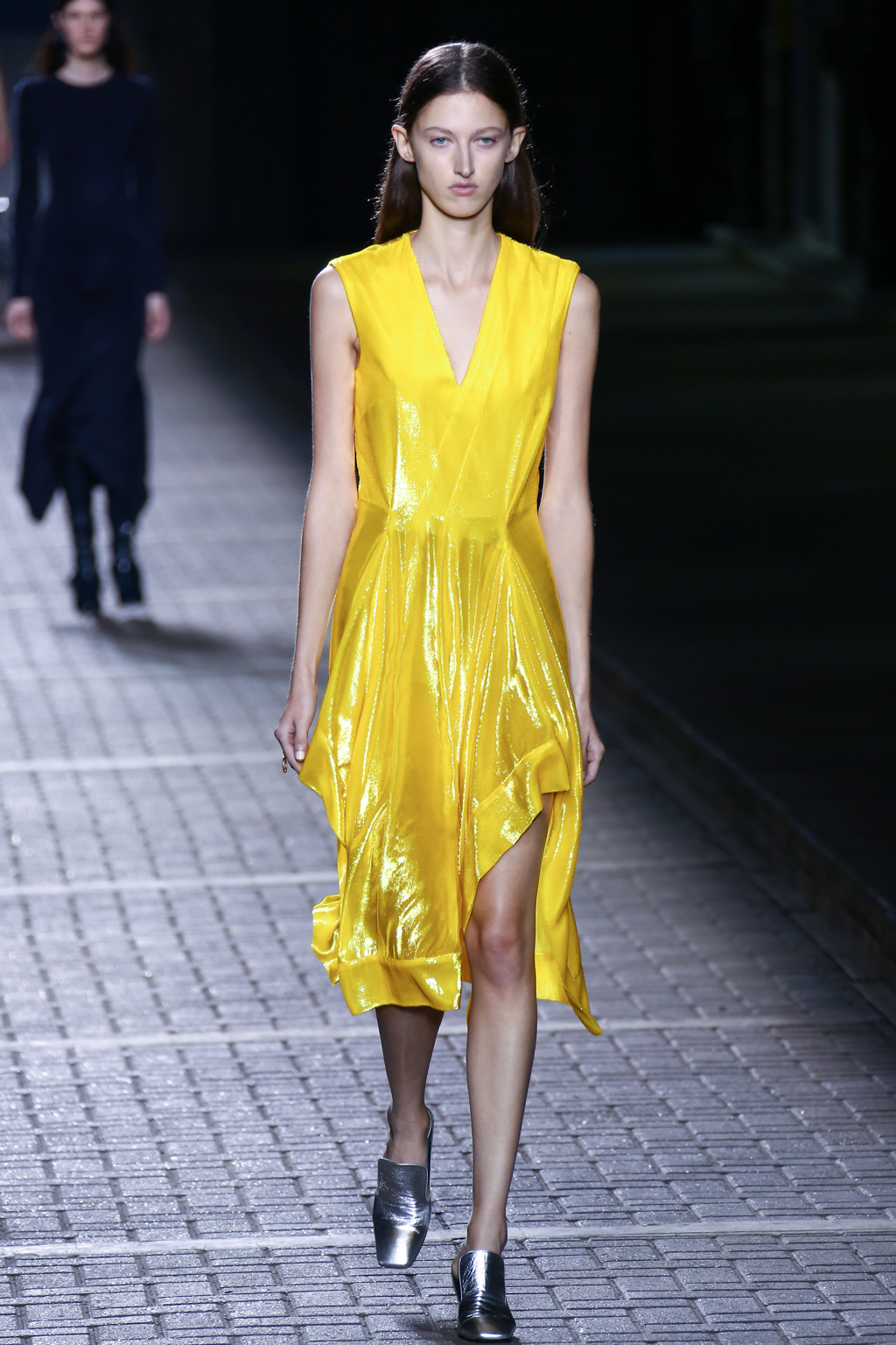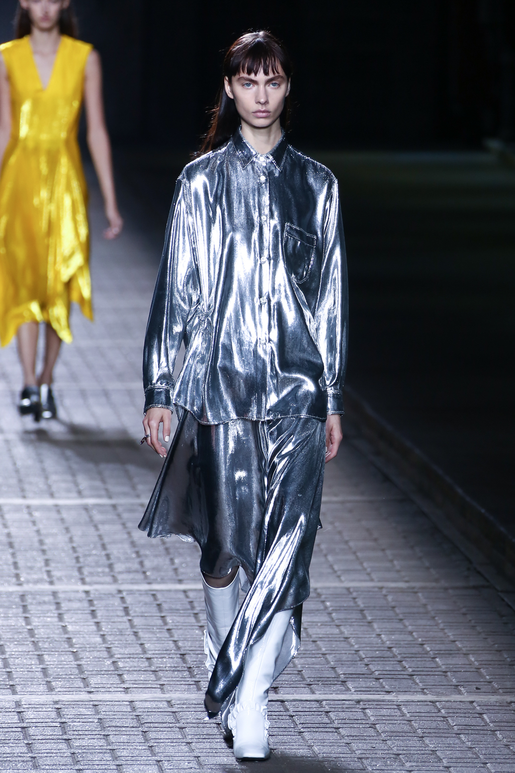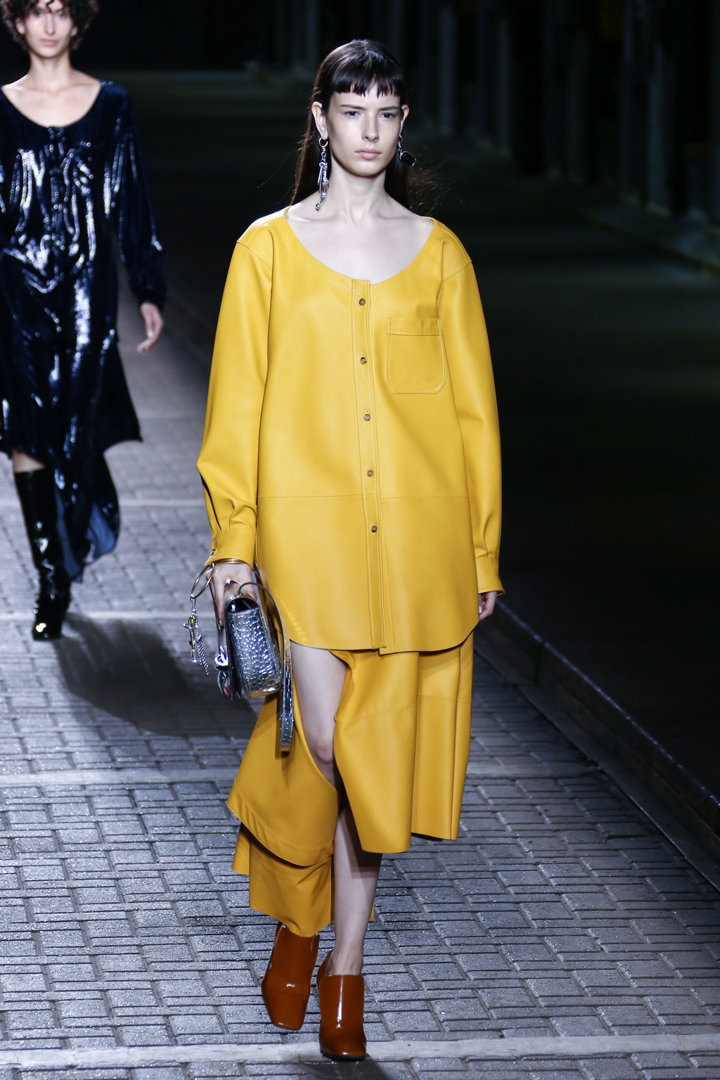 In the middle for the show, pinstripes punctuated the collection, giving a linear masculine energy, with a 1970s London flair, a nod to the brand’s roots. Sequins then burst forth in an array: bright yellow dresses and trenches utilising blues, bright yellows, and silvers.