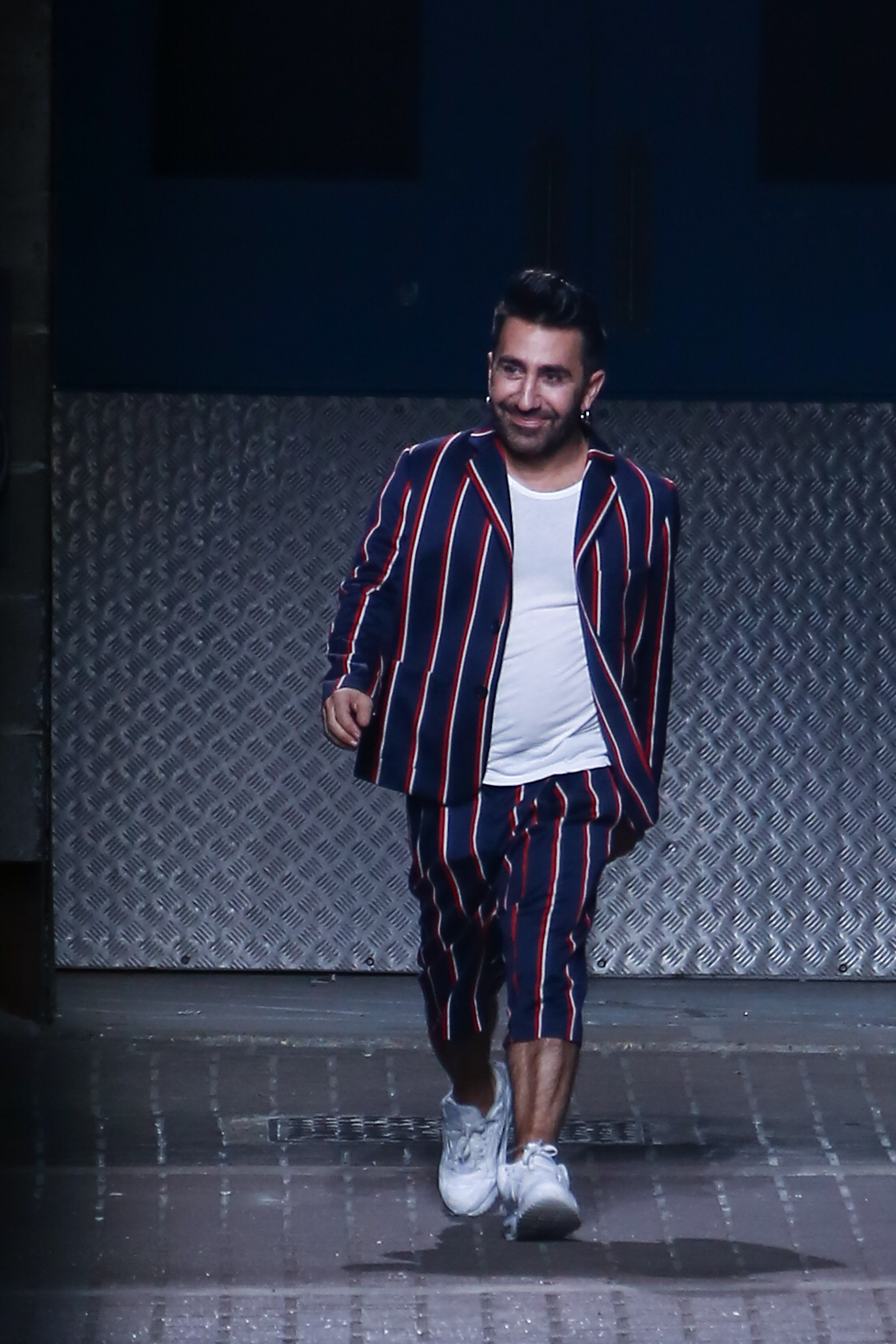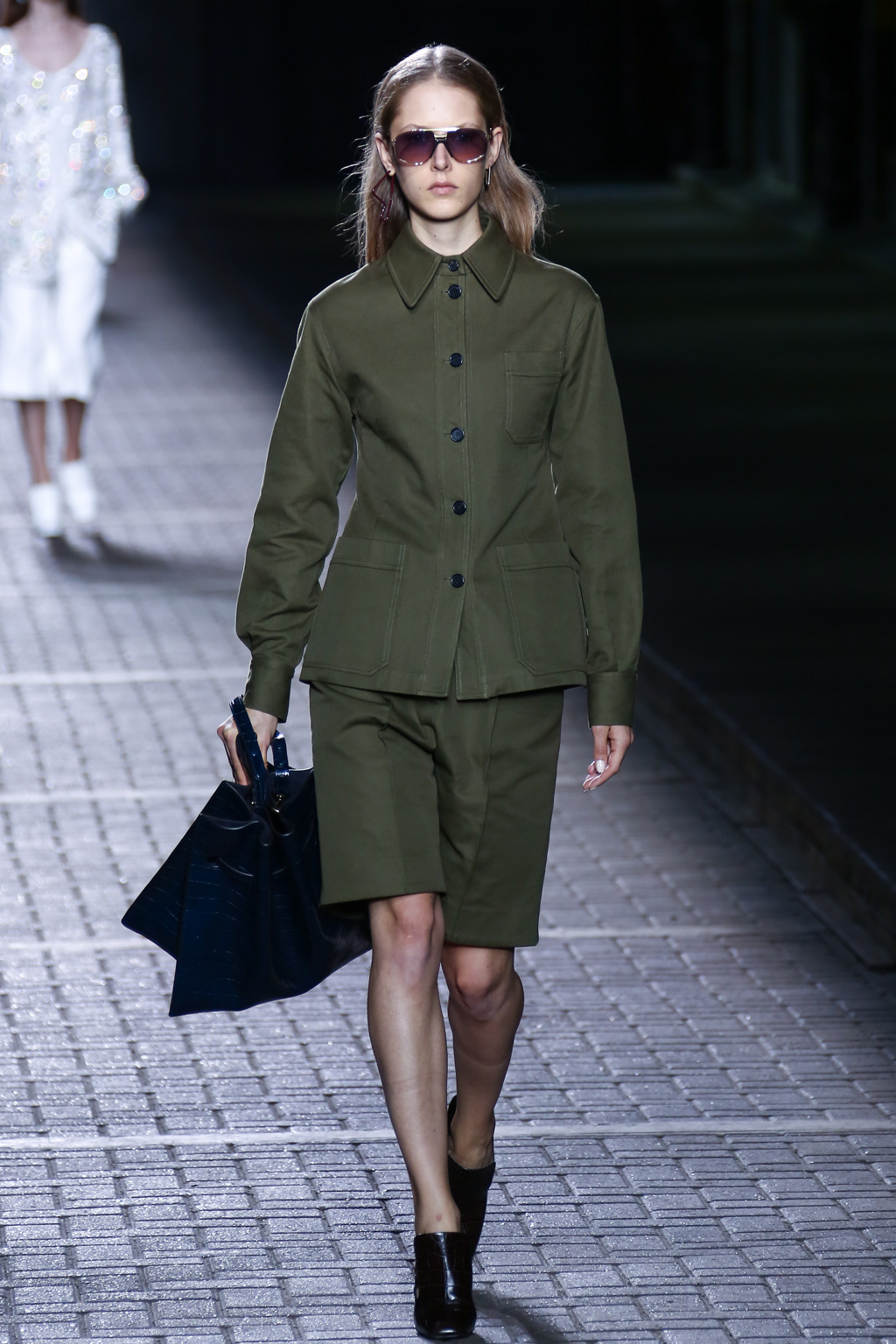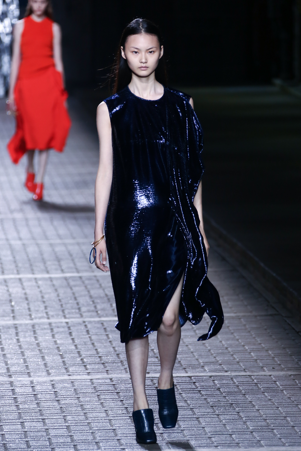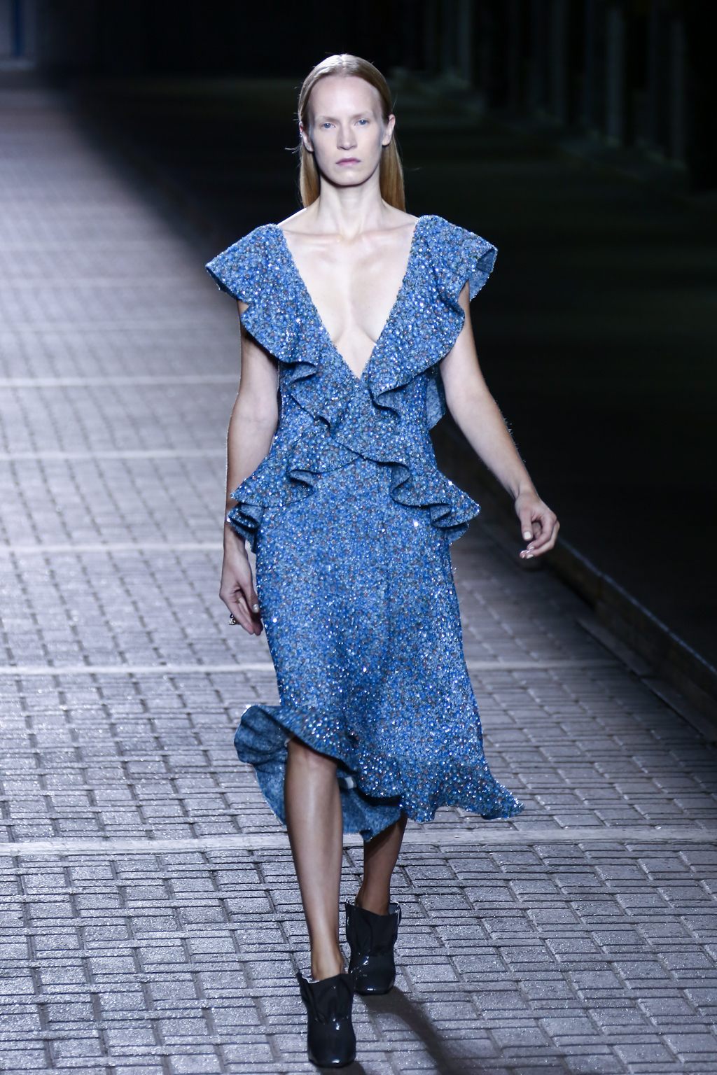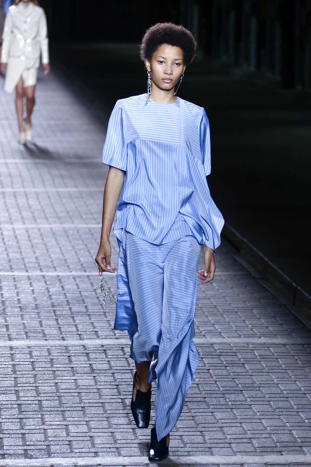 In the middle for the show, pinstripes punctuated the collection, giving a linear masculine energy, with a 1970s London flair, a nod to the brand’s roots. Sequins then burst forth in an array: bright yellow dresses and trenches utilising blues, bright yellows, and silvers.